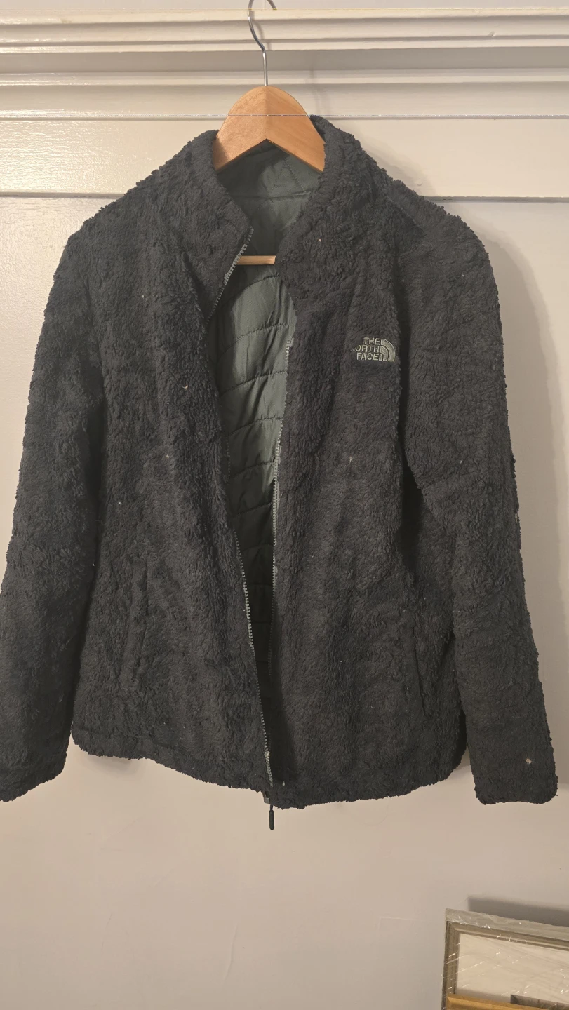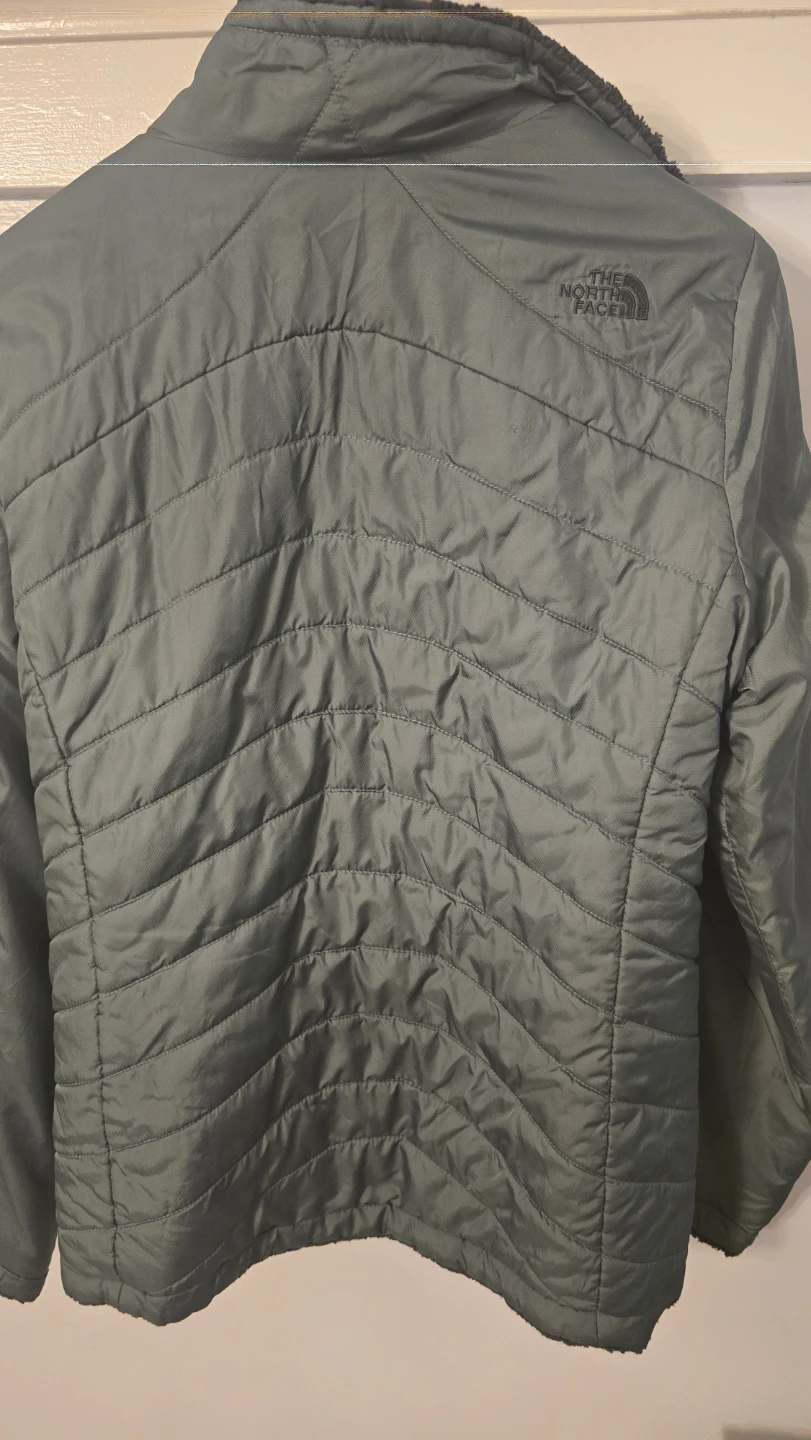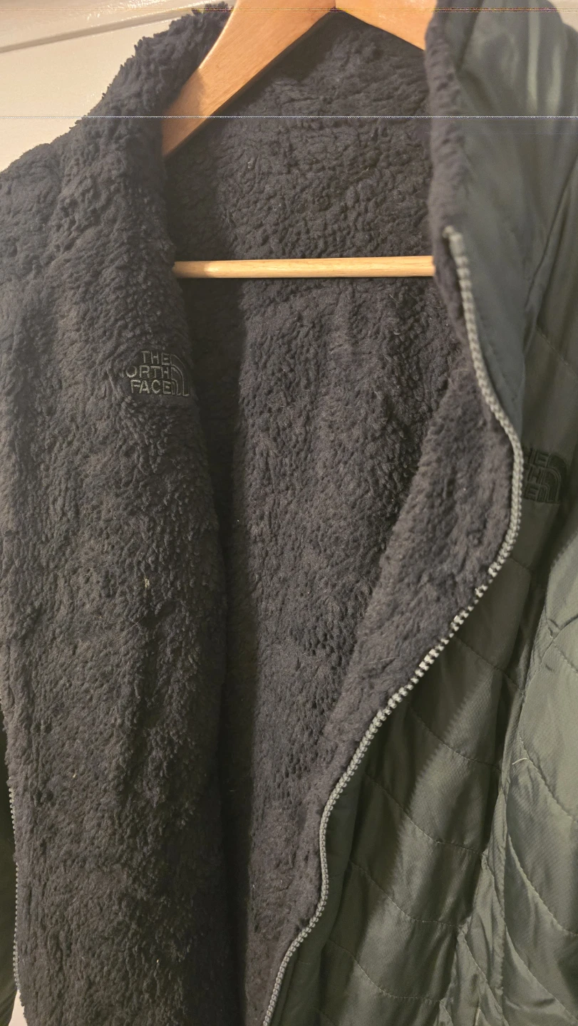 This is a reversible jacket from The North Face. One side is a quilted green color and the other is a soft black sherpa material. It is in good condition and ready for a new owner!