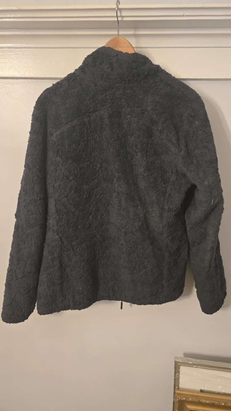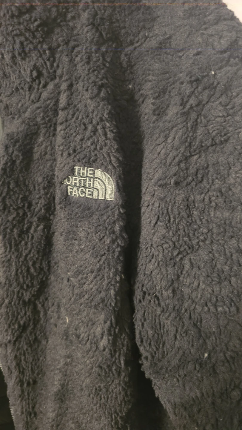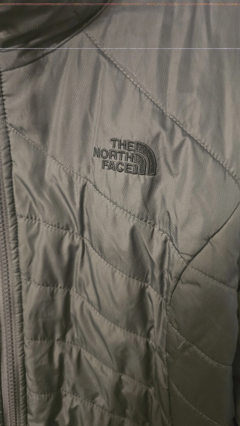 This is a reversible jacket from The North Face. One side is a quilted green color and the other is a soft black sherpa material. It is in good condition and ready for a new owner!