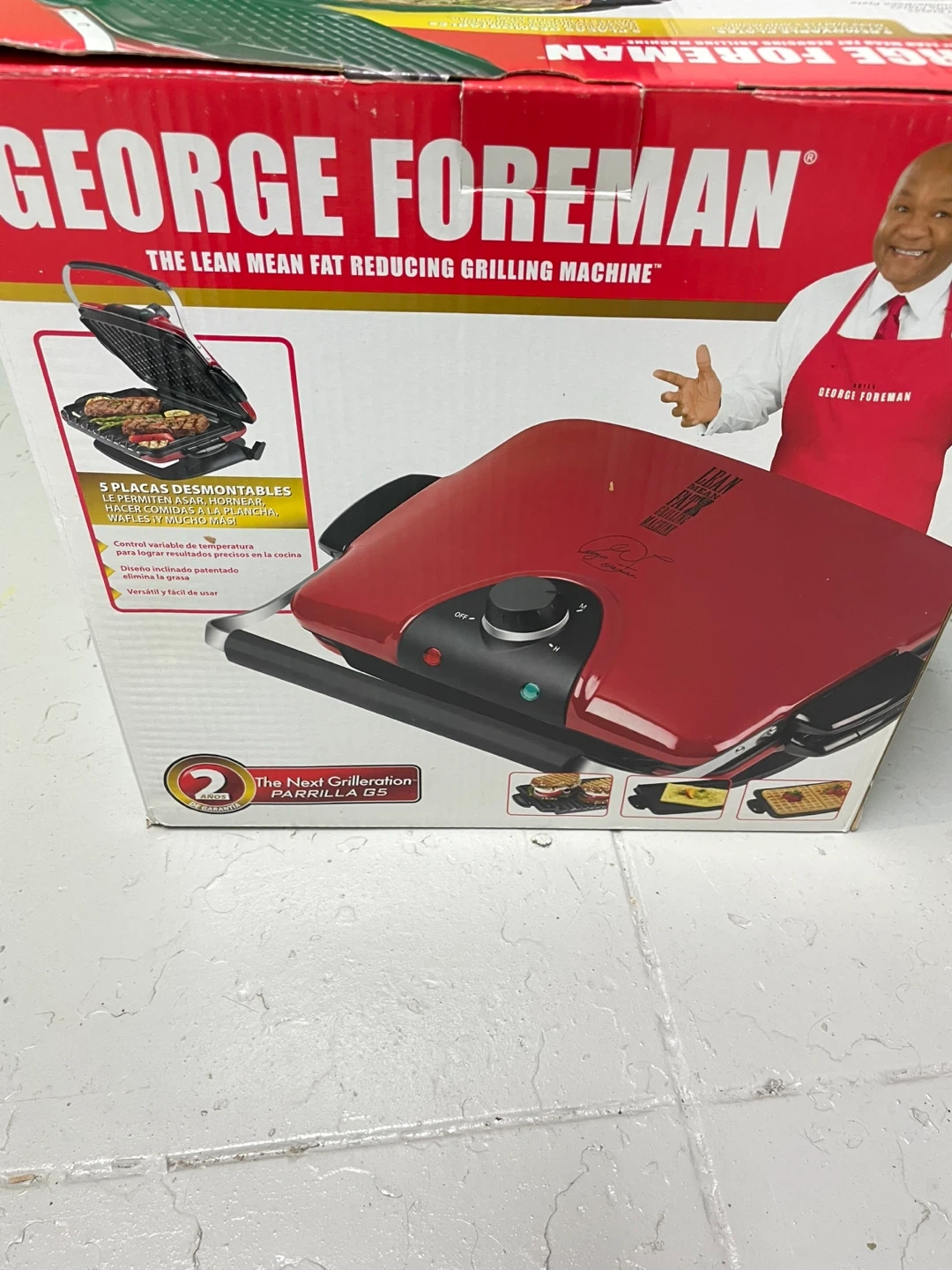 I'm selling a George Foreman grill, the Lean Mean Fat Reducing Grilling Machine! It comes with 5 removable plates and is versatile and easy to use. Also included is the instruction manual. It's in great condition and ready for your next grilling adventure