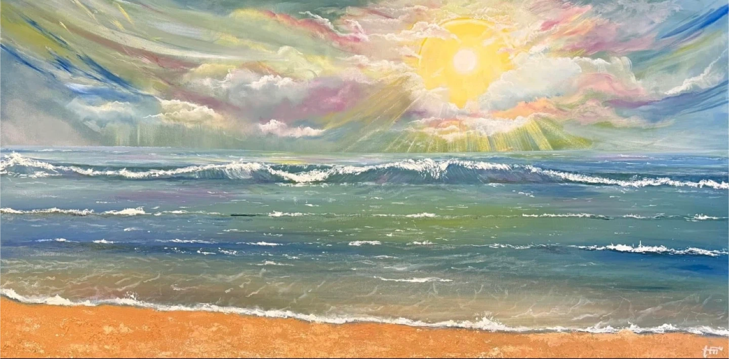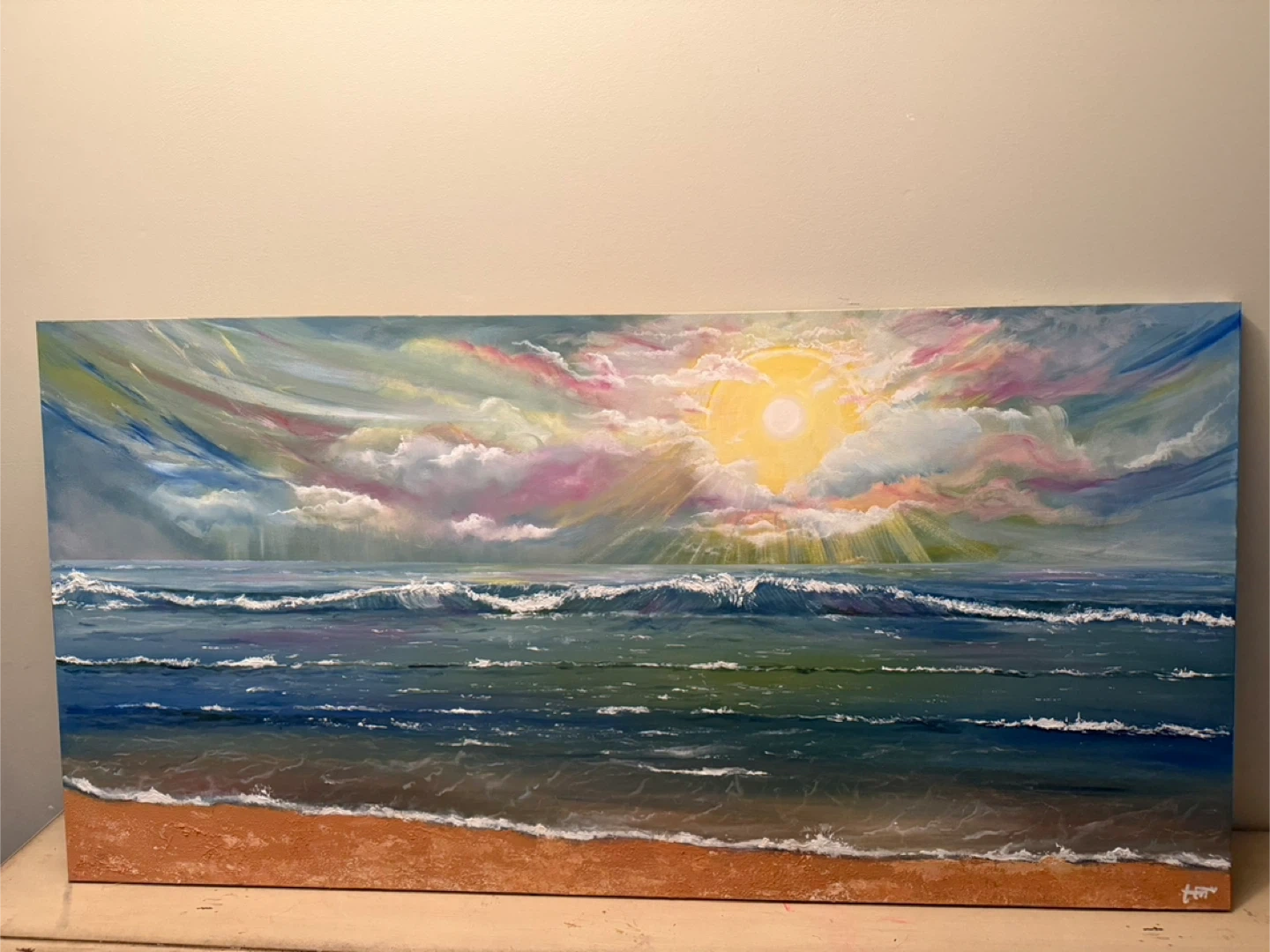over a serene beach scene. The waves and sand are textured with acrylic modelling paste adding a tactile dimension to the piece. This is not a print. Artist signature on bottom right.