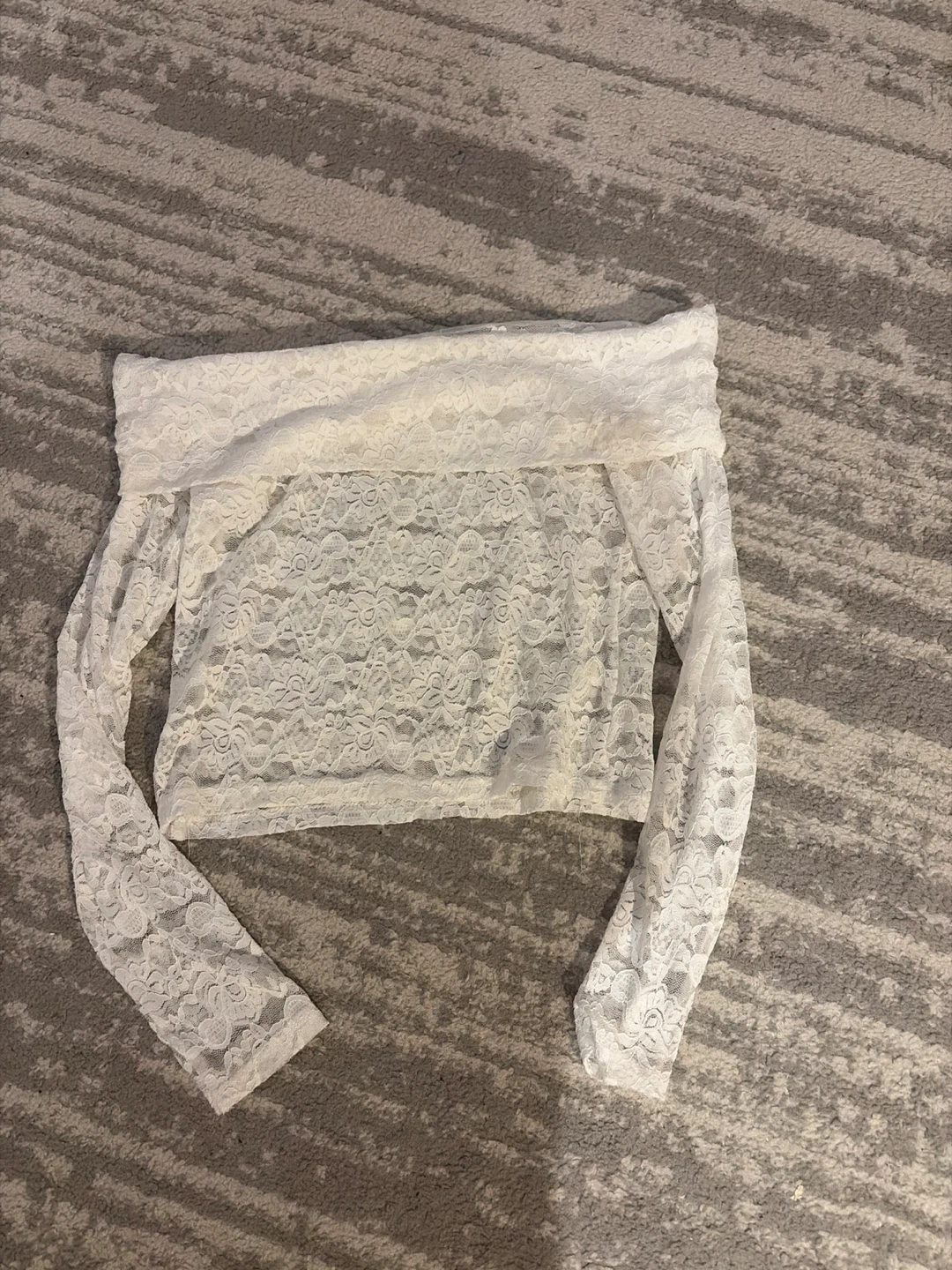 Here's a lovely white lace top! It features an off-the-shoulder design and long sleeves. Perfect for dressing up or down! I bought it for a speech and only wore it once, I simply dont need it anymore. I originally got it from Ardene for 35$ and its a size small!