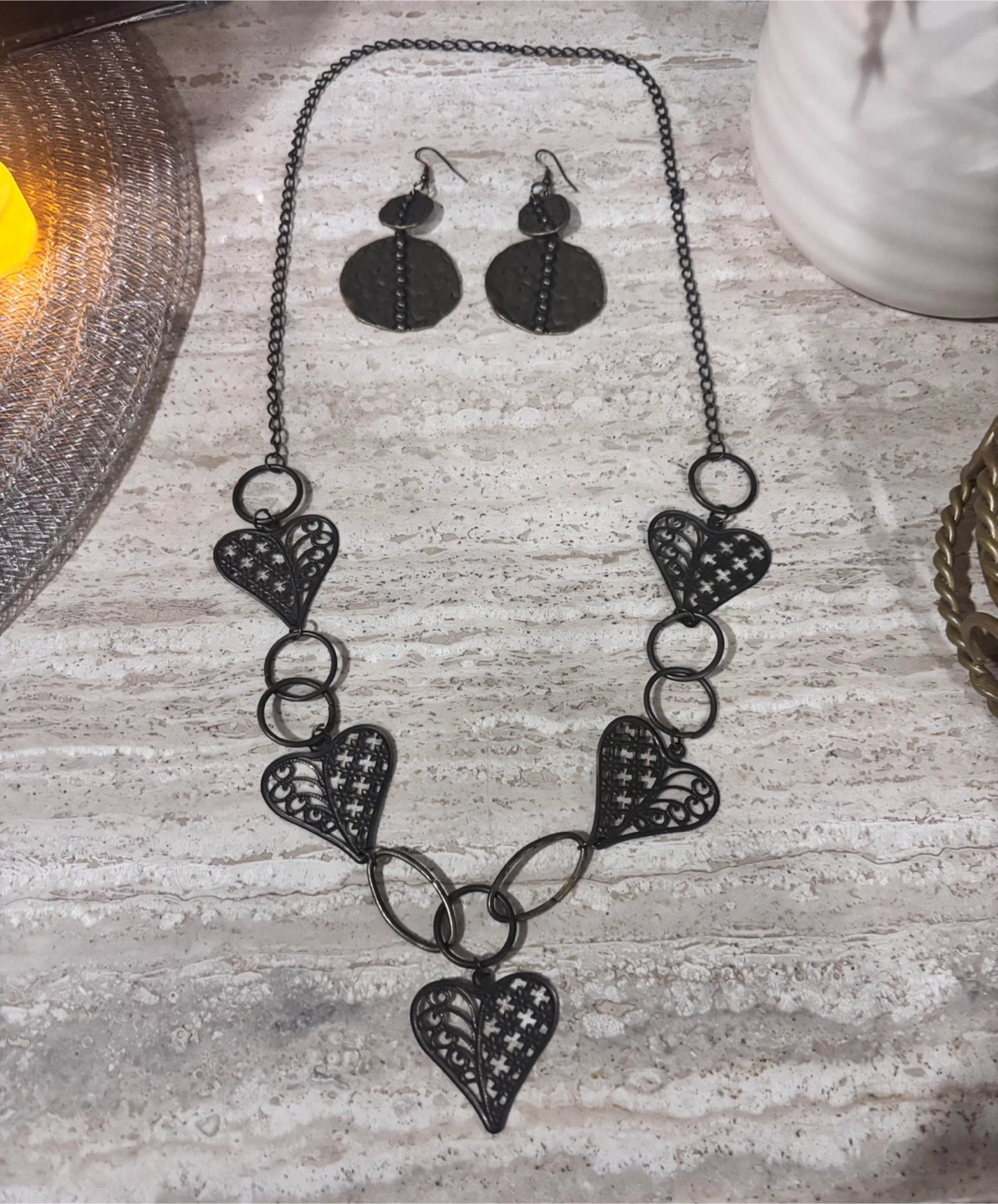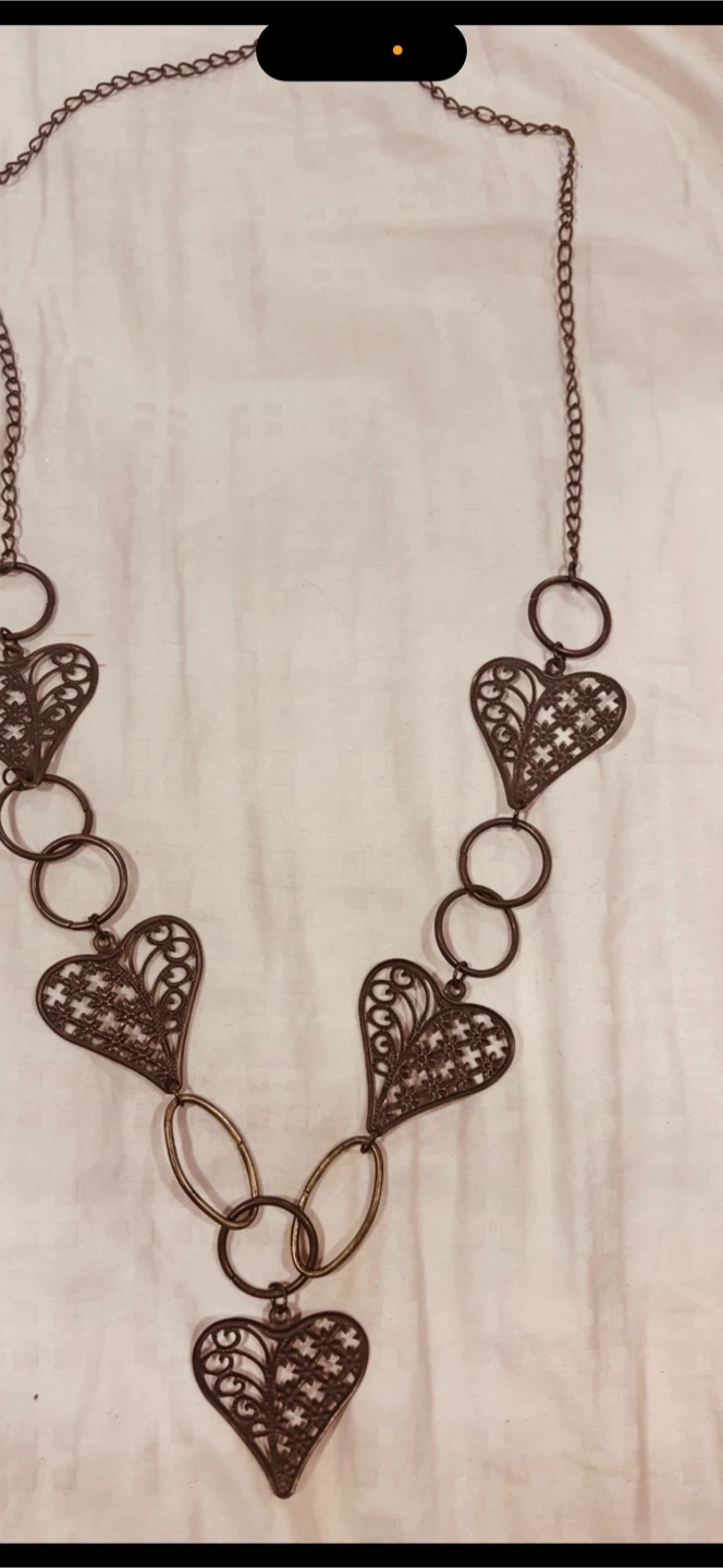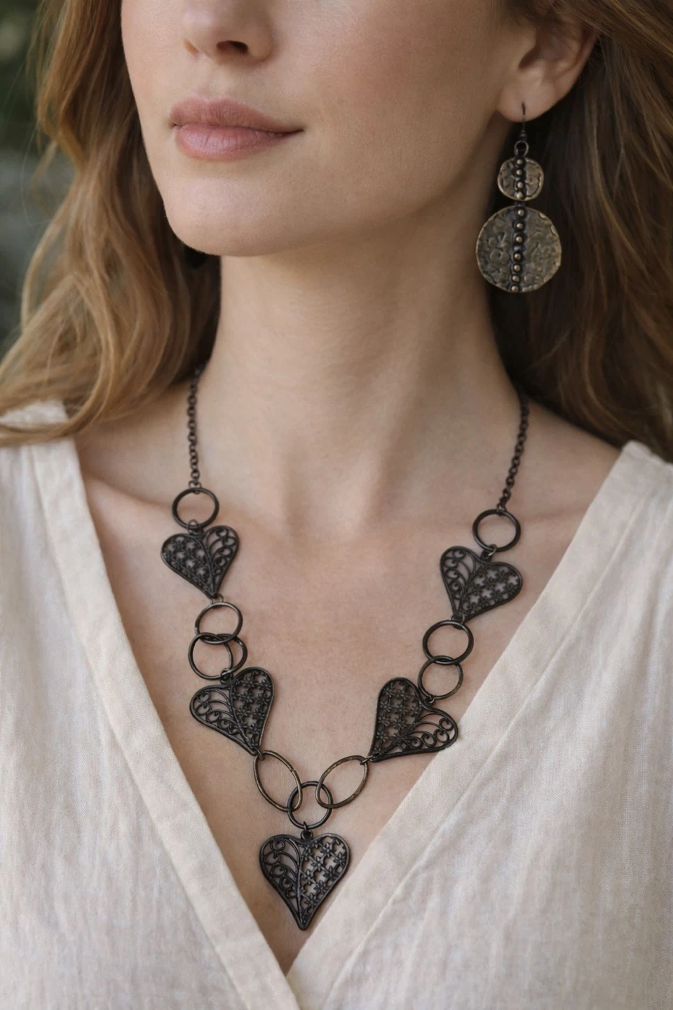 Beautiful bohemian-style jewelry set featuring a bold statement necklace and matching drop earrings. This artisan-inspired set has a rustic, oxidized metal look with intricate heart filigree details and hammered textures that give it a handcrafted, boutique feel.