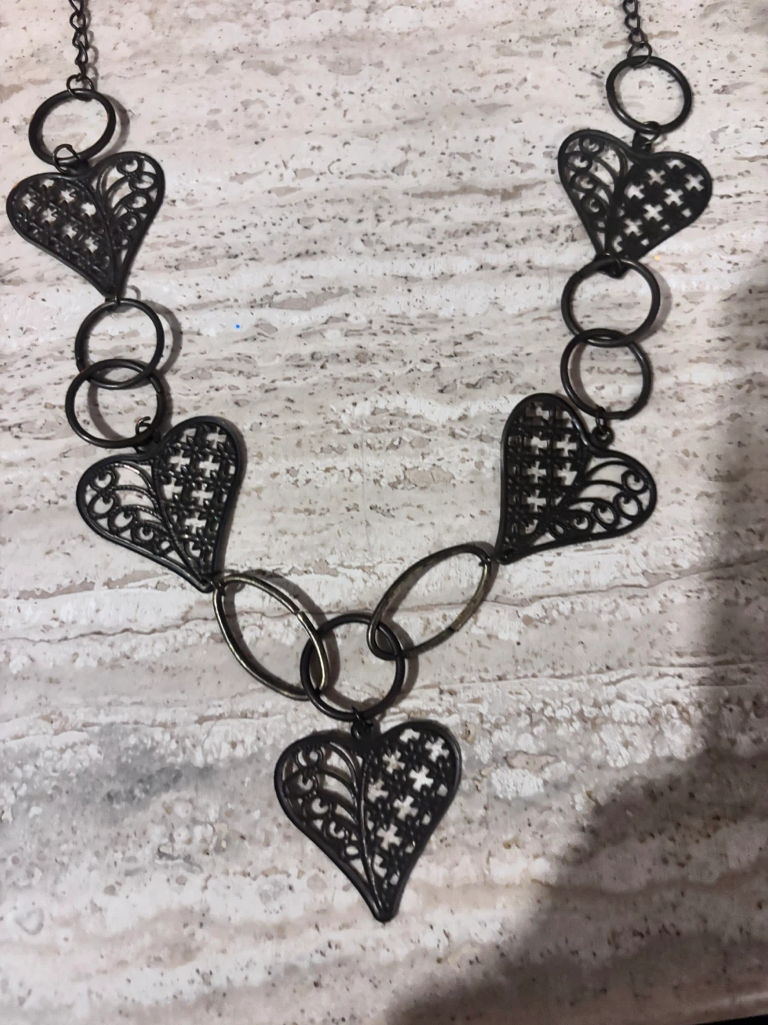 Statement necklace with linked rings and decorative heart charms