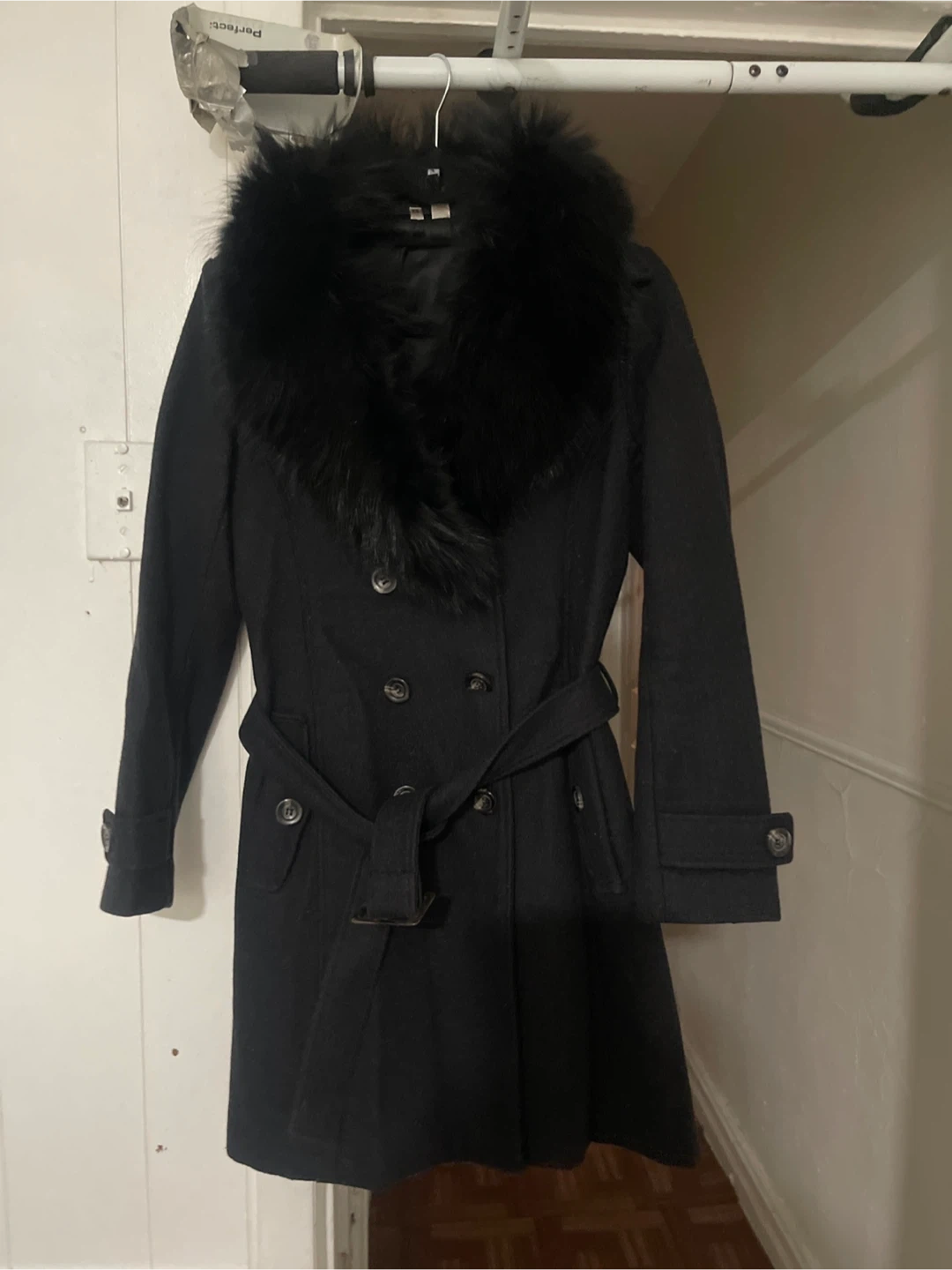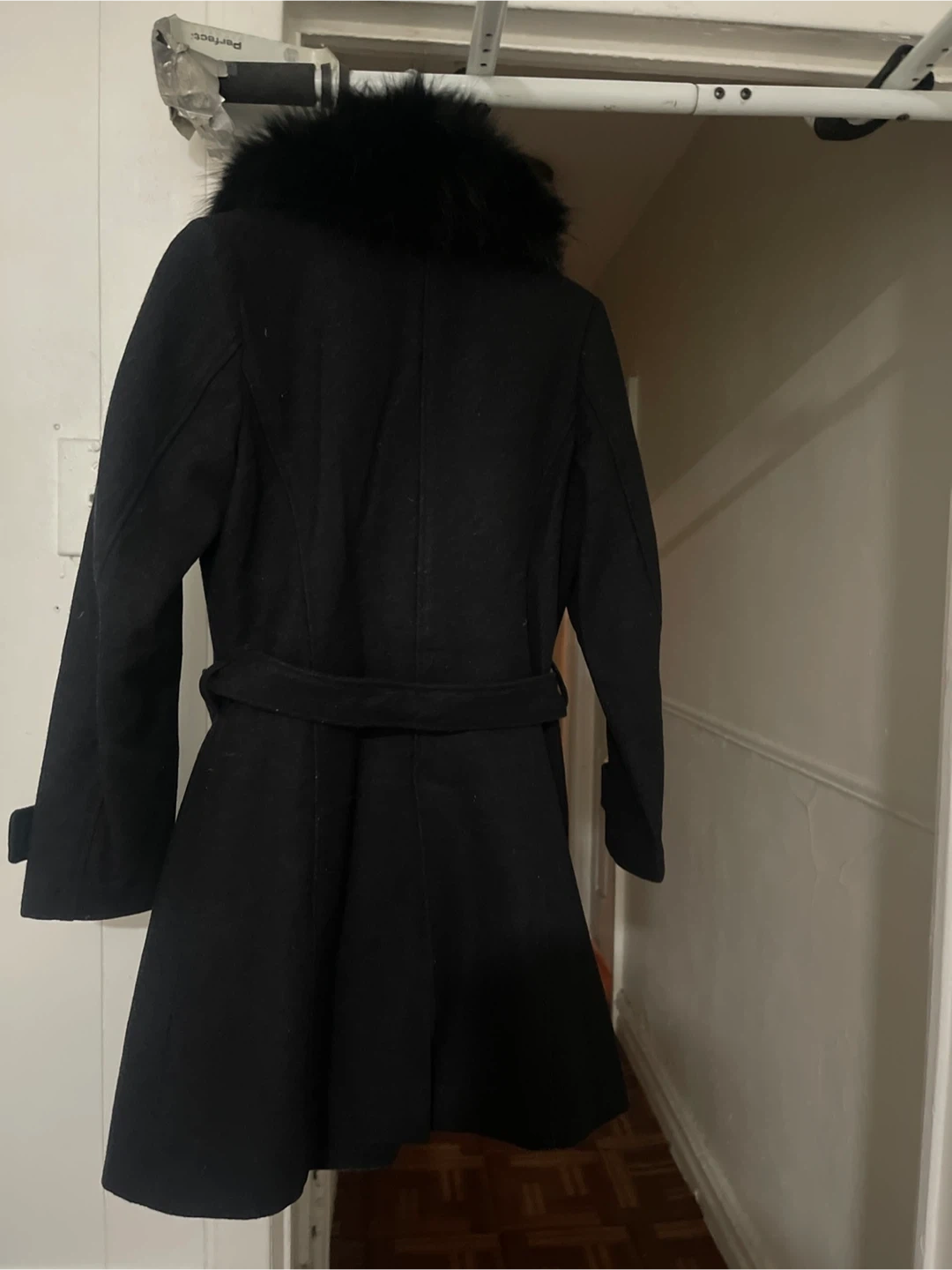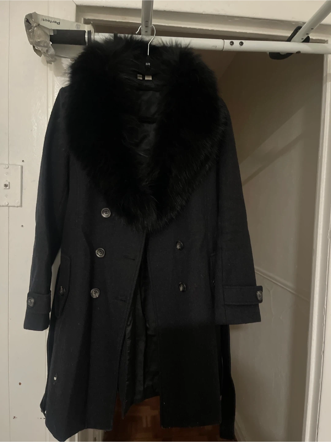 Selling a stylish H&M black wool blend coat in size 6! It features a faux fur collar and a belted waist, perfect for staying warm and fashionable. The coat is in great condition and ready for a new owner