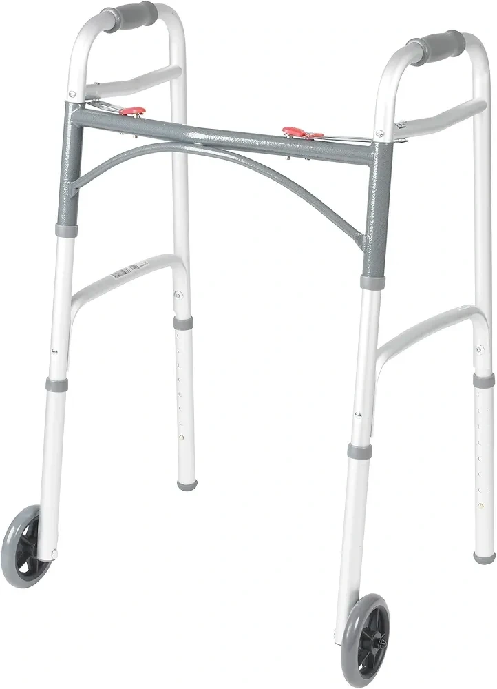 Selling a 2-wheeled walker in silver. It's in great condition and ready to assist with mobility. It features wheels for easy movement and adjustable height settings for a comfortable fit. Perfect for anyone needing a little extra support!