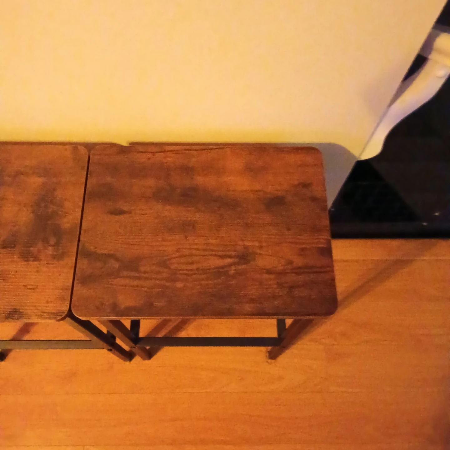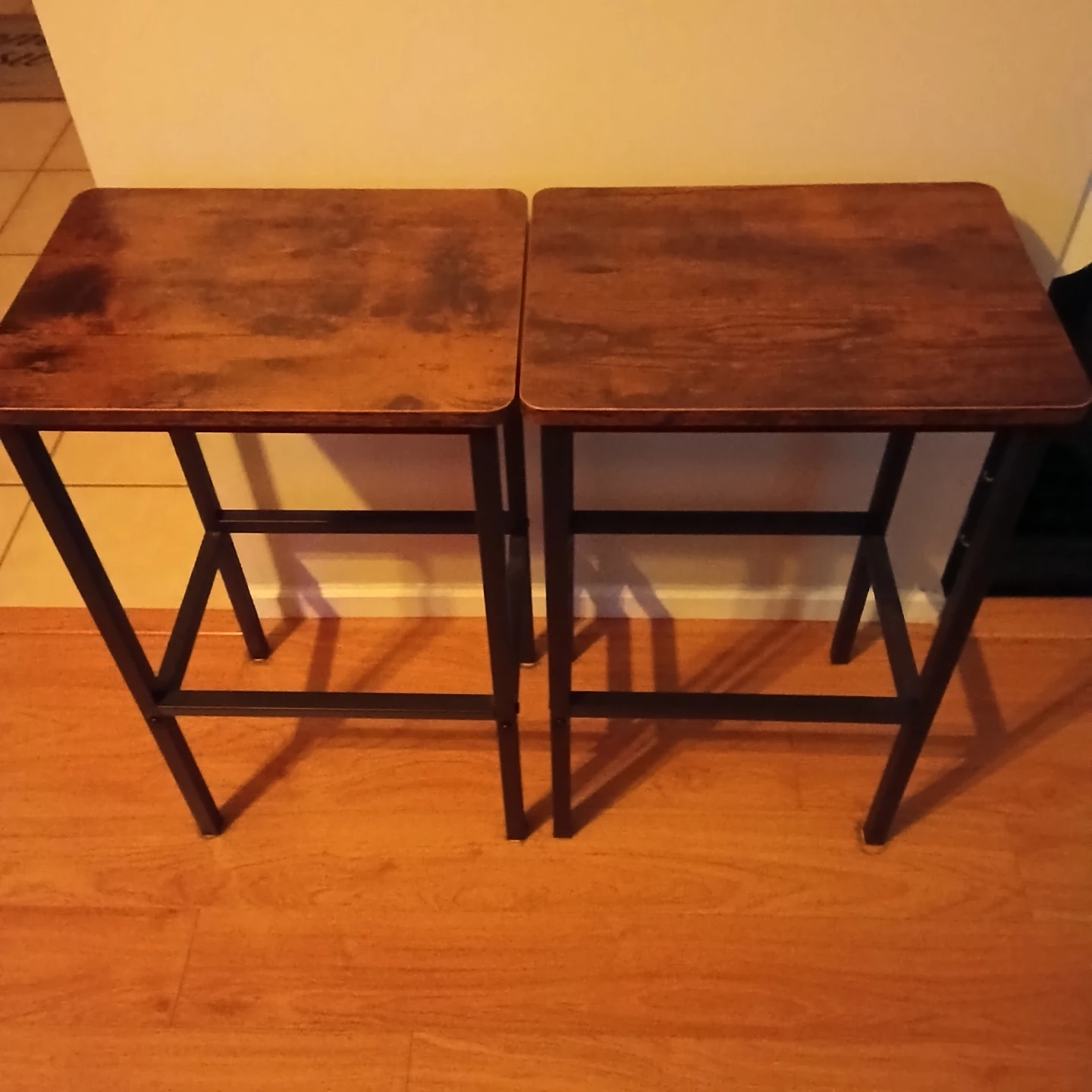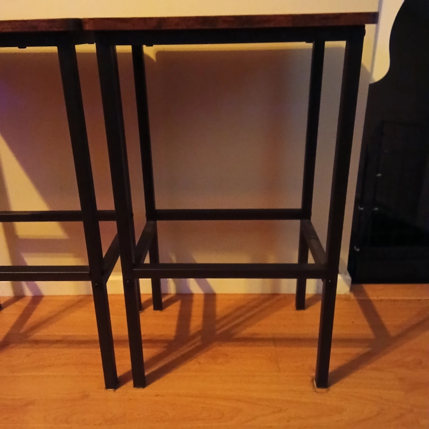 Selling a set of two lightly use, spare bar stools. They have a rustic, industrial brown finish and black steel frame. Great for a kitchen breakfast bar or dining area. Dimensions are 15.7" x 11.8" x 25.6" or 65 cm tall. $40 for both.