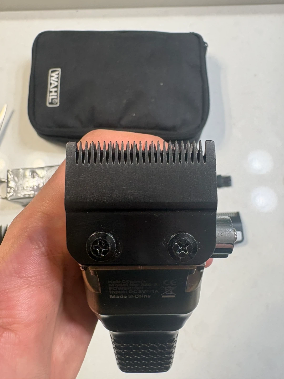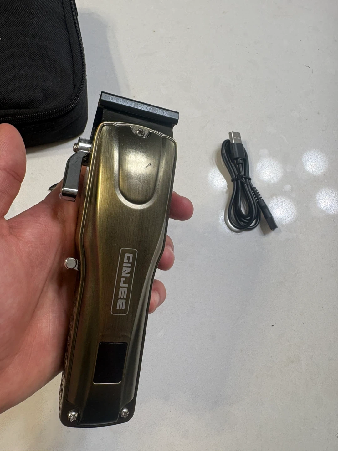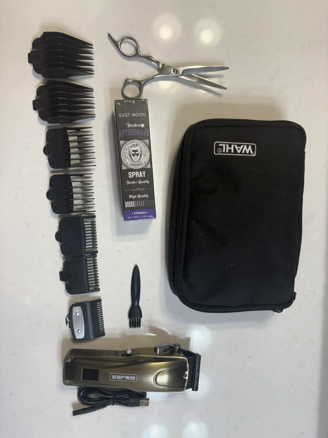 Selling a CINJEE hair clipper set in good condition! Includes the clipper, charging cable, various attachment combs, scissors, cleaning brush, and a Wahl carrying case. It also comes with a bottle of East Moon Barber's Aftershave Spray