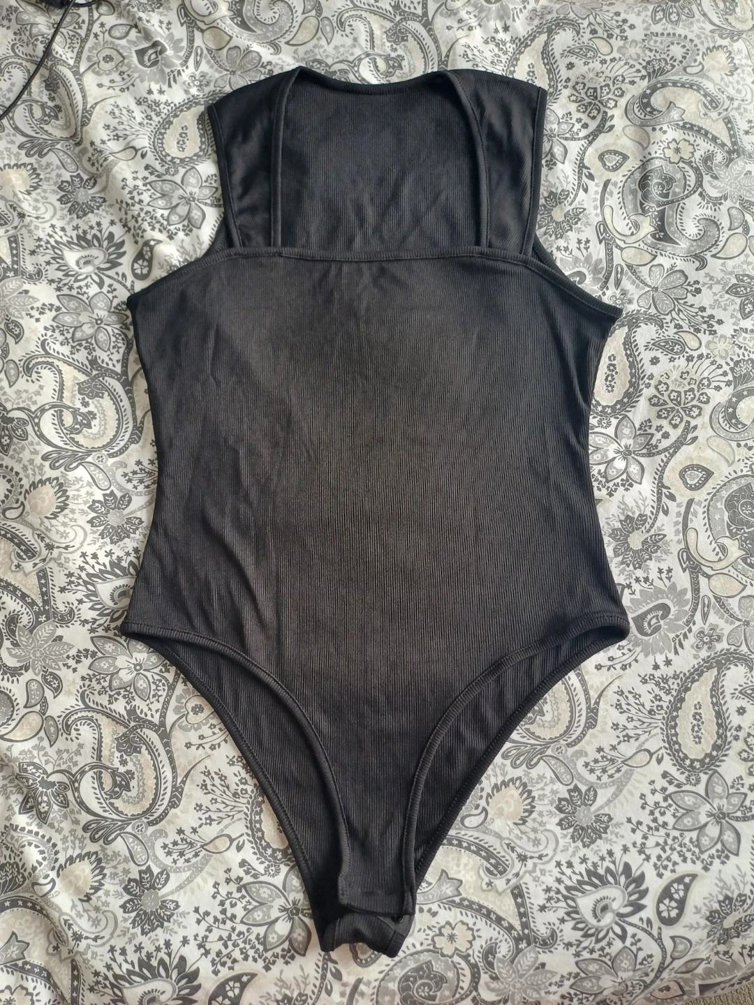 Here's a stylish black ribbed bodysuit that's perfect for layering or wearing on its own! It's in great condition and ready for a new wardrobe