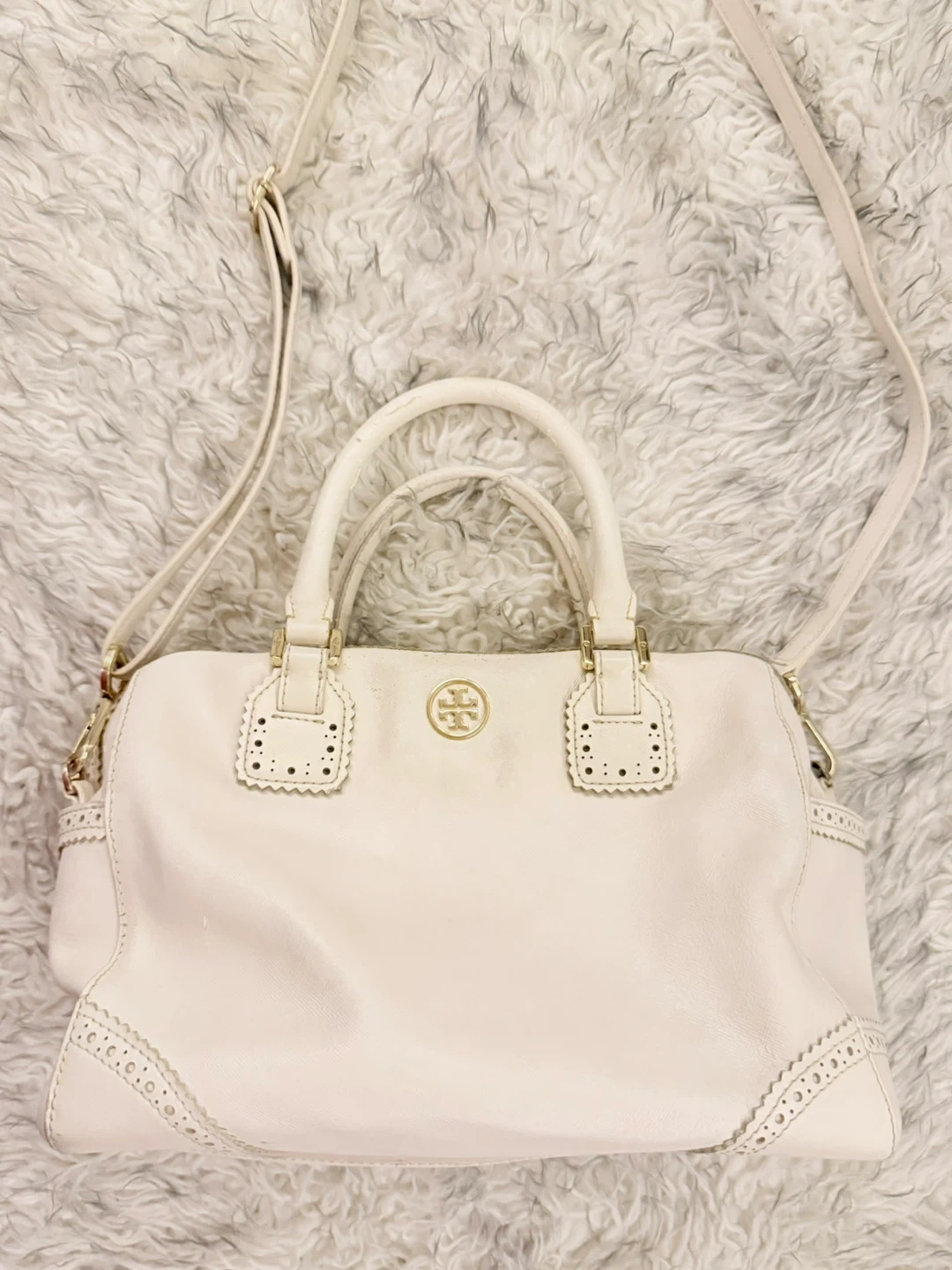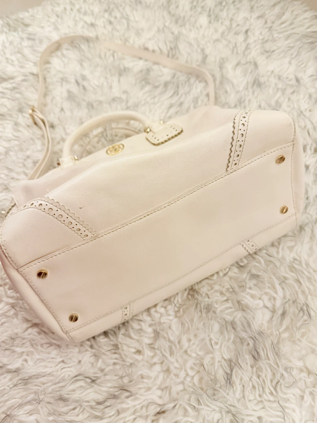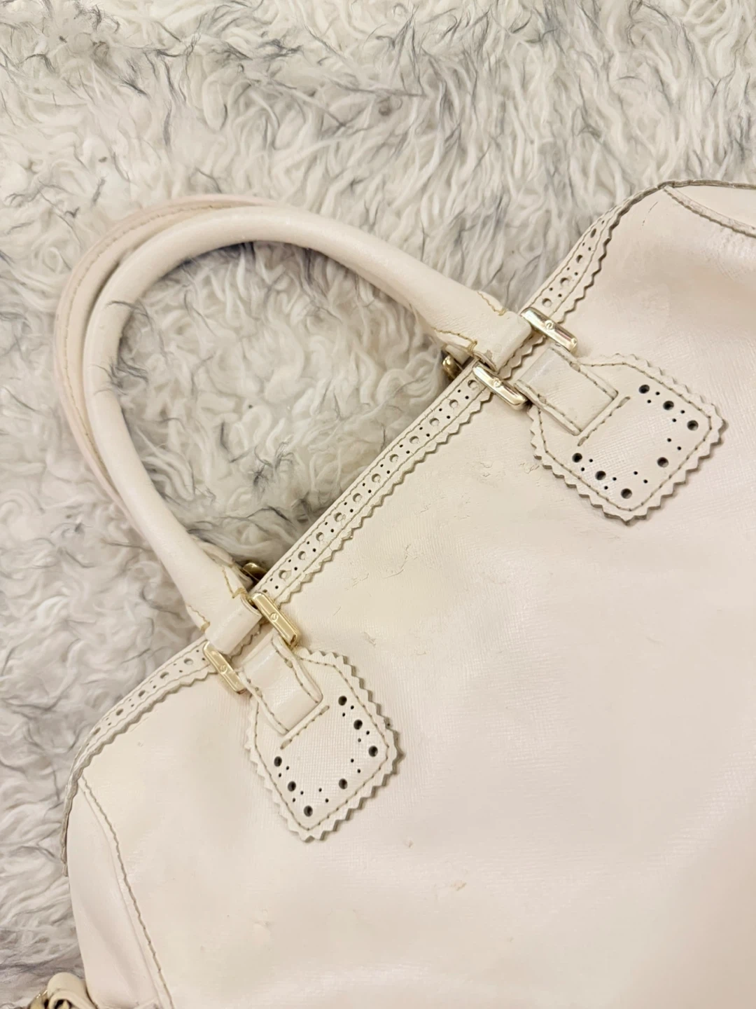Small scalloped details, side pockets, adjustable strap, and top handles.
