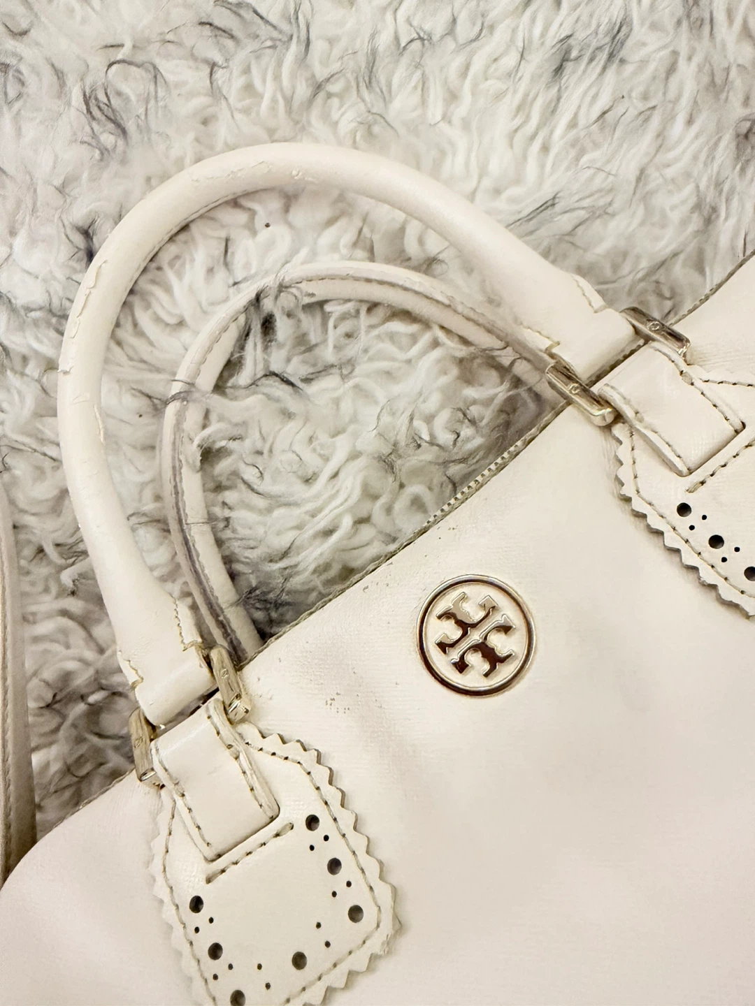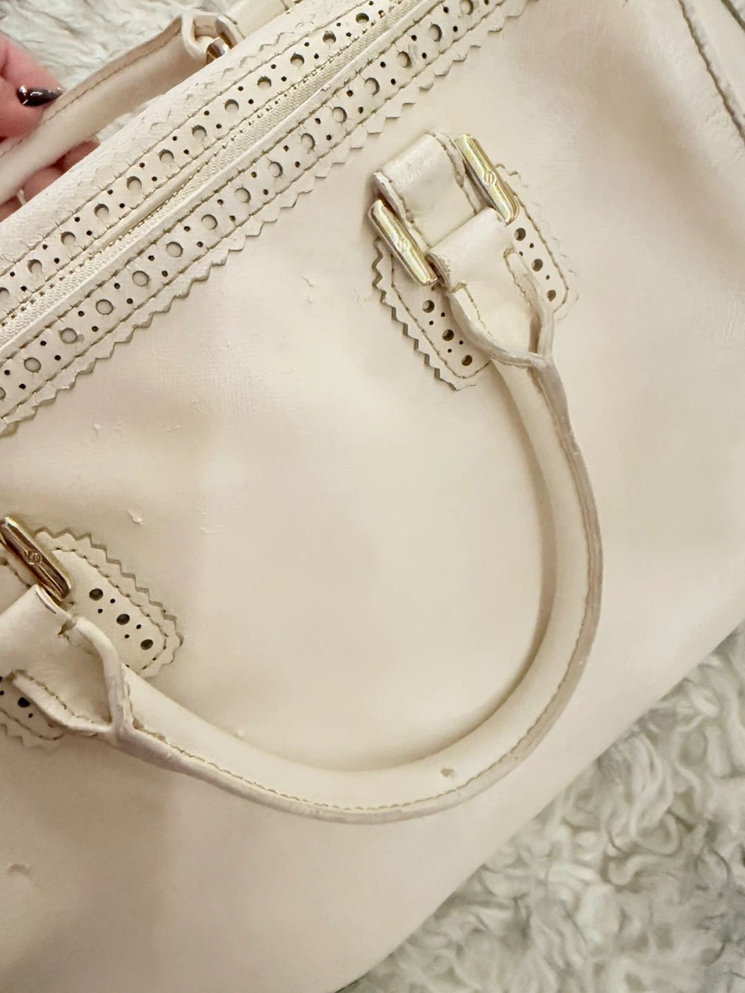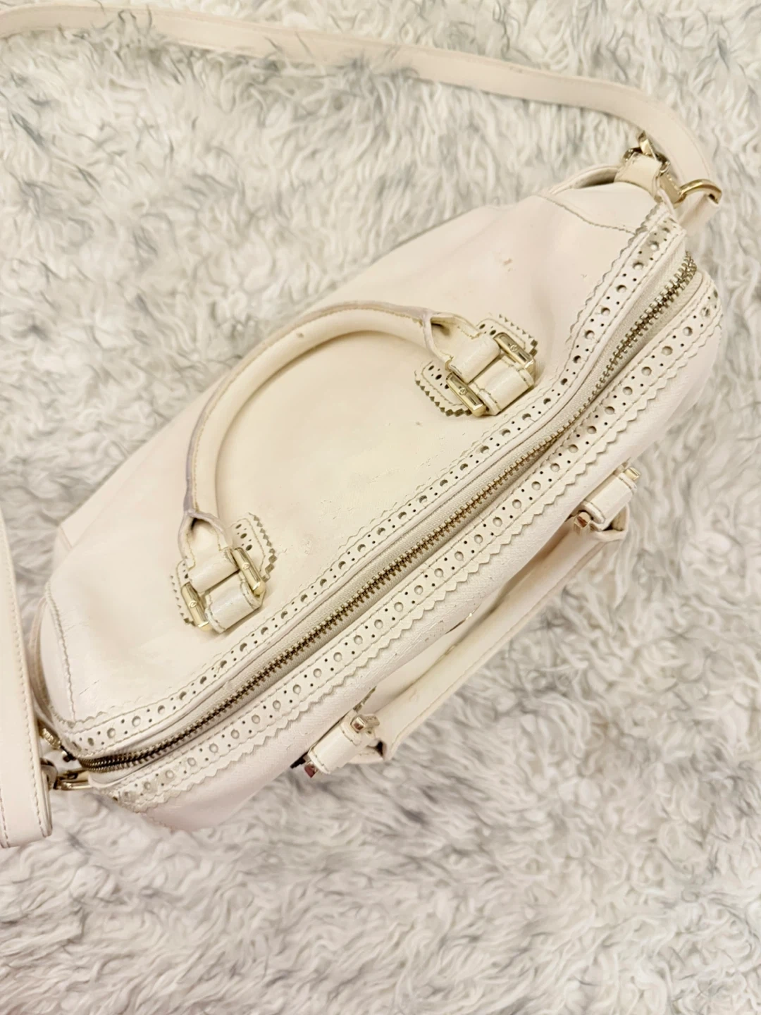 Small scalloped details, side pockets, adjustable strap, and top handles.
