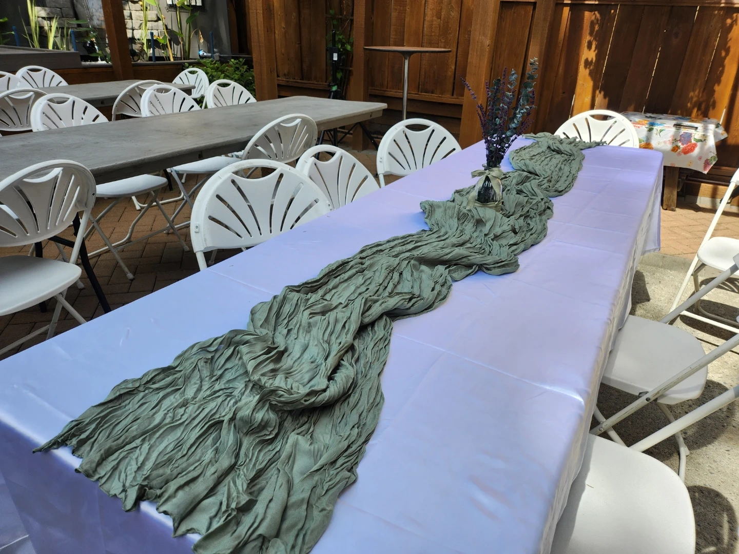 [Tablecloths only, table runners already sold] - 6 white polyester-satin table cloths 57x118 inch, fits 6ft or 8 ft rectangle tables (they are pictured at our wedding tables that were 8 ft)