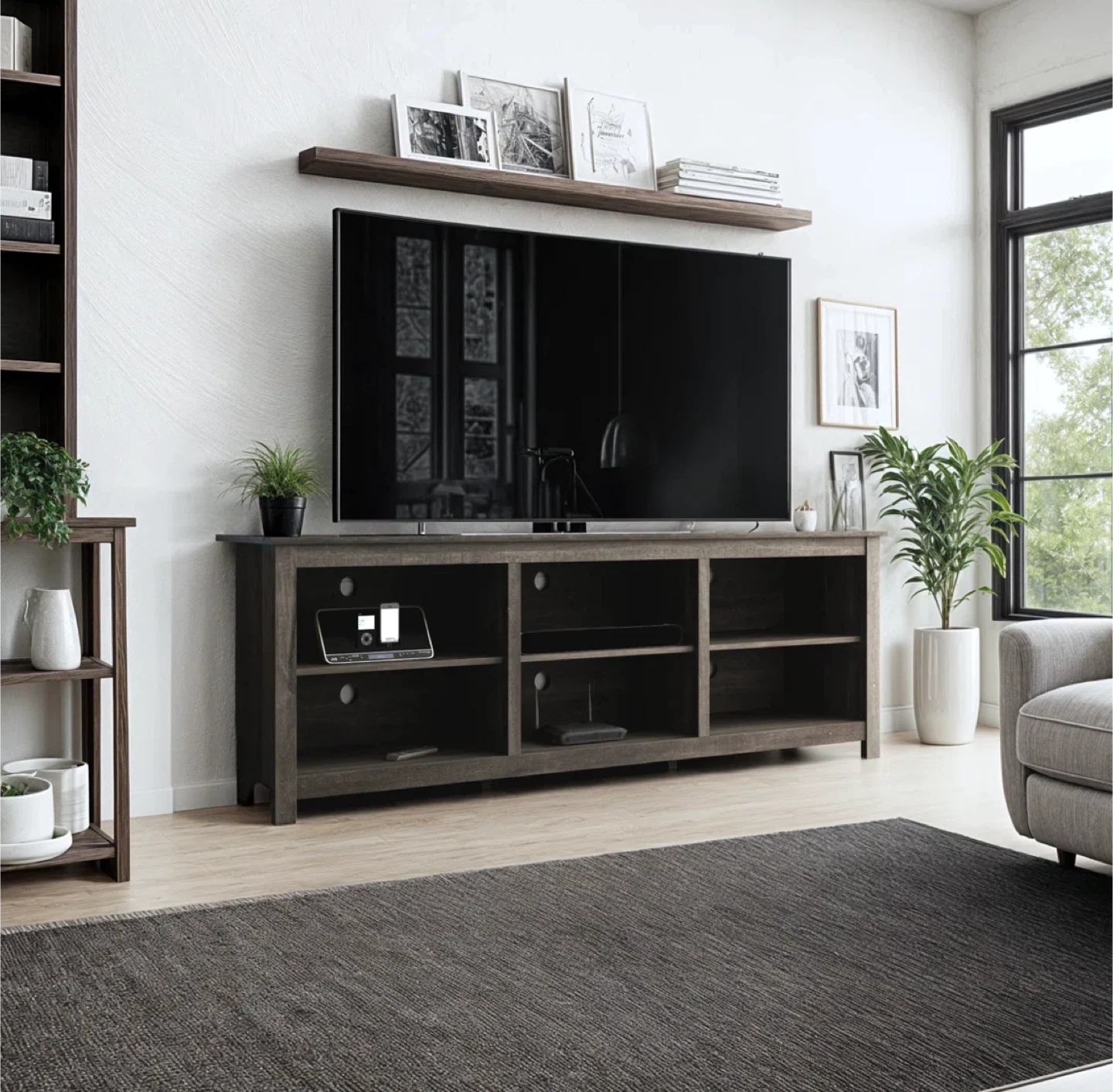 Looking to sell my Sauder TV stand. It's in great shape and ready for a new home! The dark wood finish gives it a modern look. Dimensions are approximately 70.1" x 15.6" x 24".