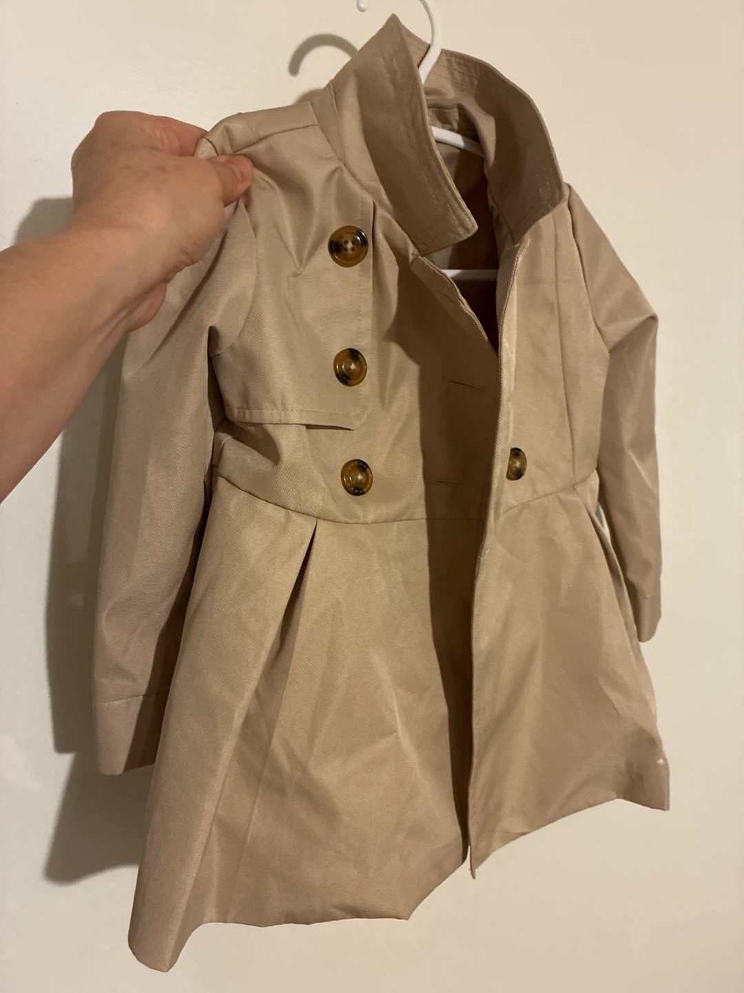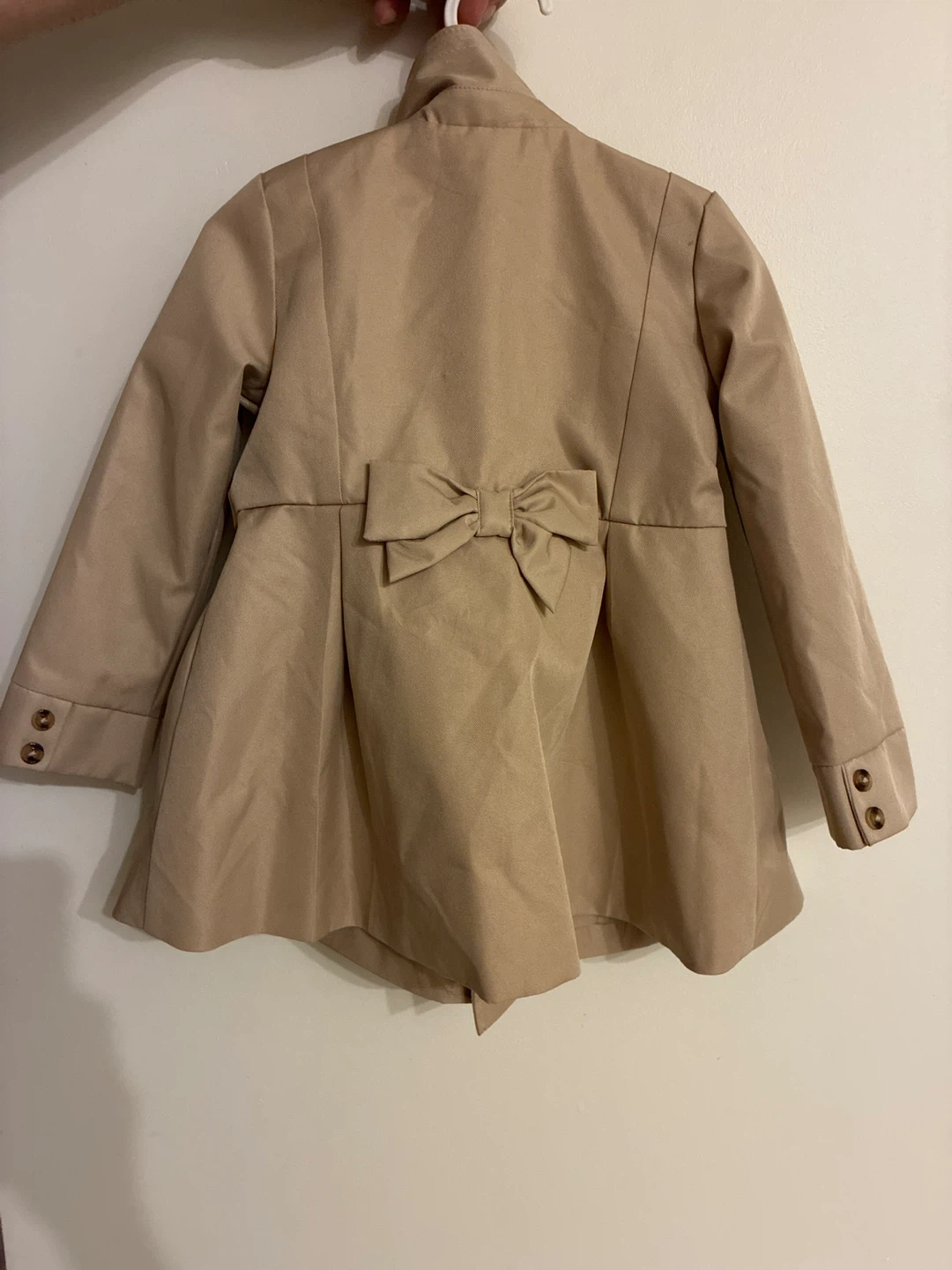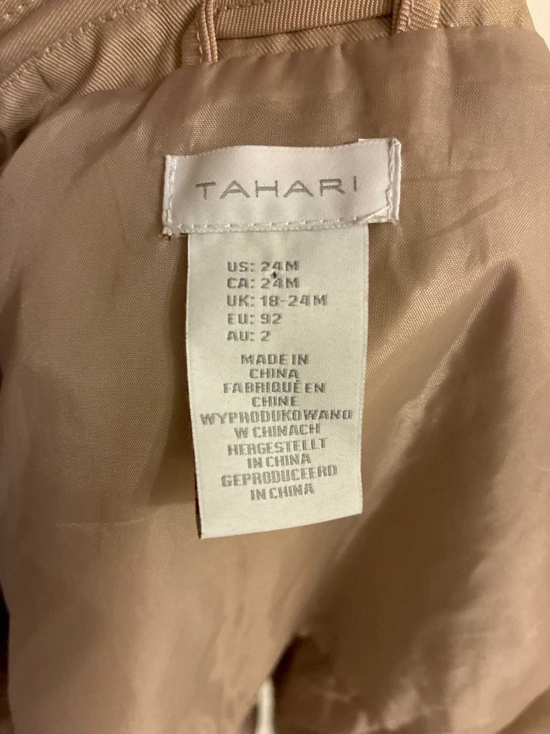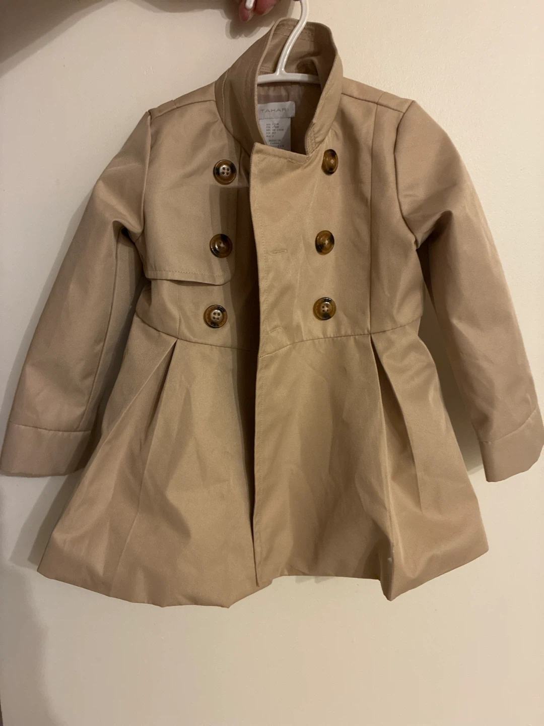 A cute Tahari trench coat for your little one! This stylish coat is in excellent condition and features a classic design with a bow detail on the back. It's a size 24M, perfect for toddlers.