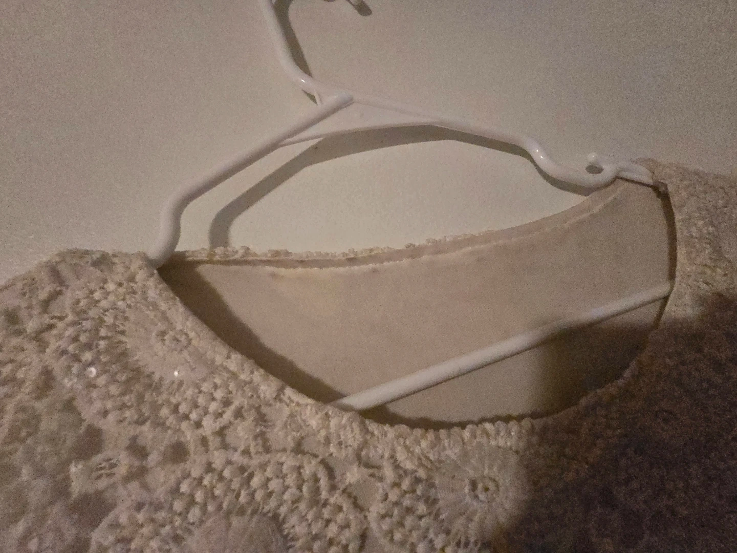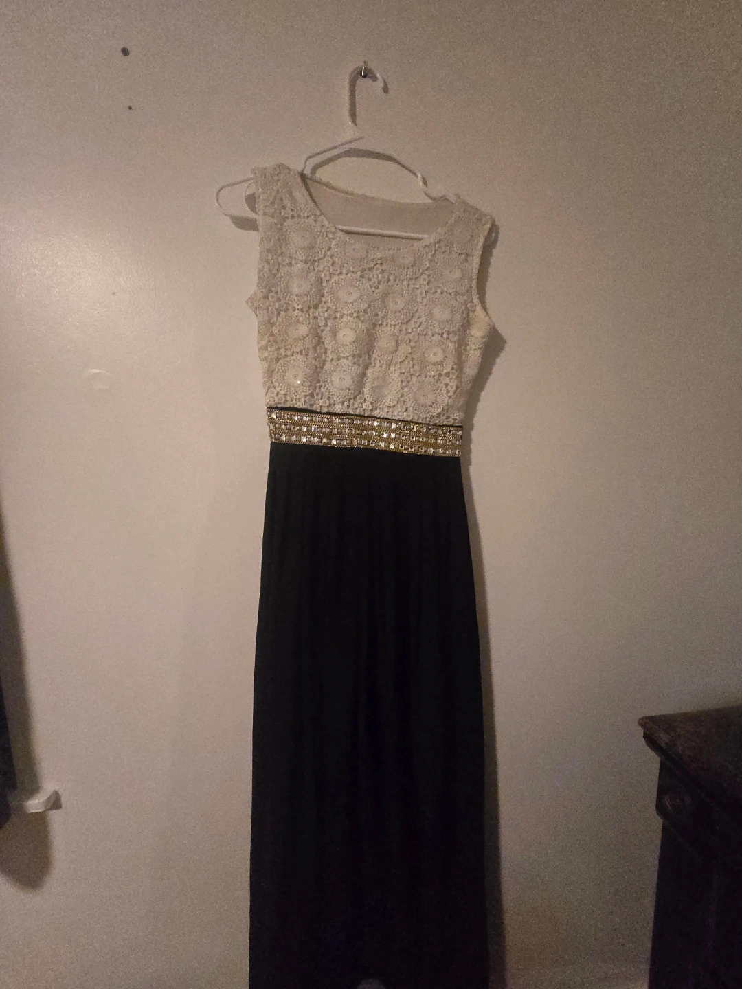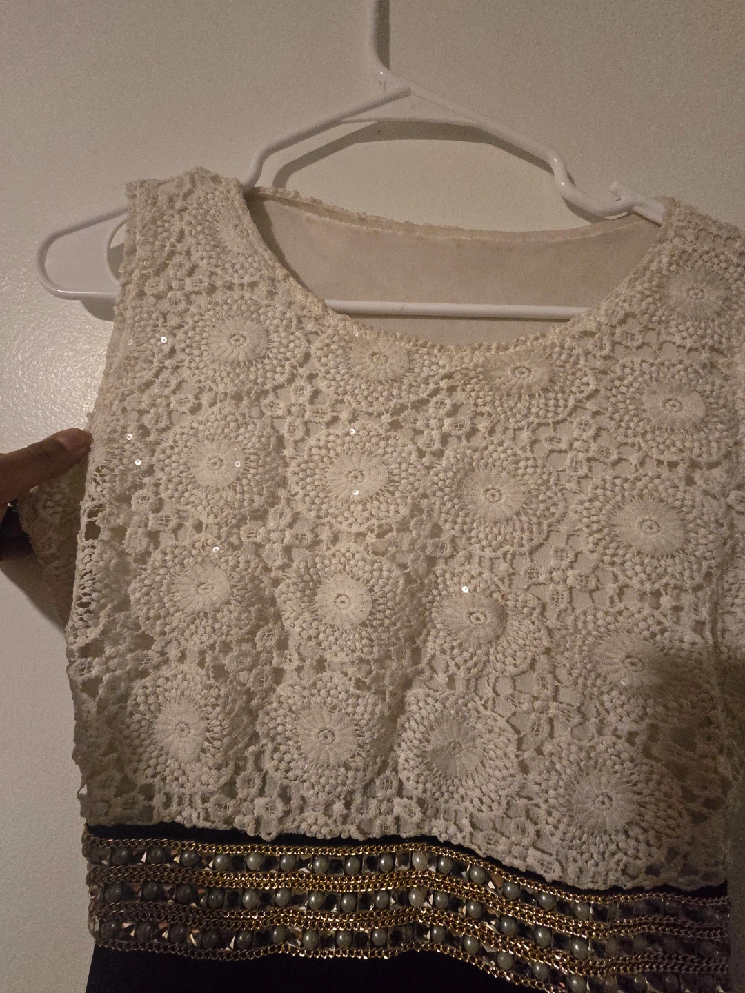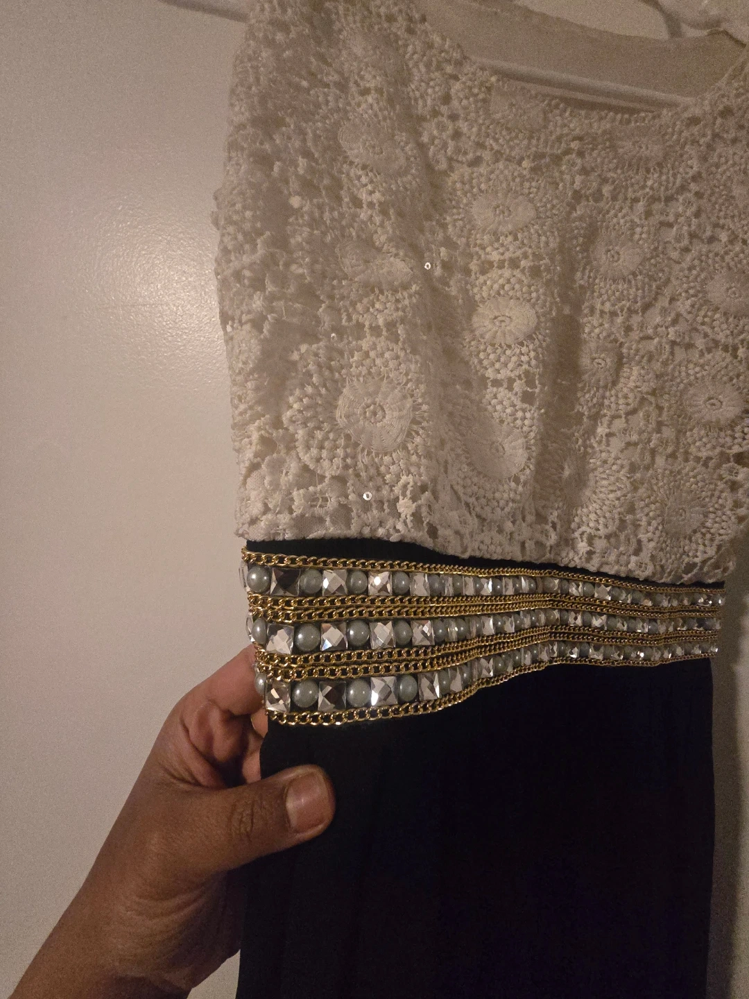Here's a lovely maxi dress with a lace top and a black skirt! The top is cream-coloured with a delicate lace pattern, and the skirt is a flowing black material. There's a decorative gold and pearl-like band at the waist adding a touch of elegance. It's in good condition and ready for a new wardrobe!