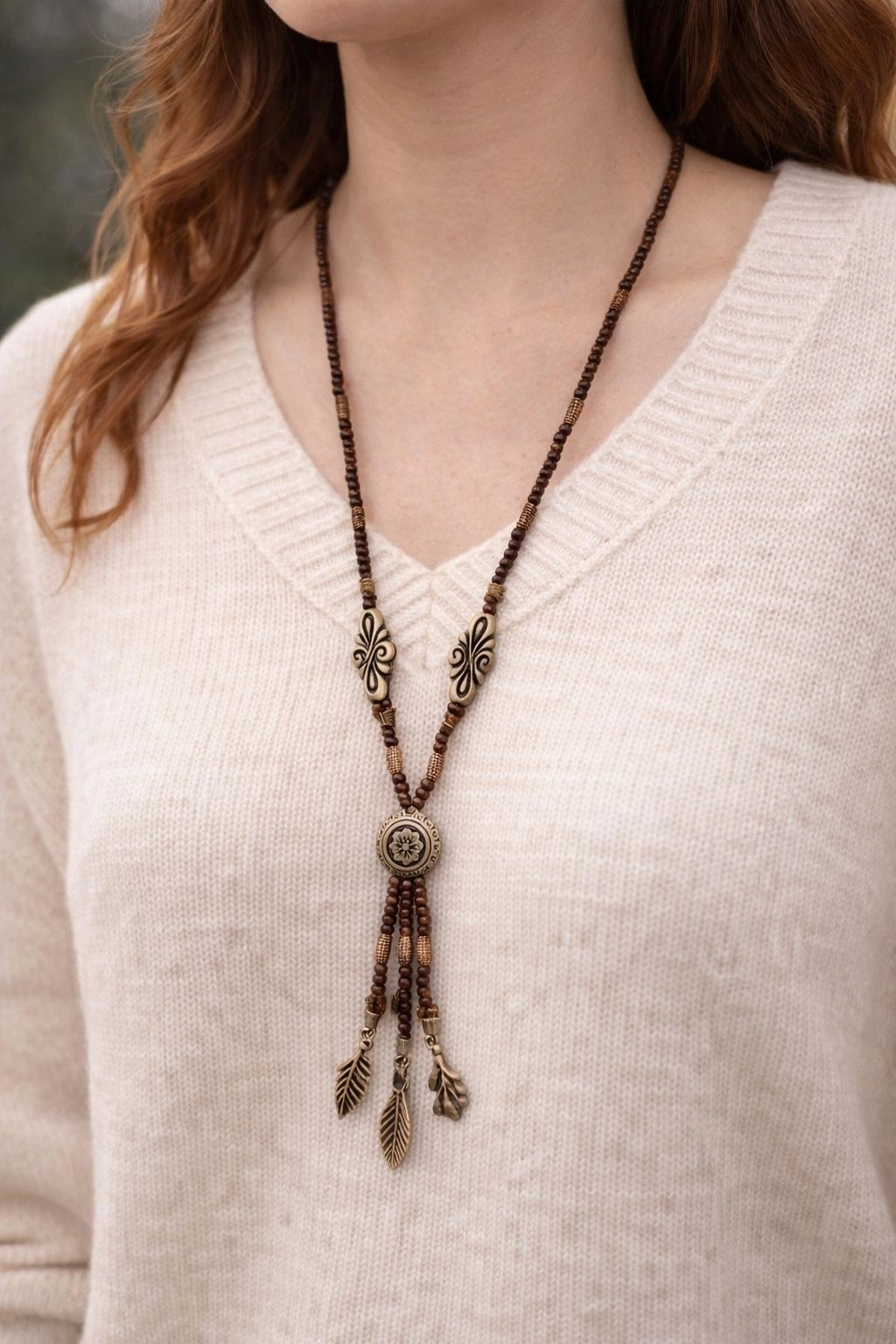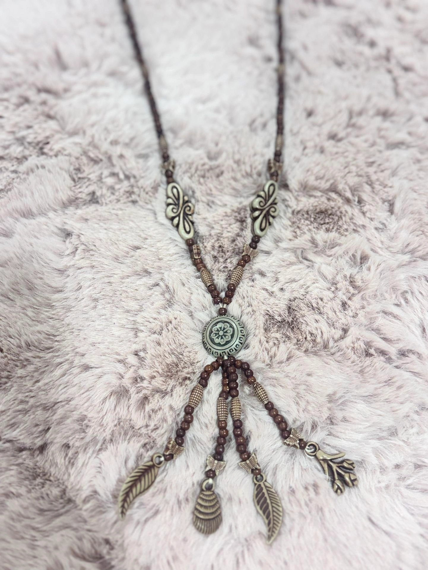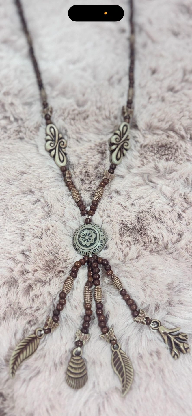Beautiful bohemian-inspired statement necklace featuring rich earth-tone beads, mixed metal accents, and an eye-catching long drop pendant. The design includes decorative charms such as leaves, shell detailing, and a hand motif, giving it a relaxed southwestern / festival vibe.