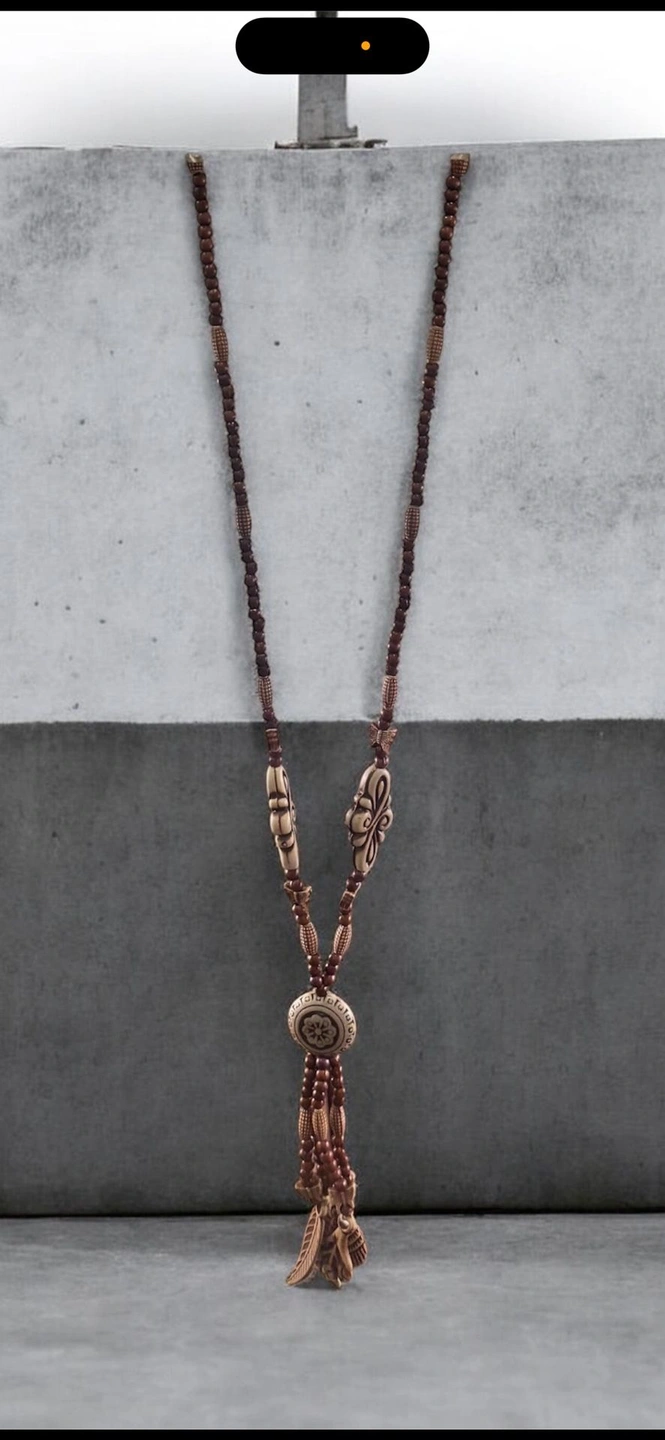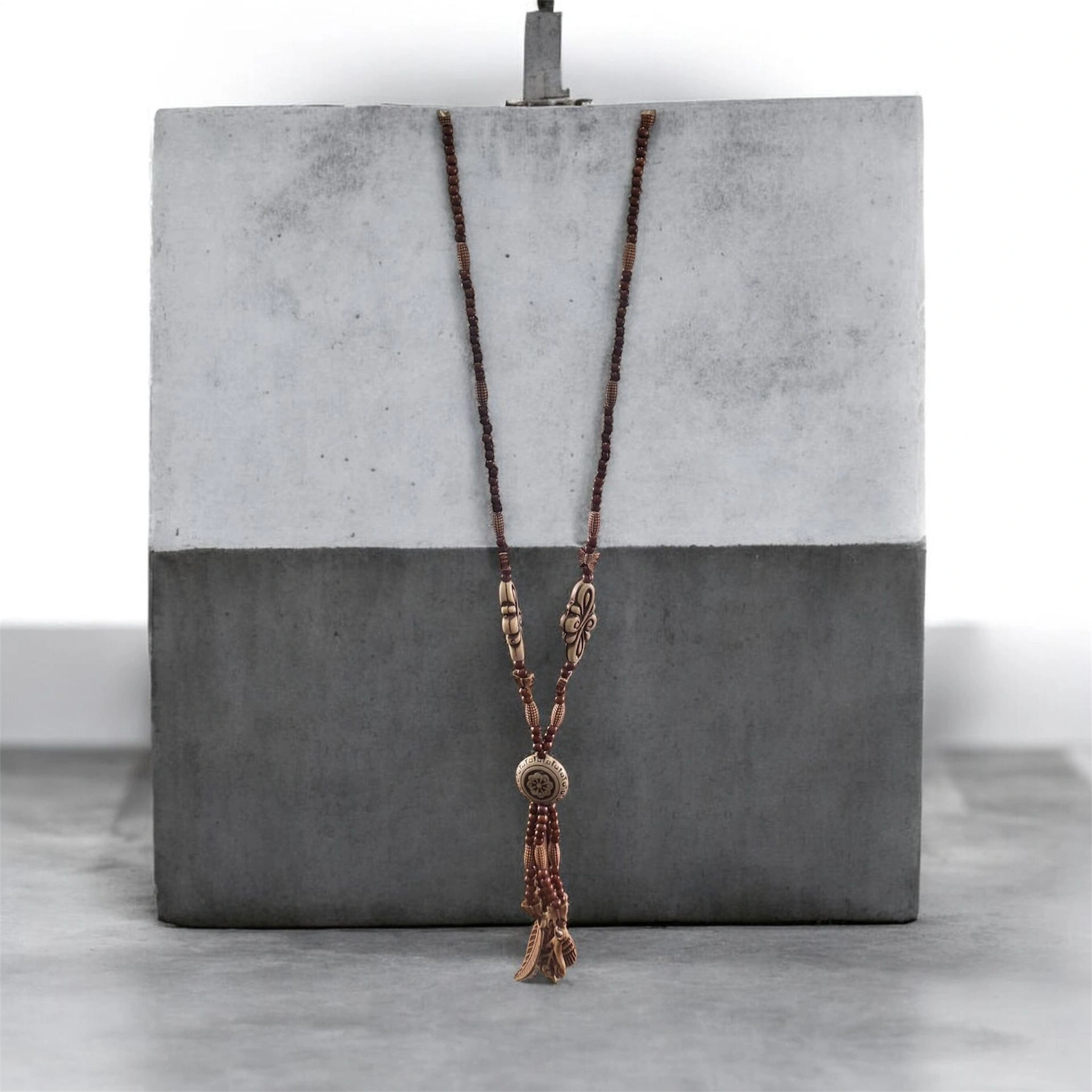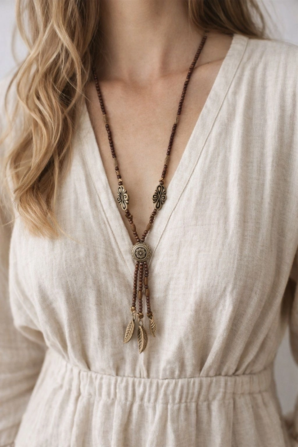 Beautiful bohemian-inspired statement necklace featuring rich earth-tone beads, mixed metal accents, and an eye-catching long drop pendant. The design includes decorative charms such as leaves, shell detailing, and a hand motif, giving it a relaxed southwestern / festival vibe.
