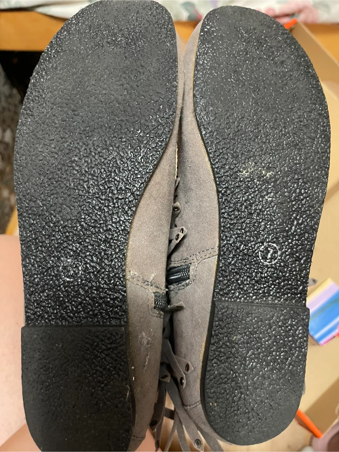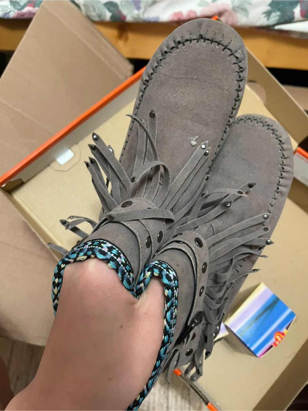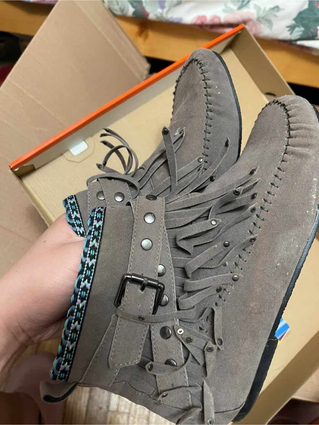 Selling size 7 moccasin-style boots. They're a light brown/grey colour and have some cute fringe detailing. They come with a buckle strap and a colourful patterned trim. These boots are super comfy and stylish!