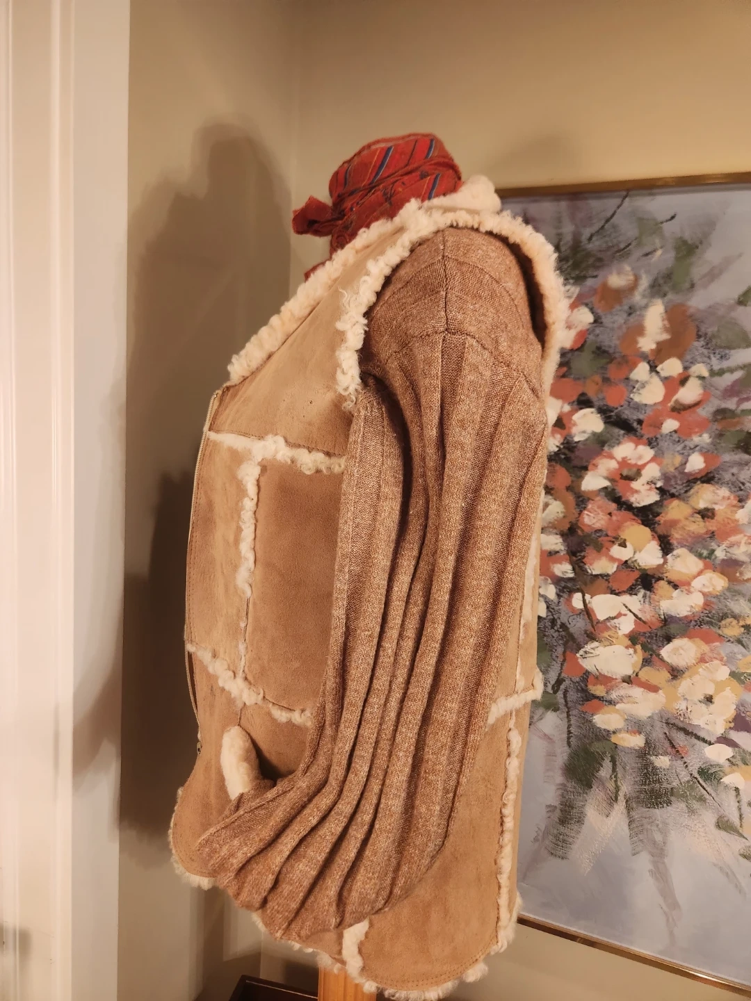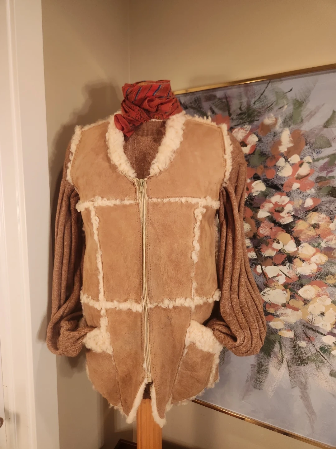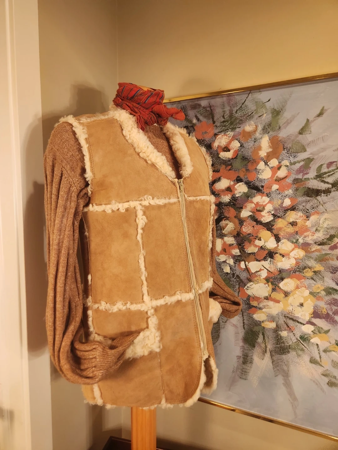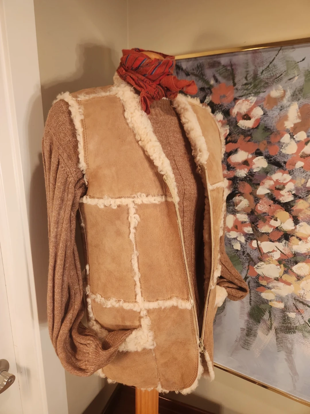 Here's a stylish shearling vest! It's a lovely beige colour and features a zipper closure. Perfect for adding a touch of warmth and style to your wardrobe on those cooler days. Fits small medium woman sizes.