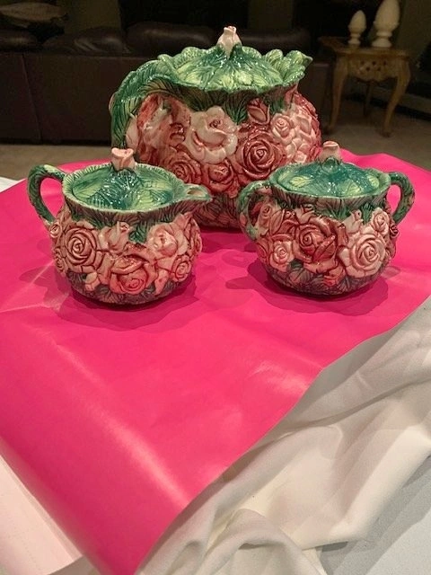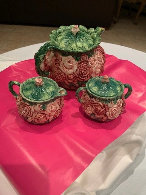 Majolica Style With Dimensional Pink & Red Roses & Green Leaves