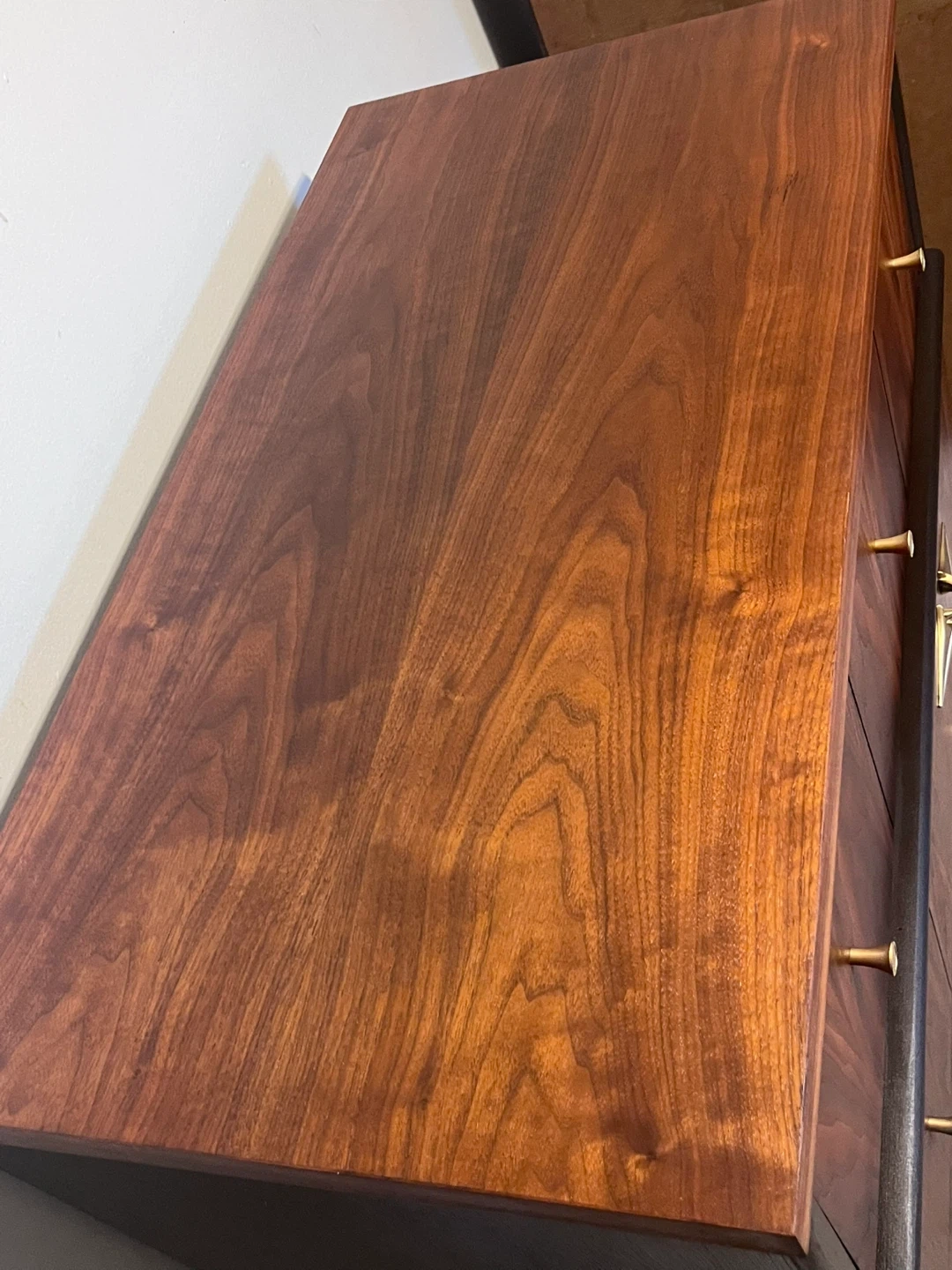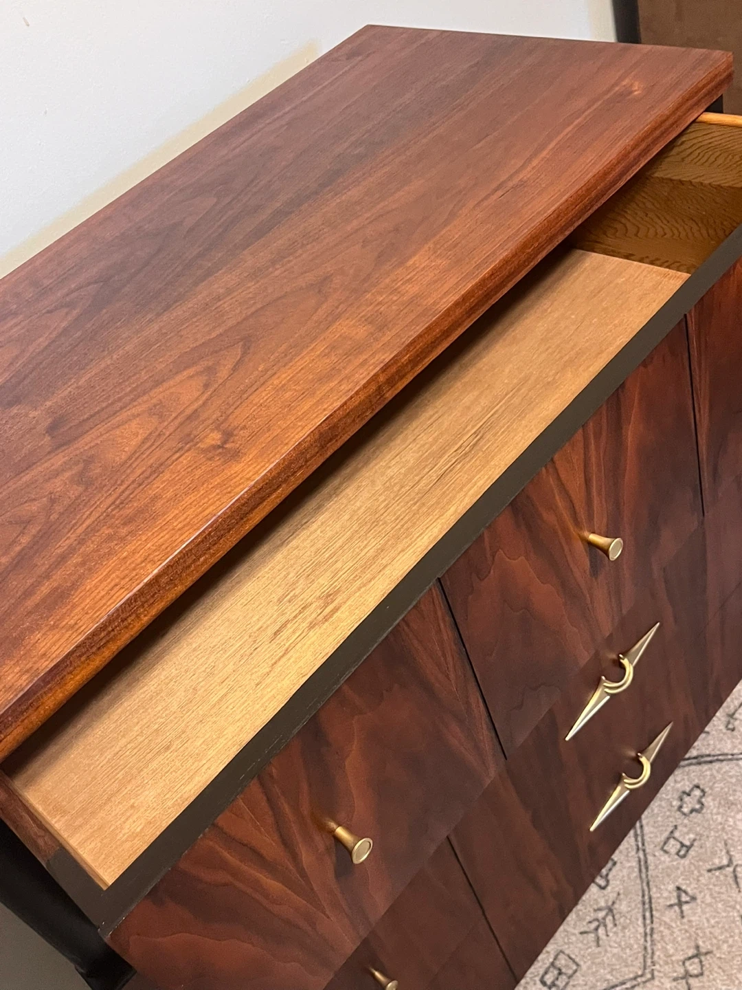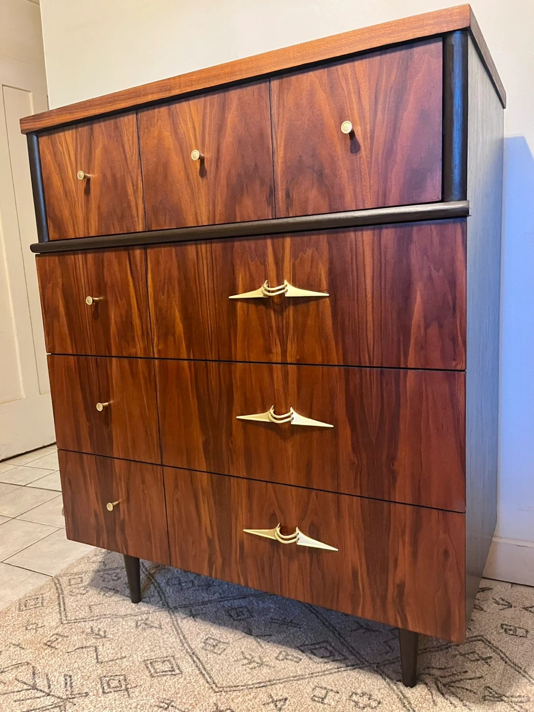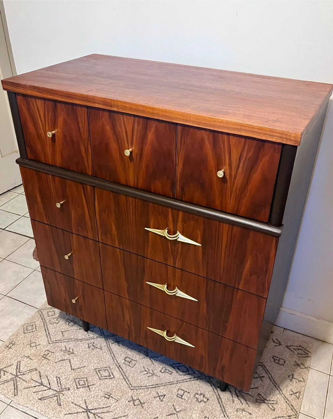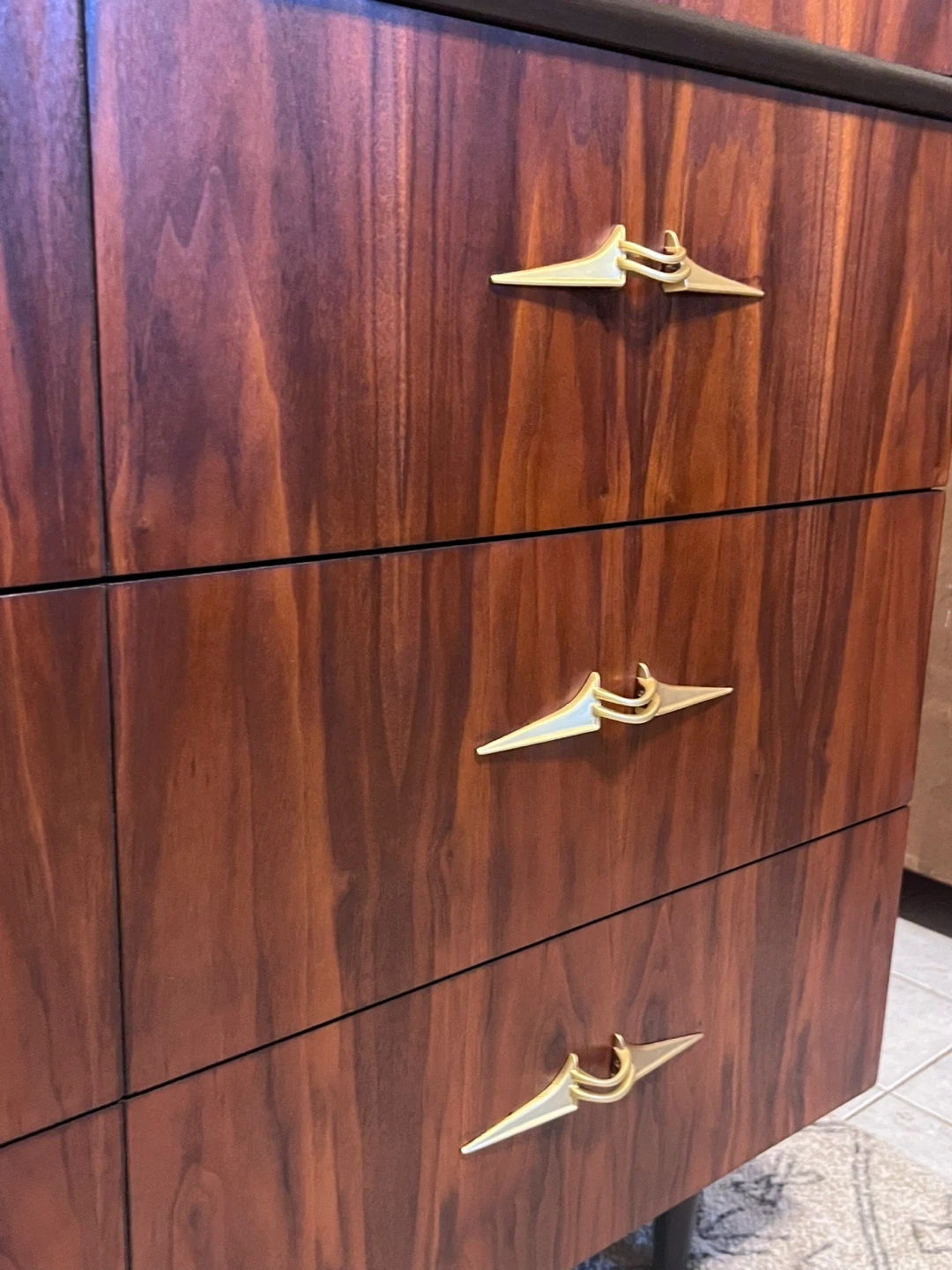 True Mid Century 4 drawer dresser! Fun atomic original handles smooth walnut fronted drawers! handsome and timeless piece 👌🏼 firm price cash only please.