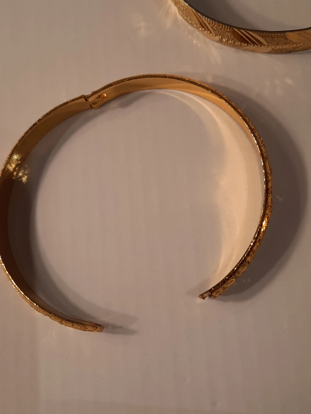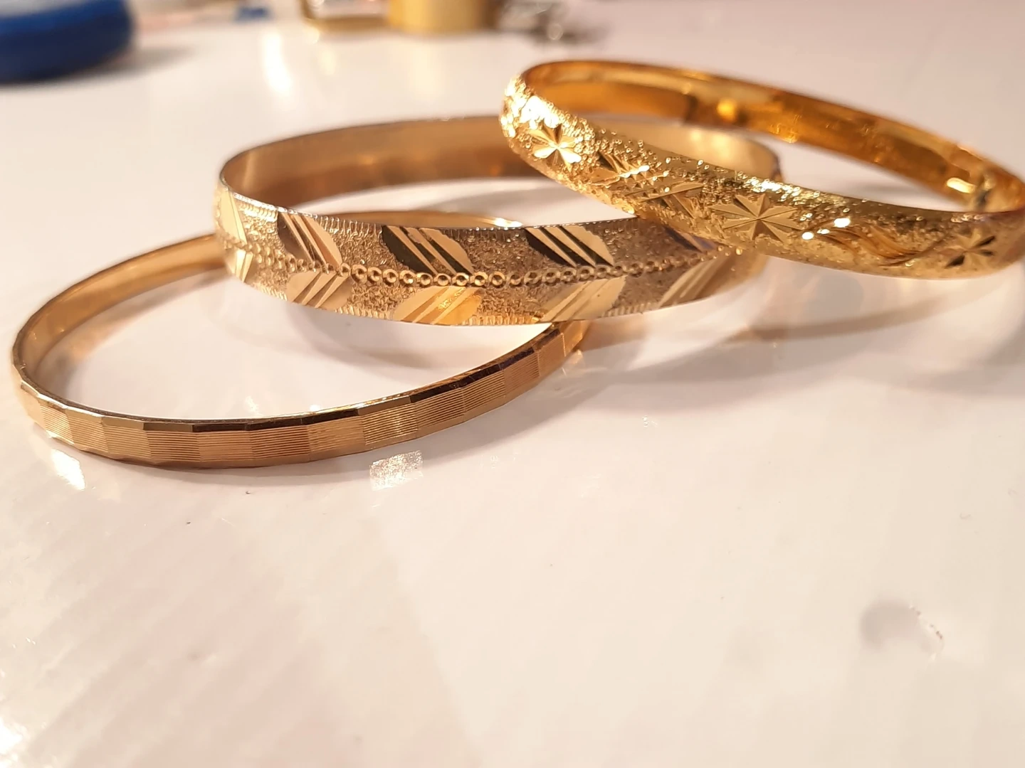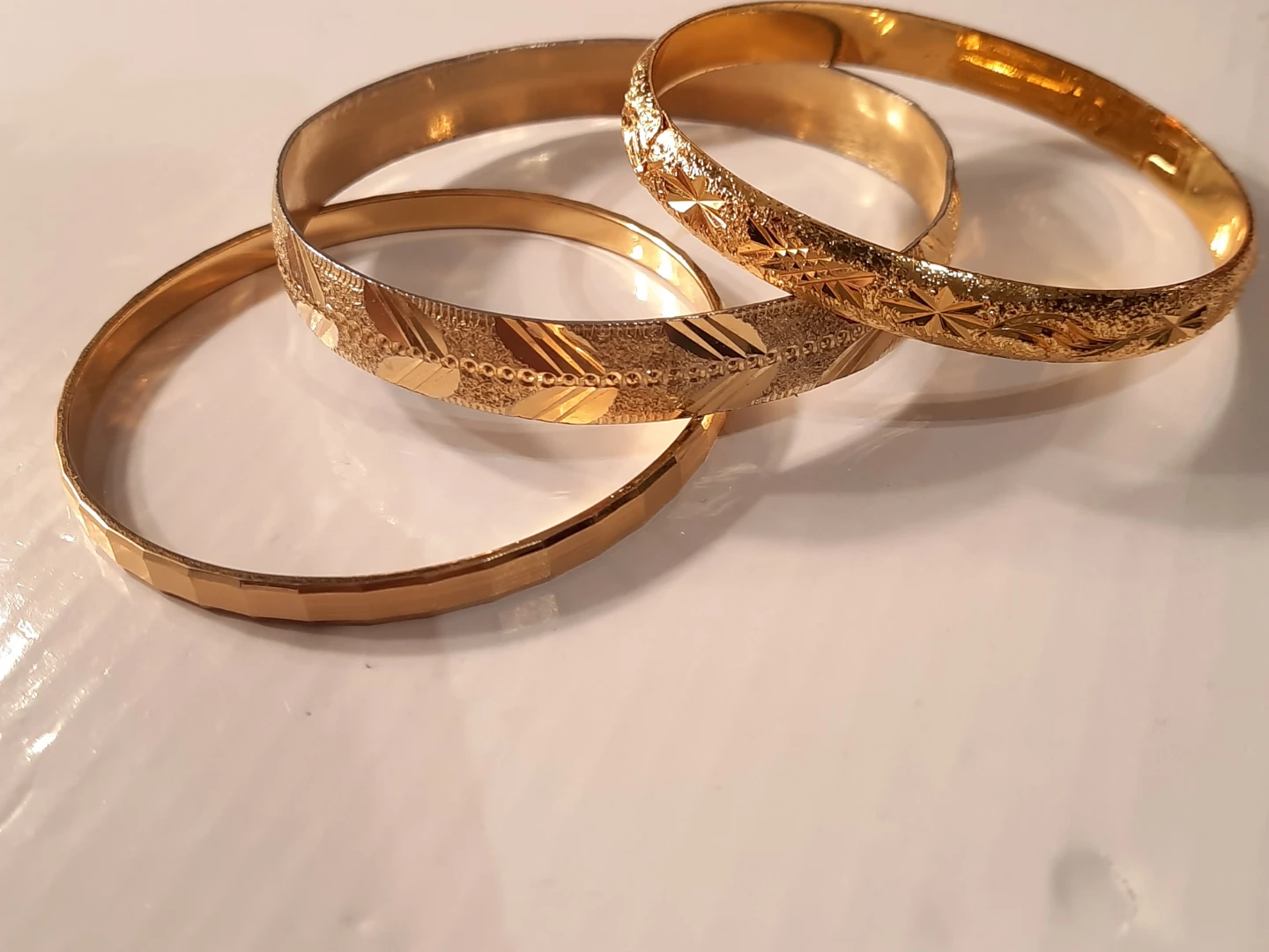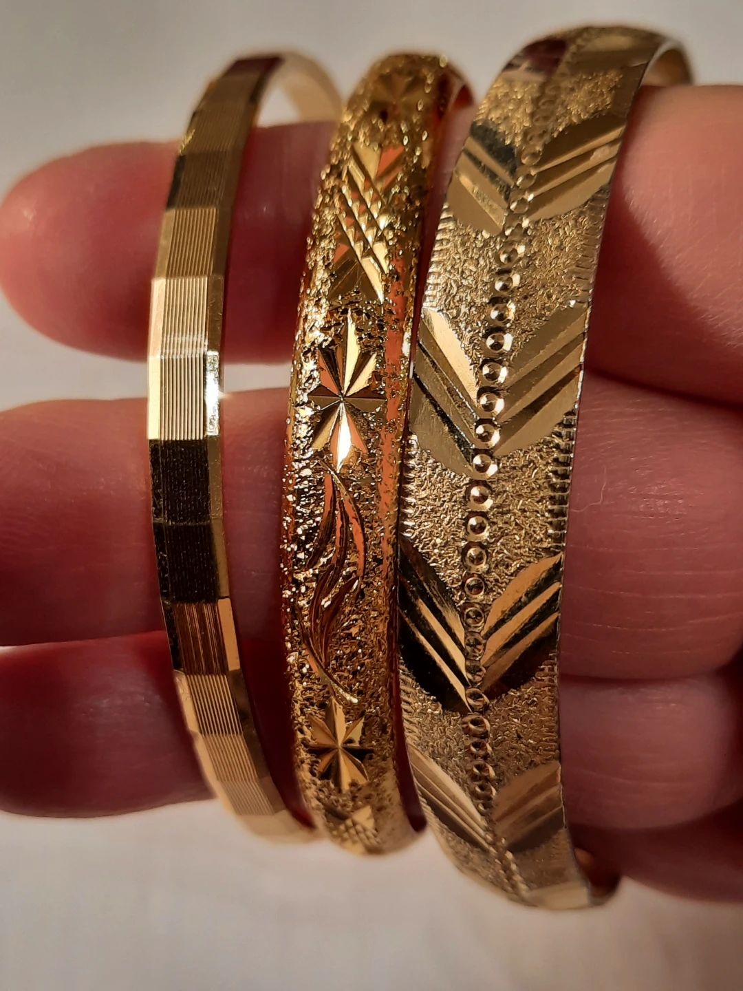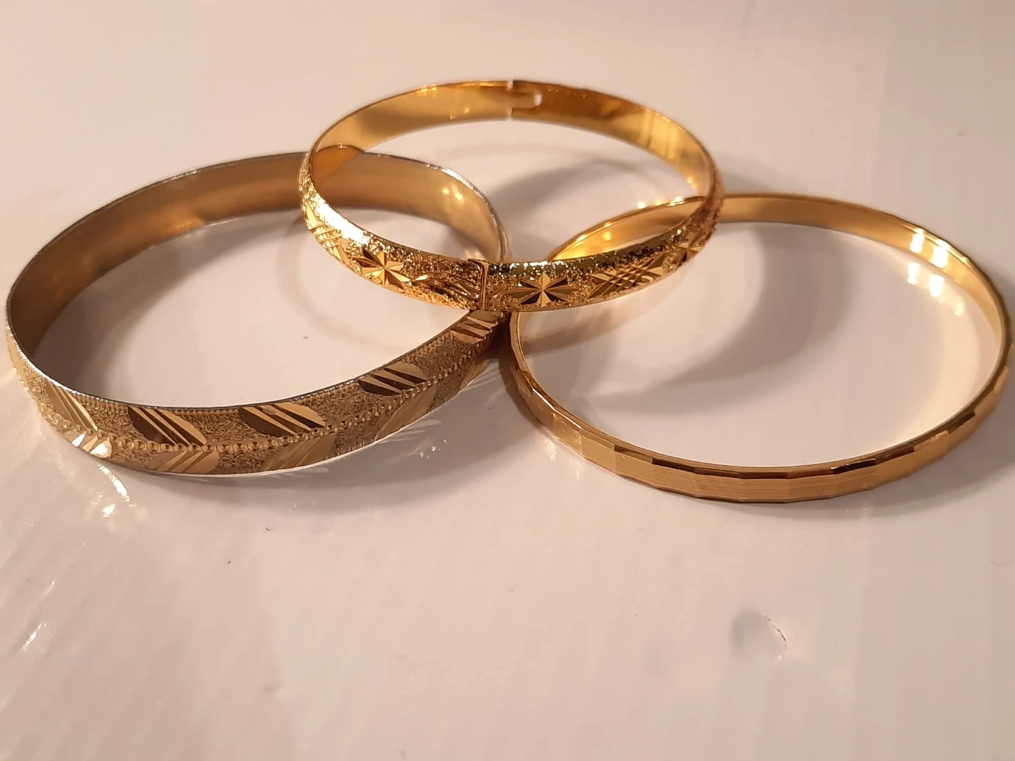 Selling a set of three gold-filled gold plate bangles! These are in great condition and feature different textures and patterns. Perfect for adding a touch of elegance to any outfitnot new,little ware .