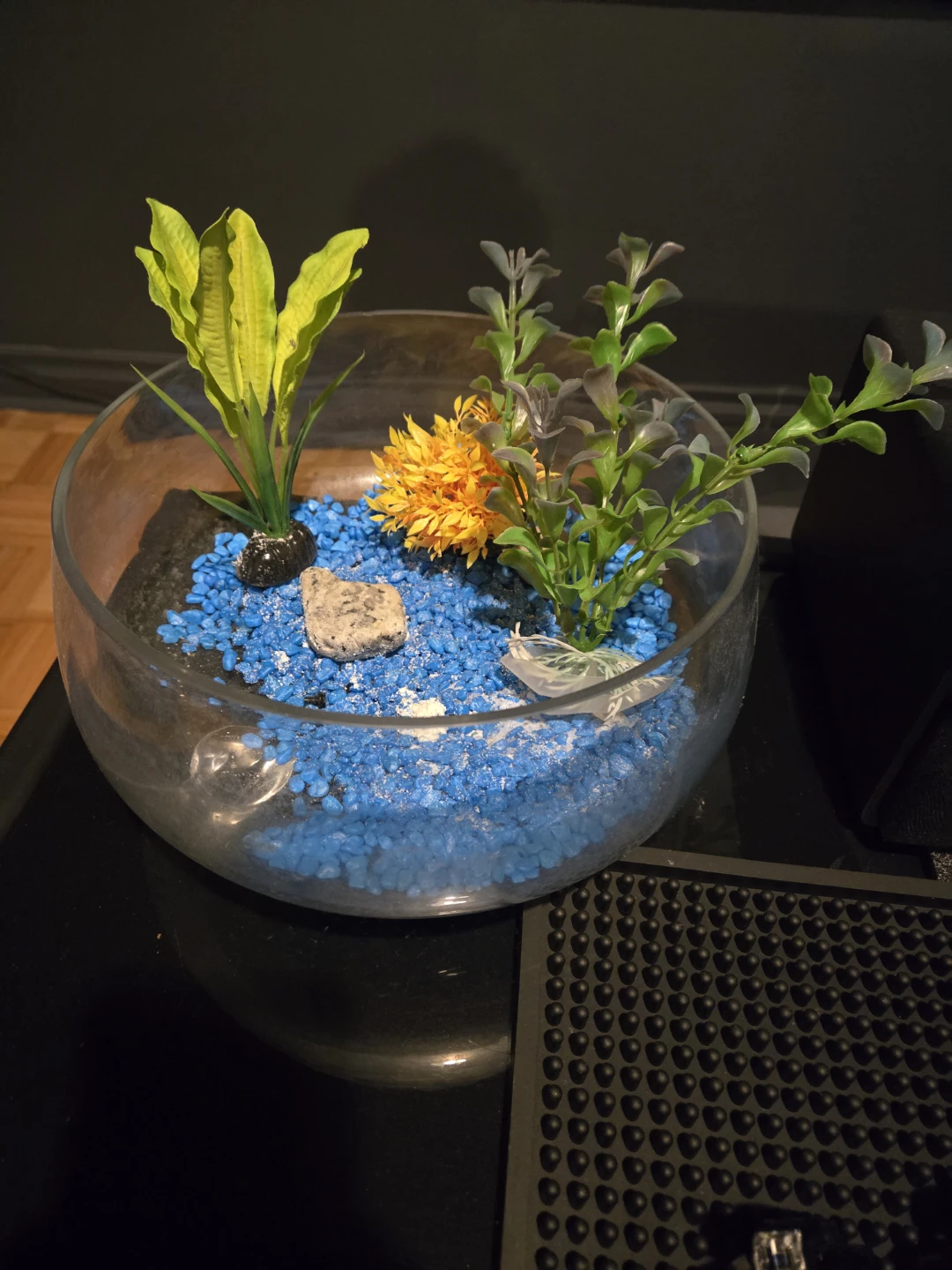 Selling a clear fish bowl filled with bright blue gravel and a variety of artificial plants. It's a cute little setup to add a pop of colour to any room!