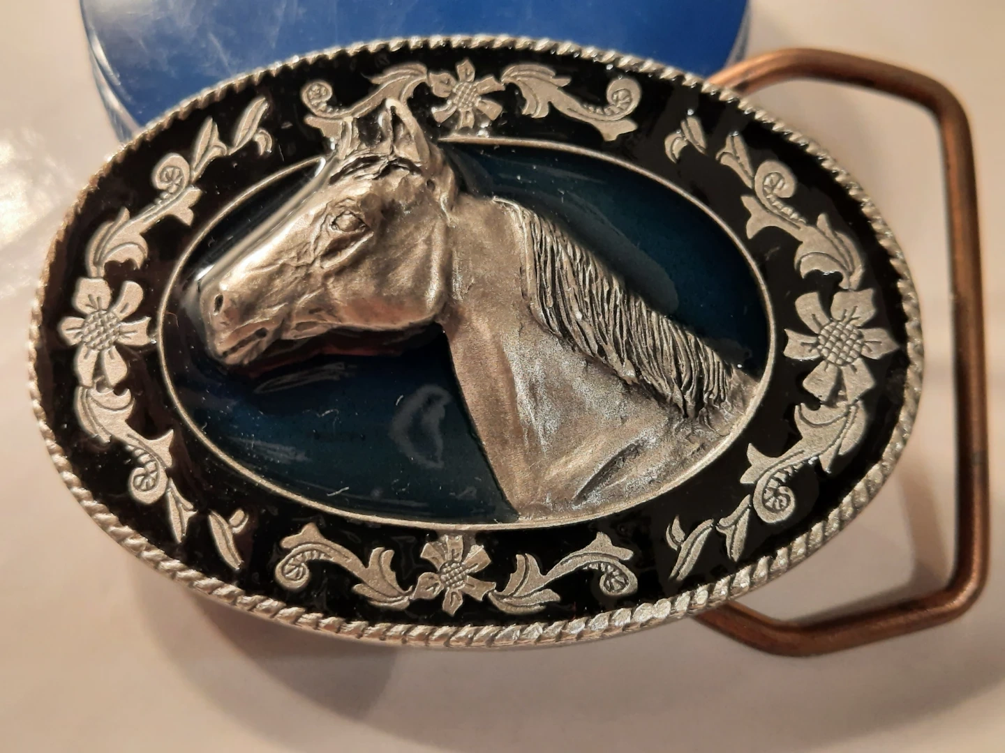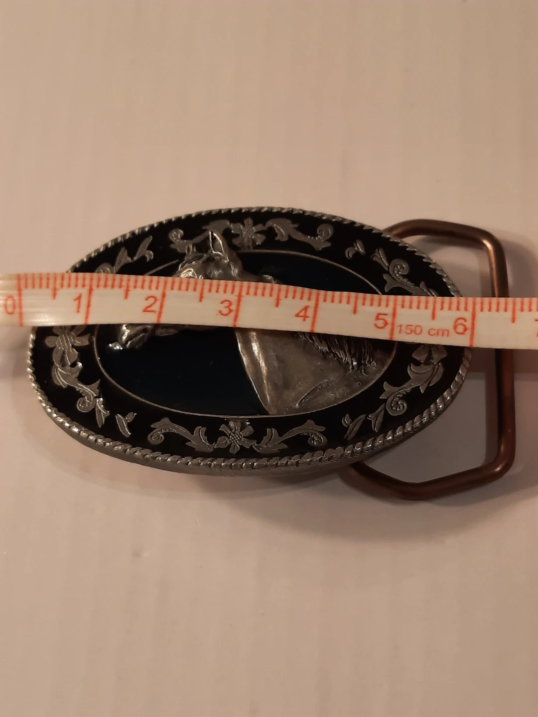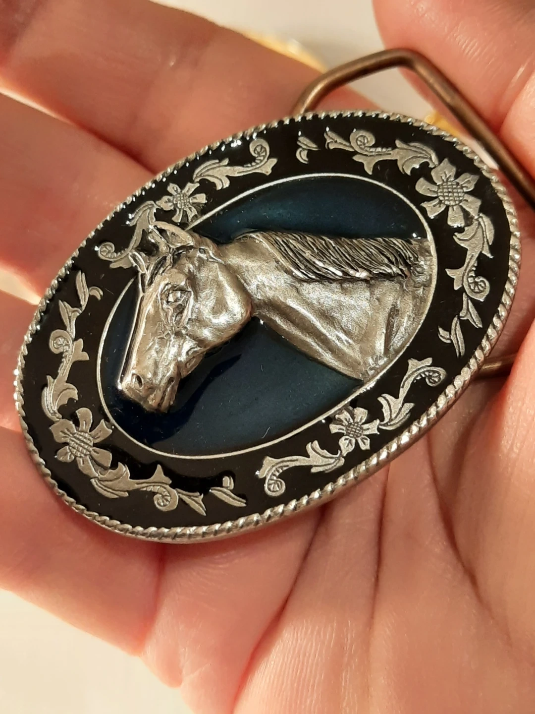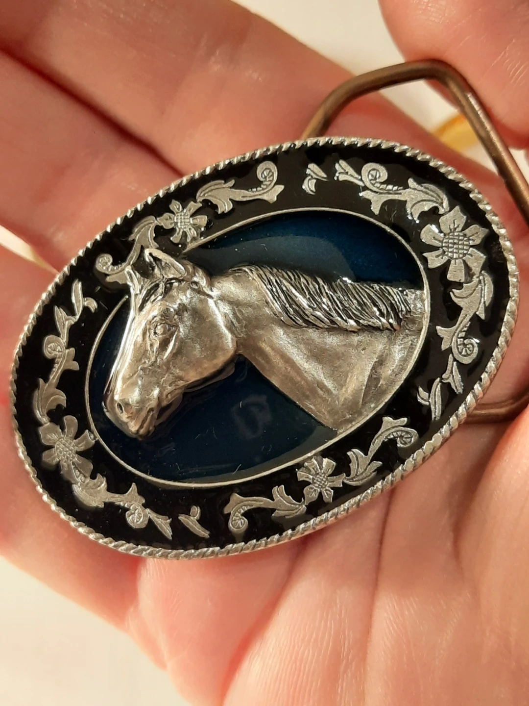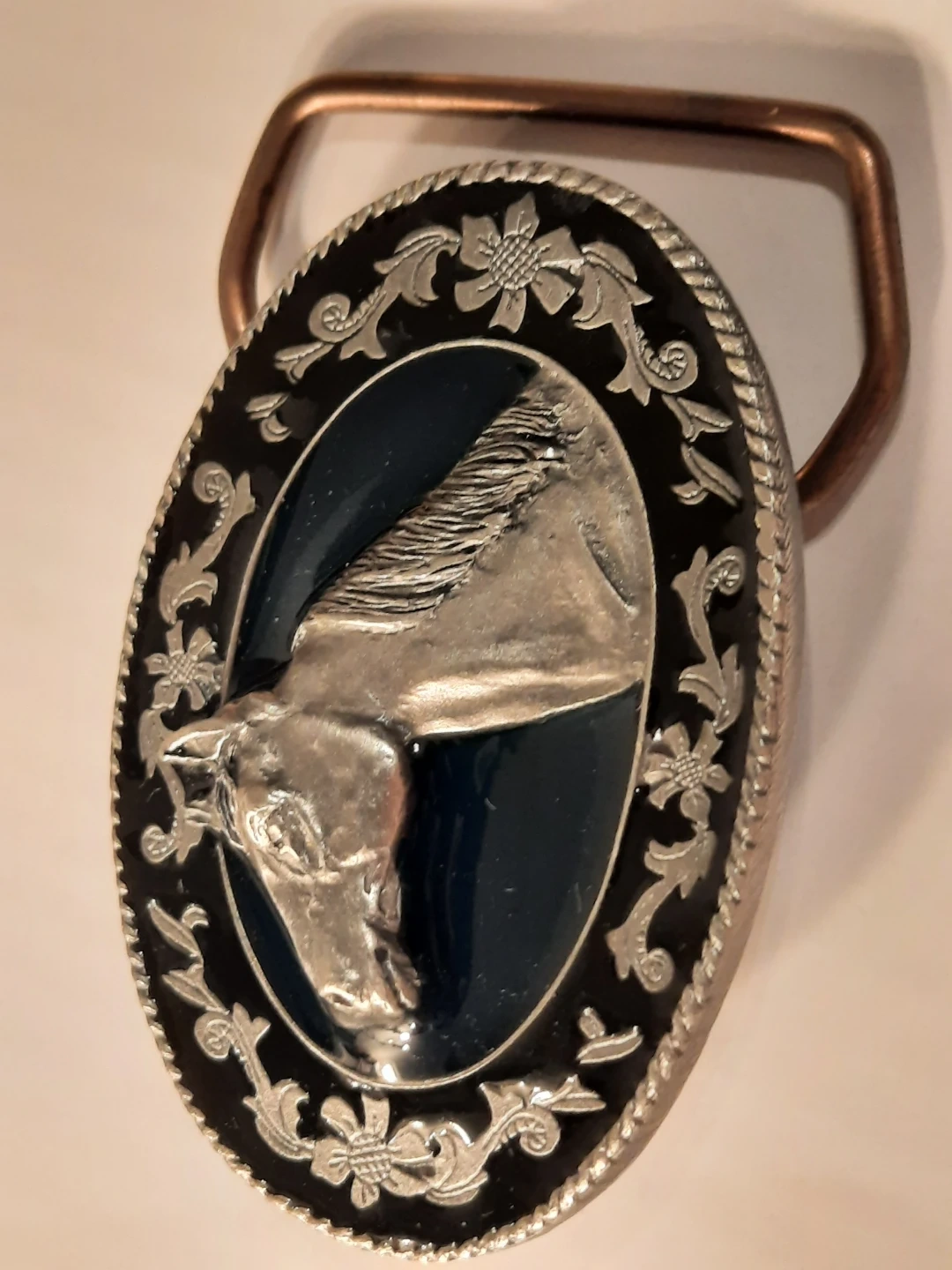 Selling a stylish horse belt buckle! It features an oval design with a detailed silver horse head in the centre. The buckle has a black and silver floral border, adding a touch of elegance. Perfect for adding a Western flair to any outfit!,pewter .
