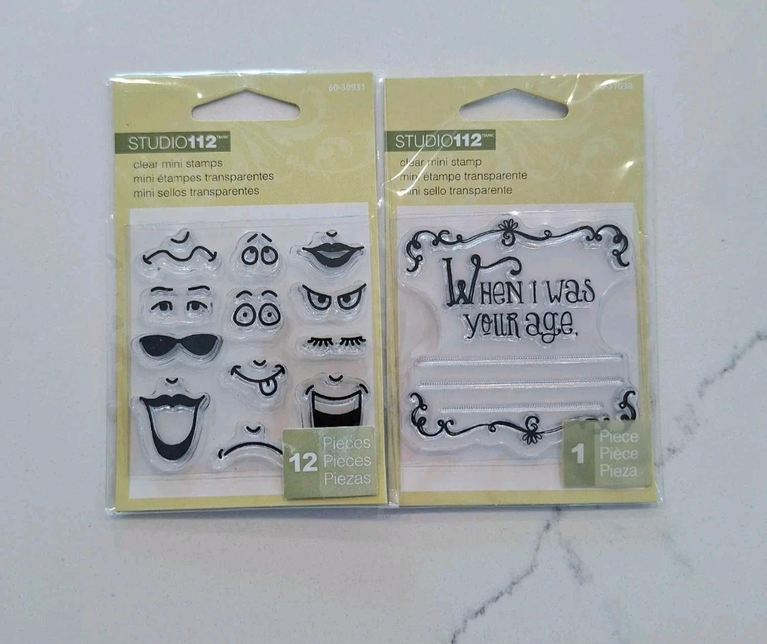 Two sets of Studio 112 clear mini stamps for your crafting needs! One set includes 12 pieces of facial features, and the other has a 'When I was your age' sentiment with a space to write. Perfect for scrapbooking, card making, and other paper crafts