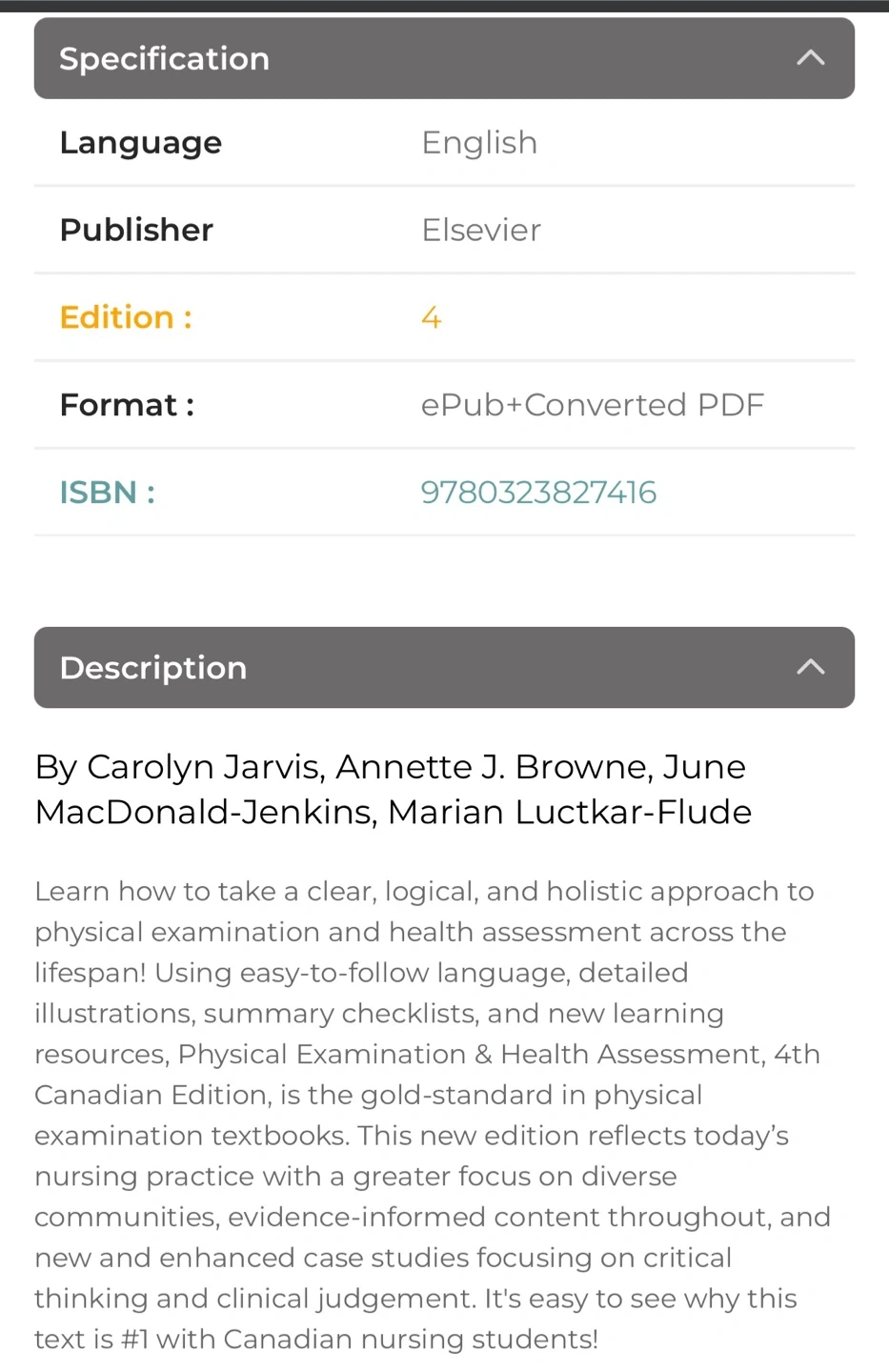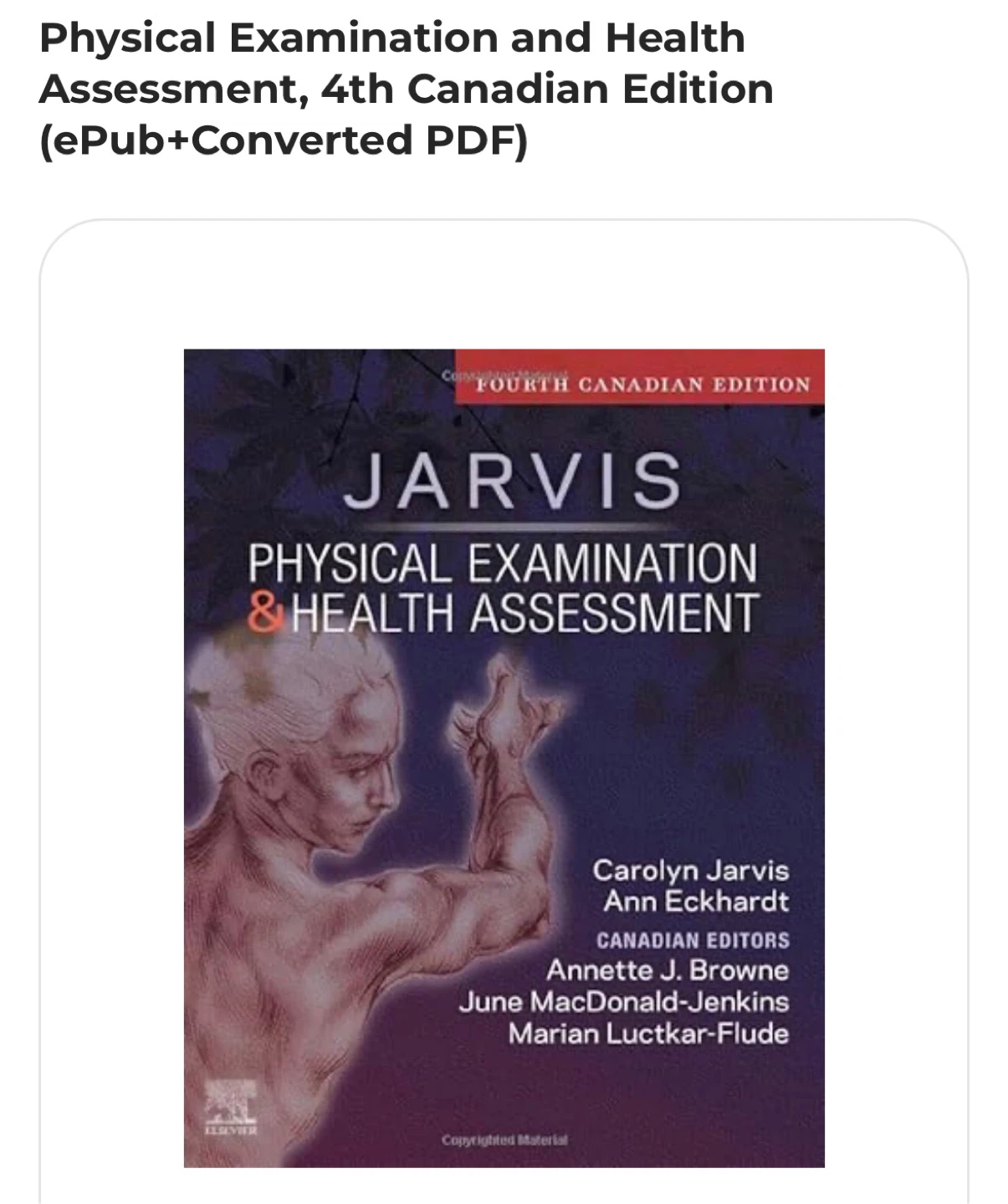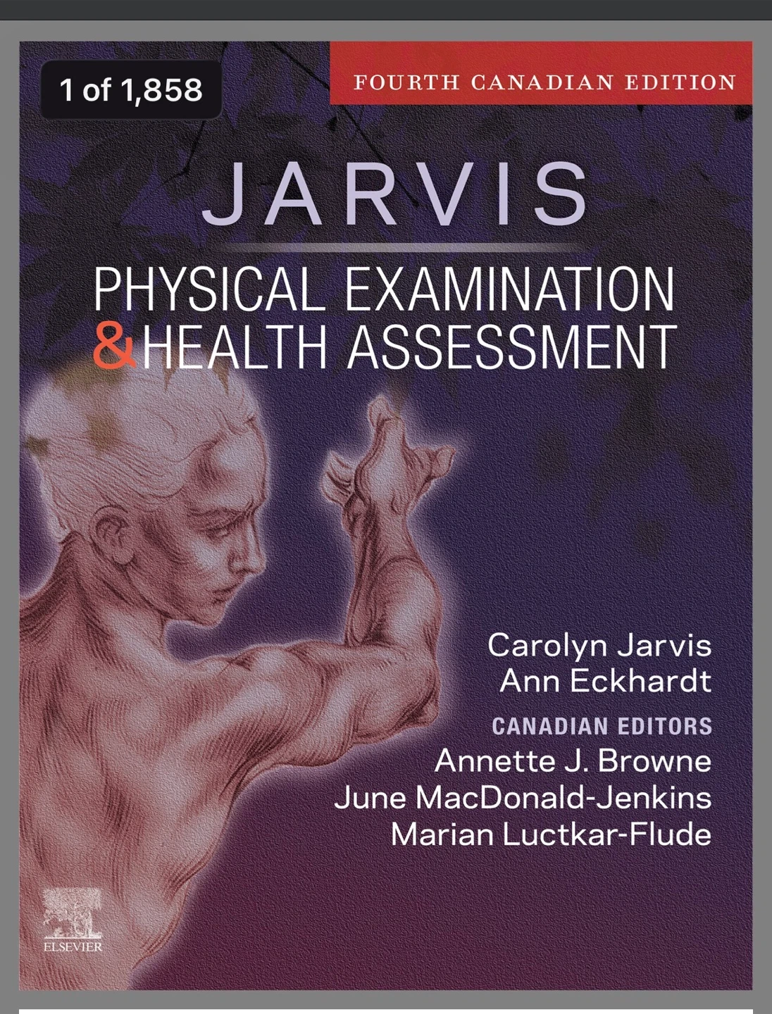 Selling the PDF version of the 4th Canadian Edition of Jarvis Physical Examination & Health Assessment. This ebook is by Carolyn Jarvis, Annette J. Browne, June MacDonald-Jenkins, and Marian Luctkar-Flude. It's a gold-standard textbook for physical examination practice, with a focus on diverse communities and evidence-informed content.