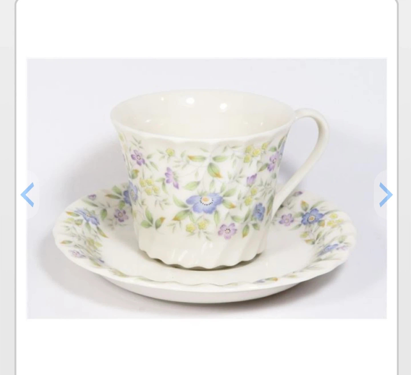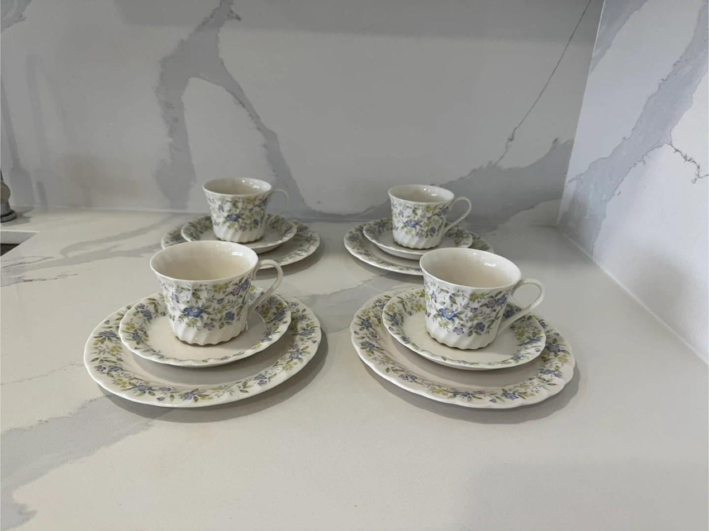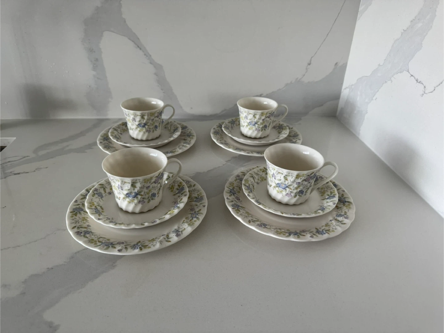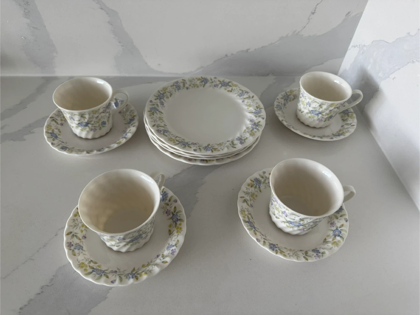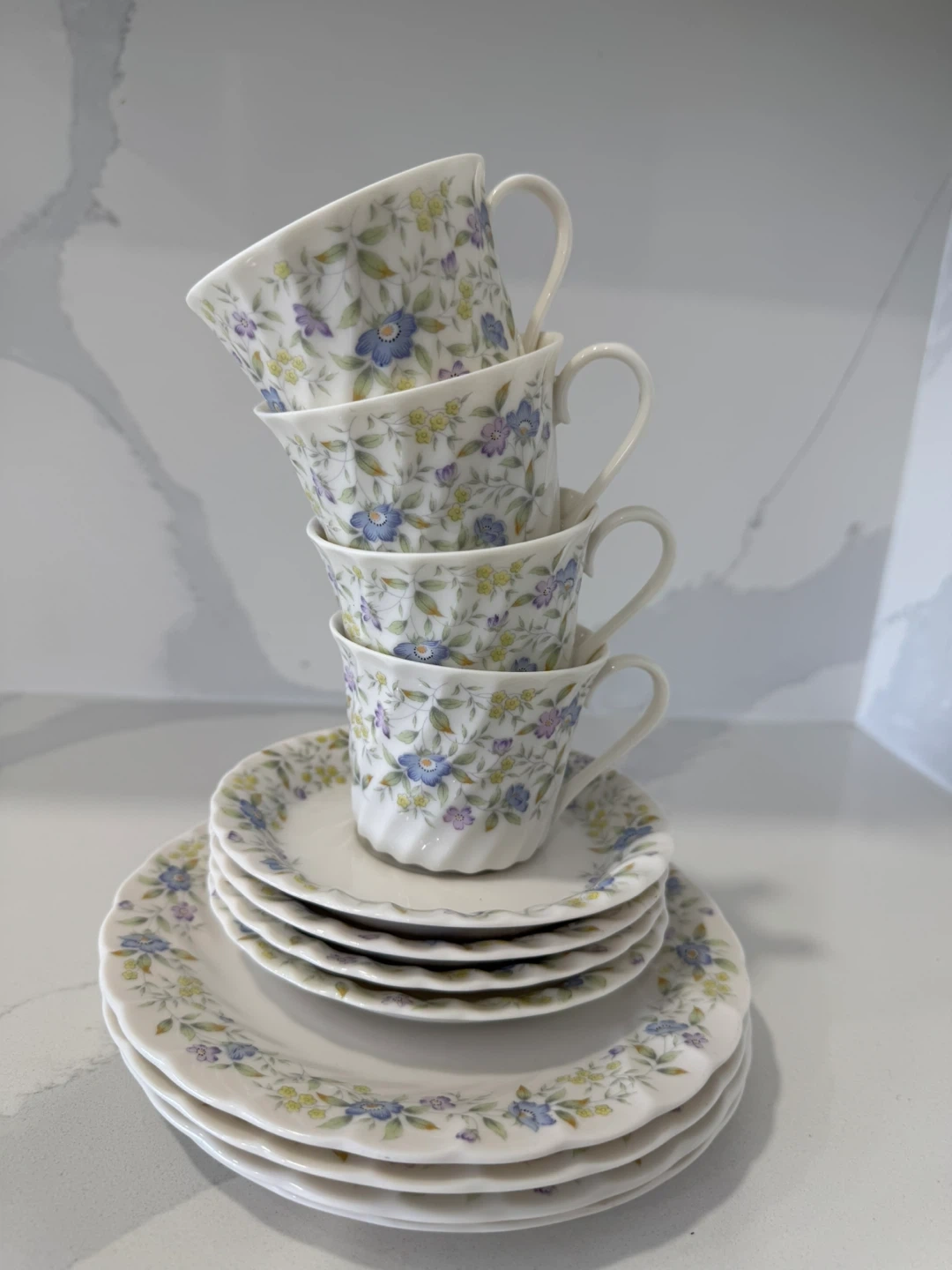 Includes 4 teacups & saucers and 4 dessert plates (12 pieces total). They have a pretty floral design with blue and purple flowers. Perfect for tea time or adding a touch of charm to your kitchen! Excellent condition—like new, no chips or scratches. Used for display only. From smoke free and pet free home