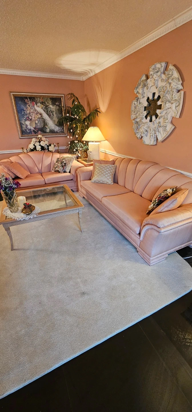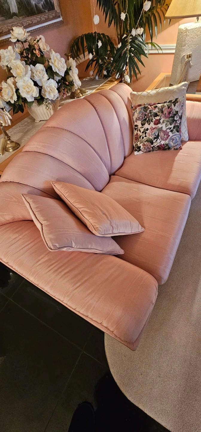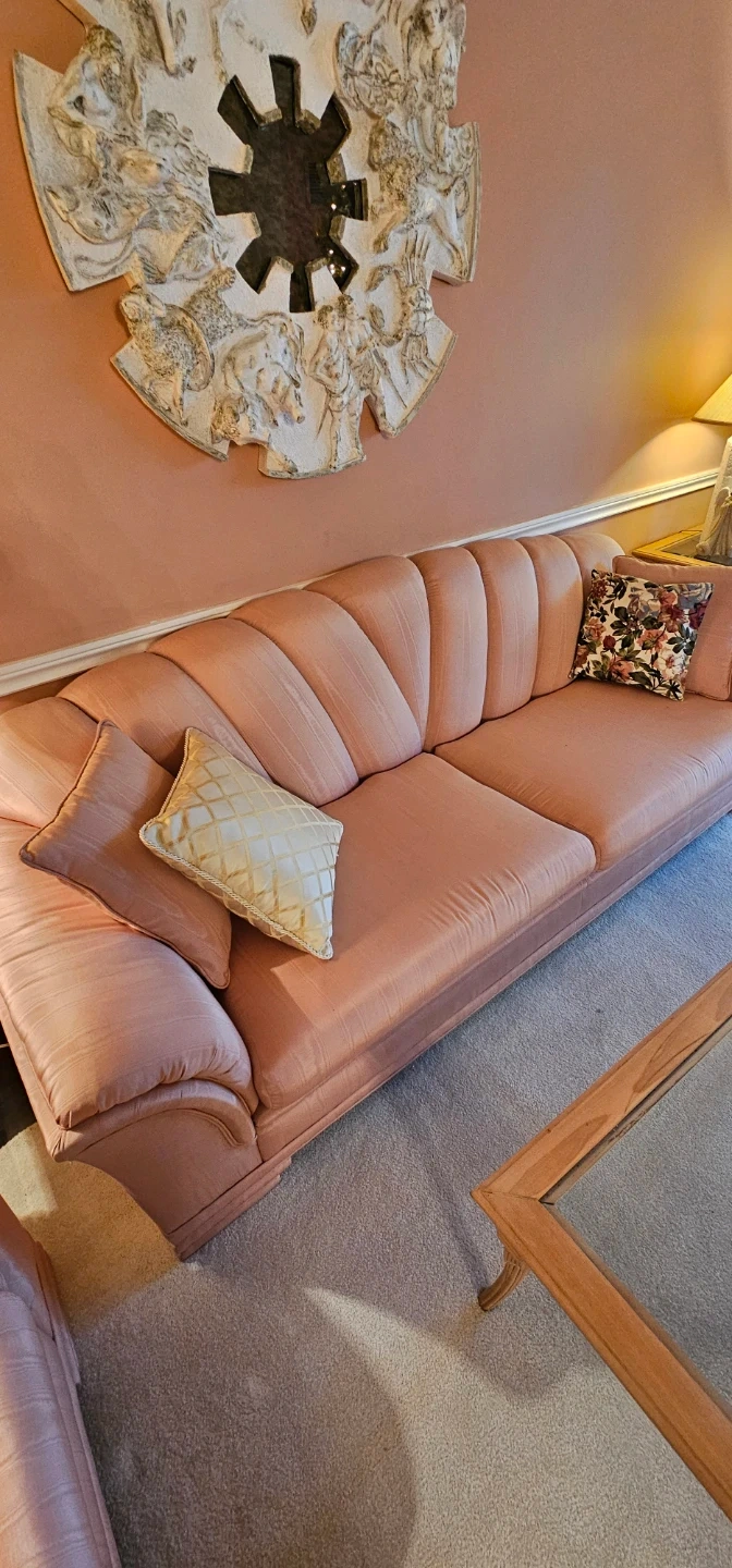Selling a beautiful vintage sectional sofa set in a lovely shade of pink. This set includes a sofa and loveseat, perfect for adding a touch of retro charm to your living room. The unique design and comfortable cushions make it a great addition to any home. Pillows are included!