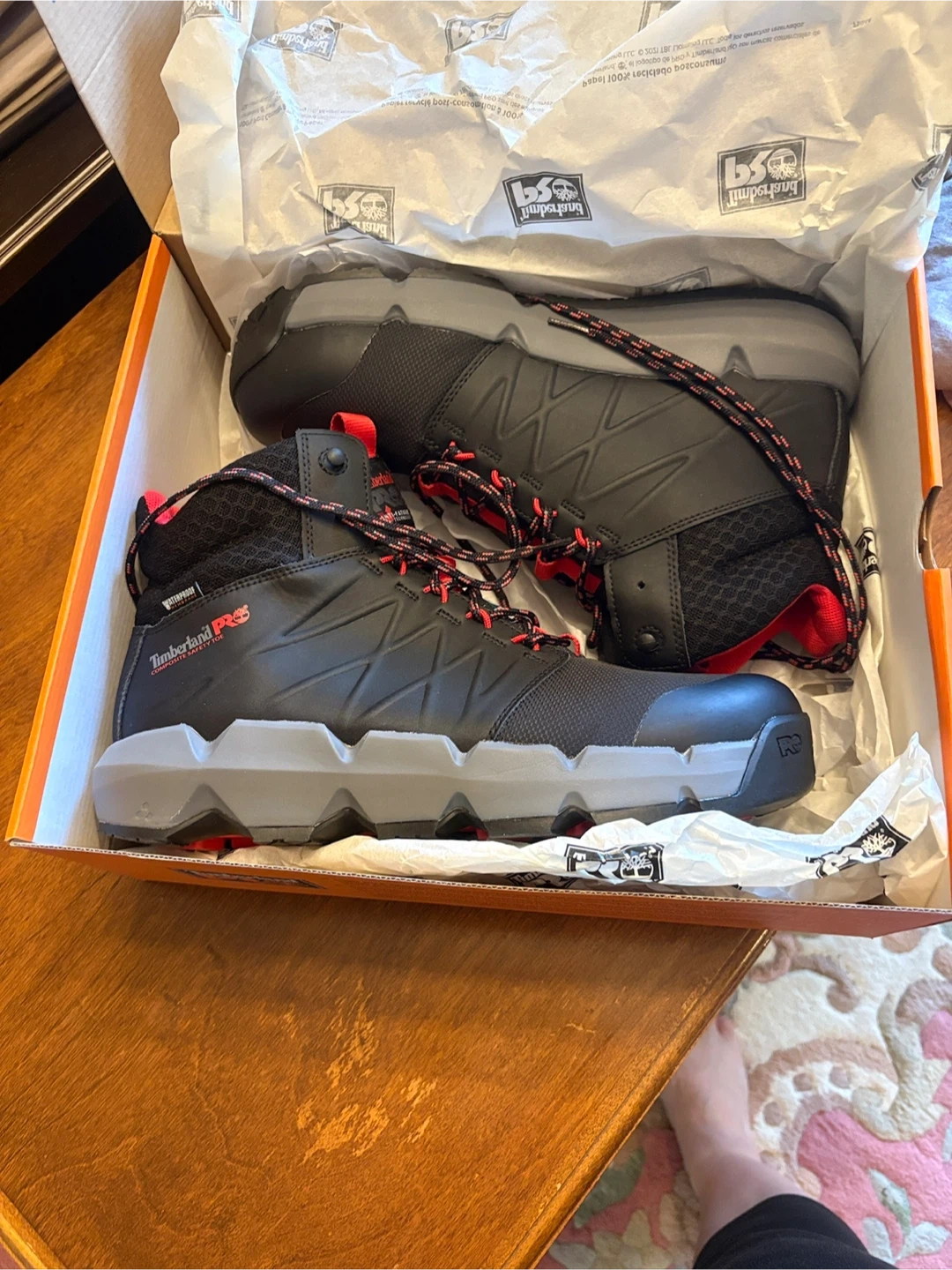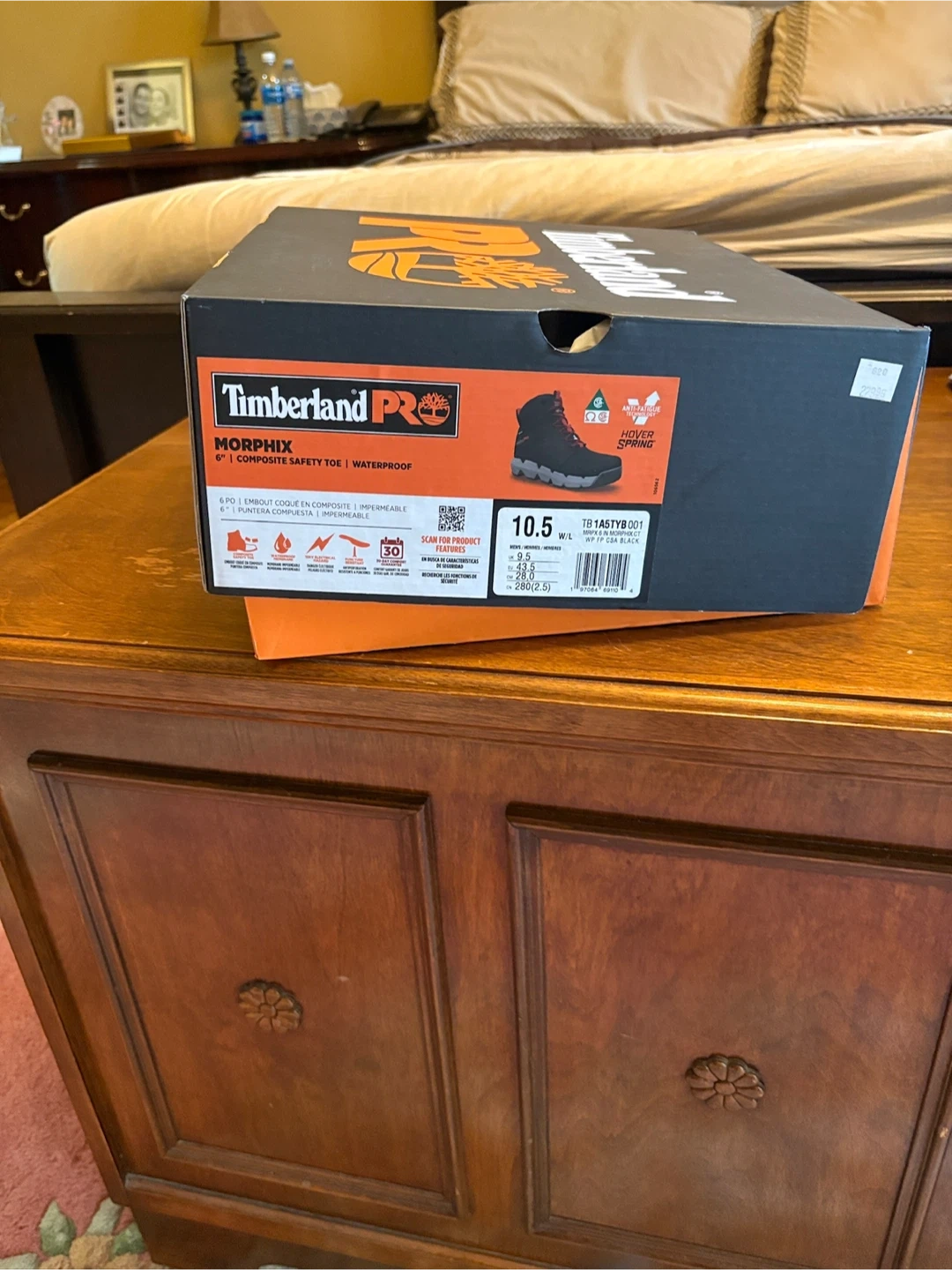 Selling a pair of Timberland PRO Morphix 6" Composite Safety Toe Waterproof boots in size 10.5. These boots are black and feature a composite safety toe for protection and Hover Spring technology for comfort. They are waterproof, making them suitable for various work conditions. The box is included!