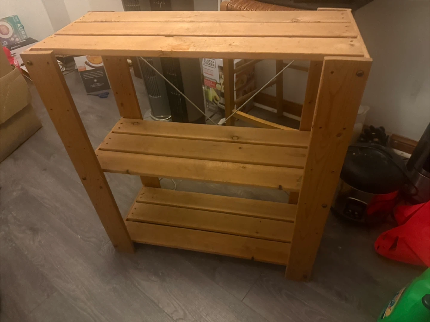 Here's a sturdy wooden shelf unit, perfect for organizing your space! It has three shelves and a simple, rustic design. Great for storage or display