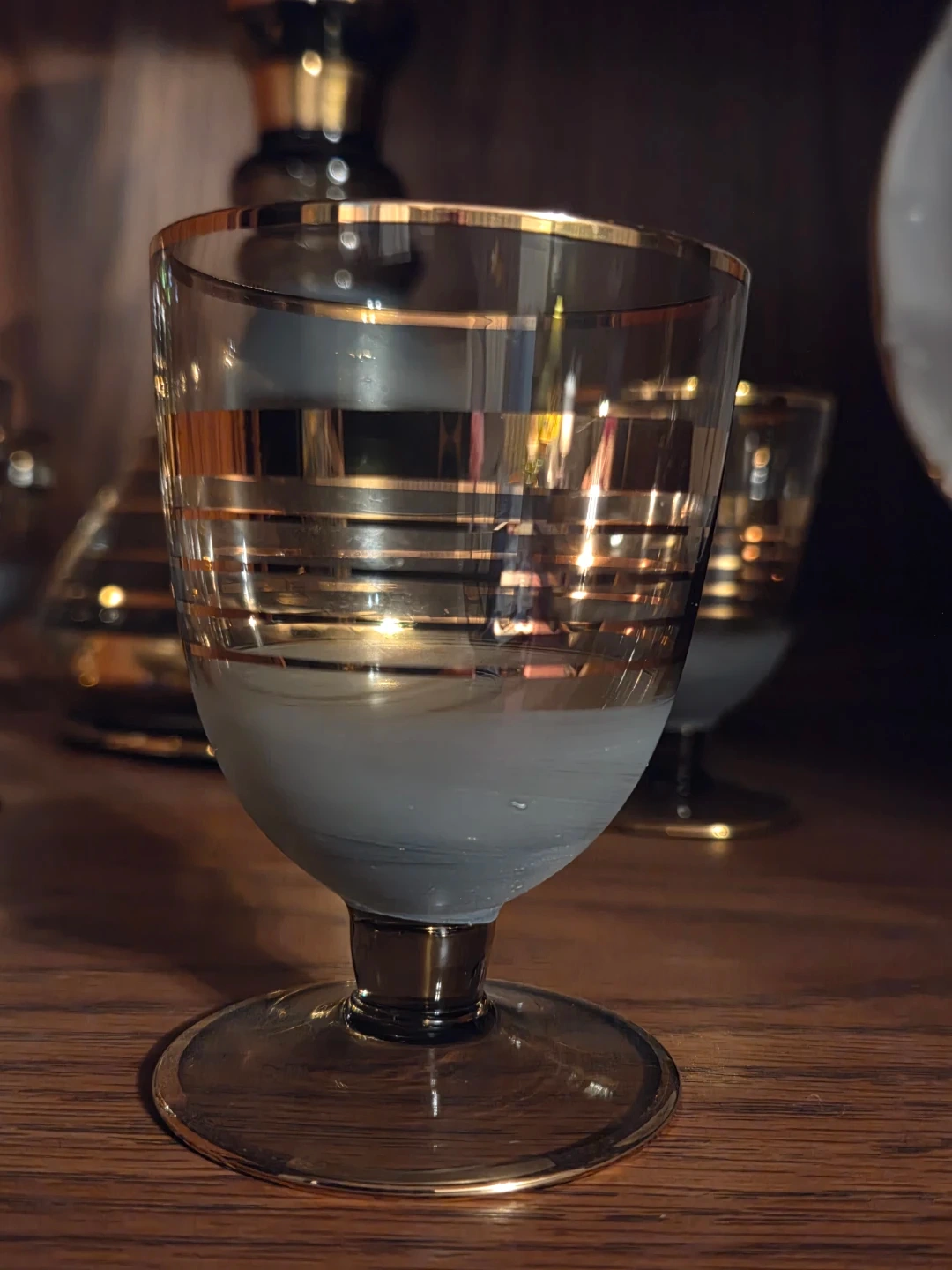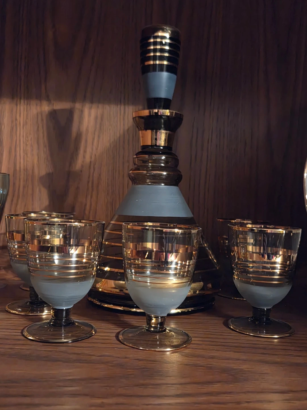 Selling a vintage liquor decanter set. It features a decanter and several matching glasses, all accented with gold trim. This set would make a beautiful addition to any home bar or collection! Displayed in a cabinet all it's life. Smoke free home. No chips or cracks.