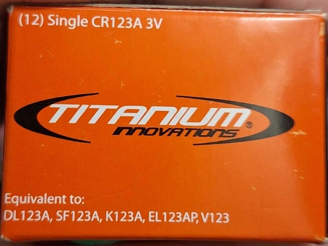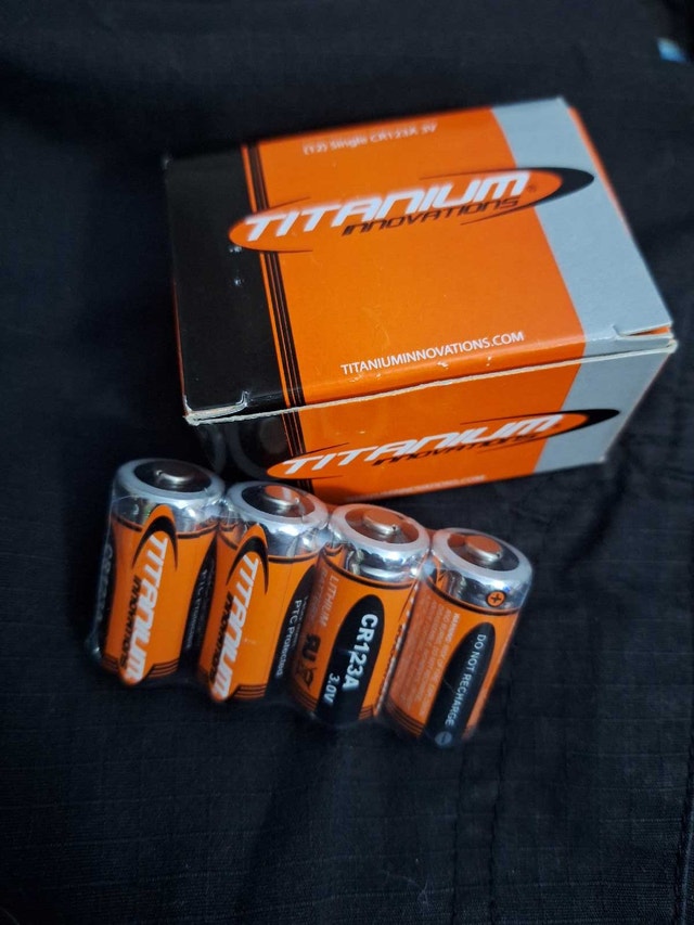 I have 4-packs of Titanium Innovations CR123A 3-volt lithium batteries available. These high-performance lithium batteries ideal for flashlights, cameras, and other high-drain devices.