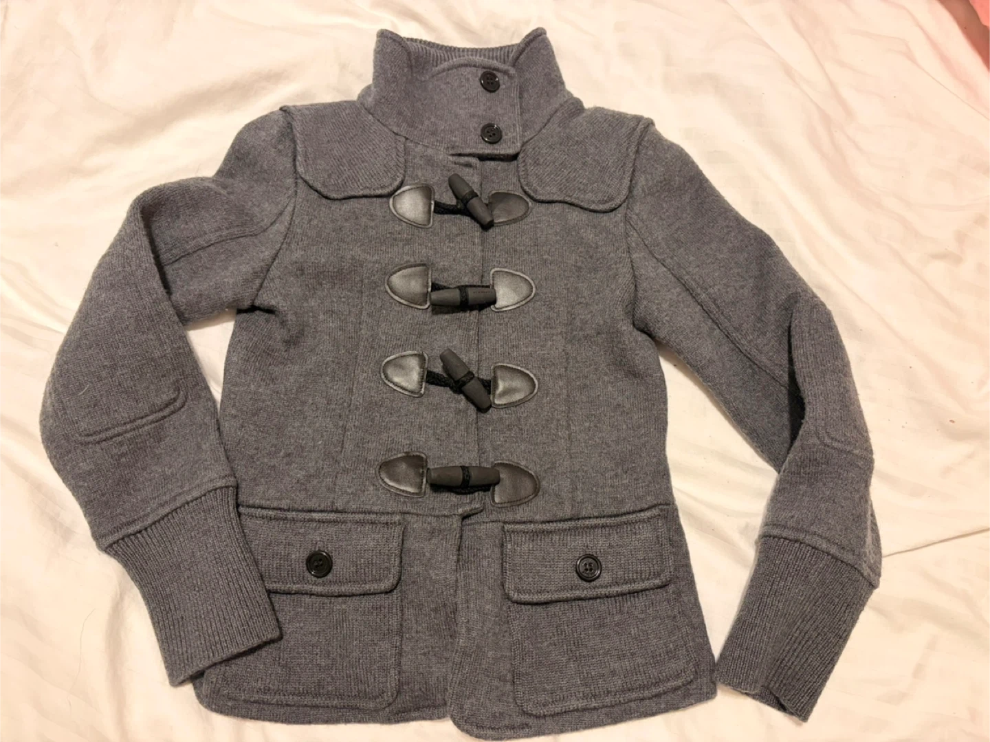 Selling a gently used Burberry children's jacket. It's made of 100% merino wool, perfect for keeping your little one warm and stylish! It's a lovely grey colour and in great condition.