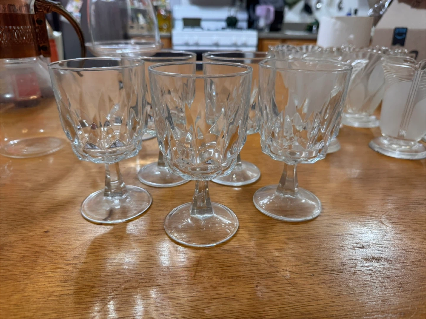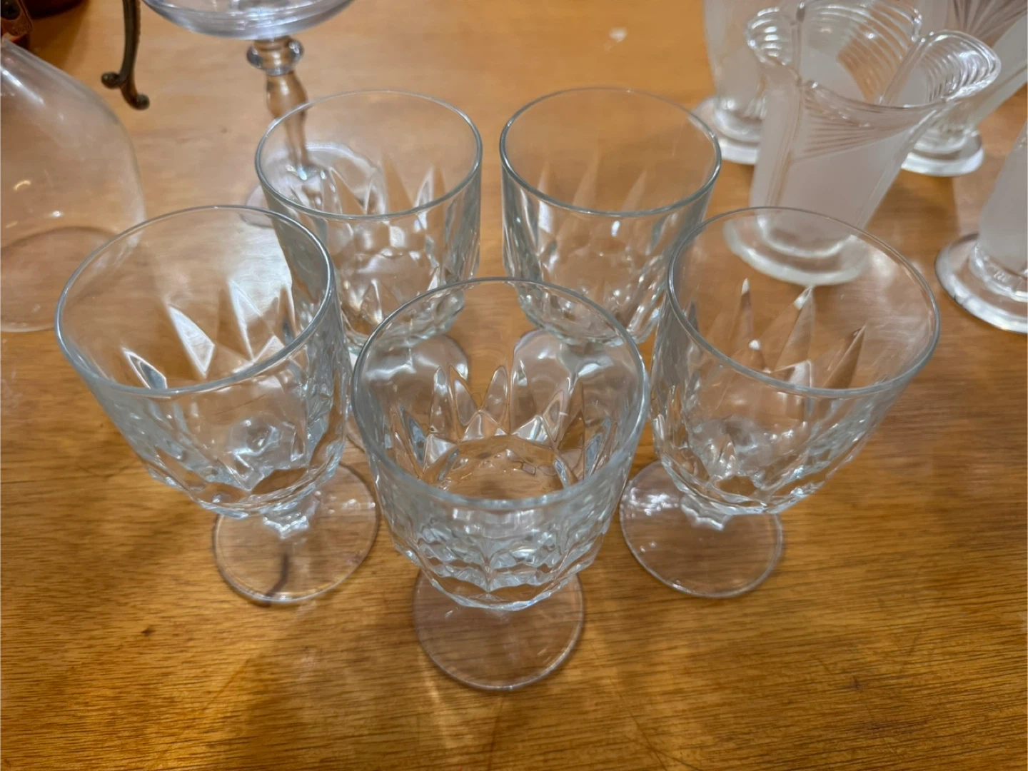 Selling a set of 5 clear glass wine glasses! These are in great condition and ready to be used for your next dinner party or casual get-together. They have a lovely textured design that catches the light beautifully. Perfect for any wine enthusiast!
