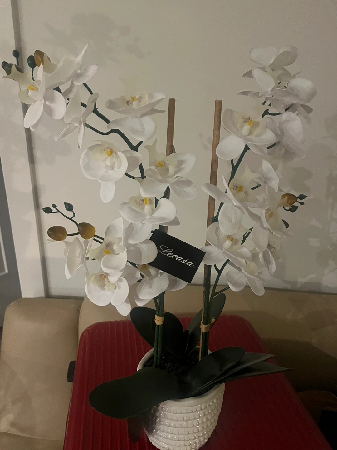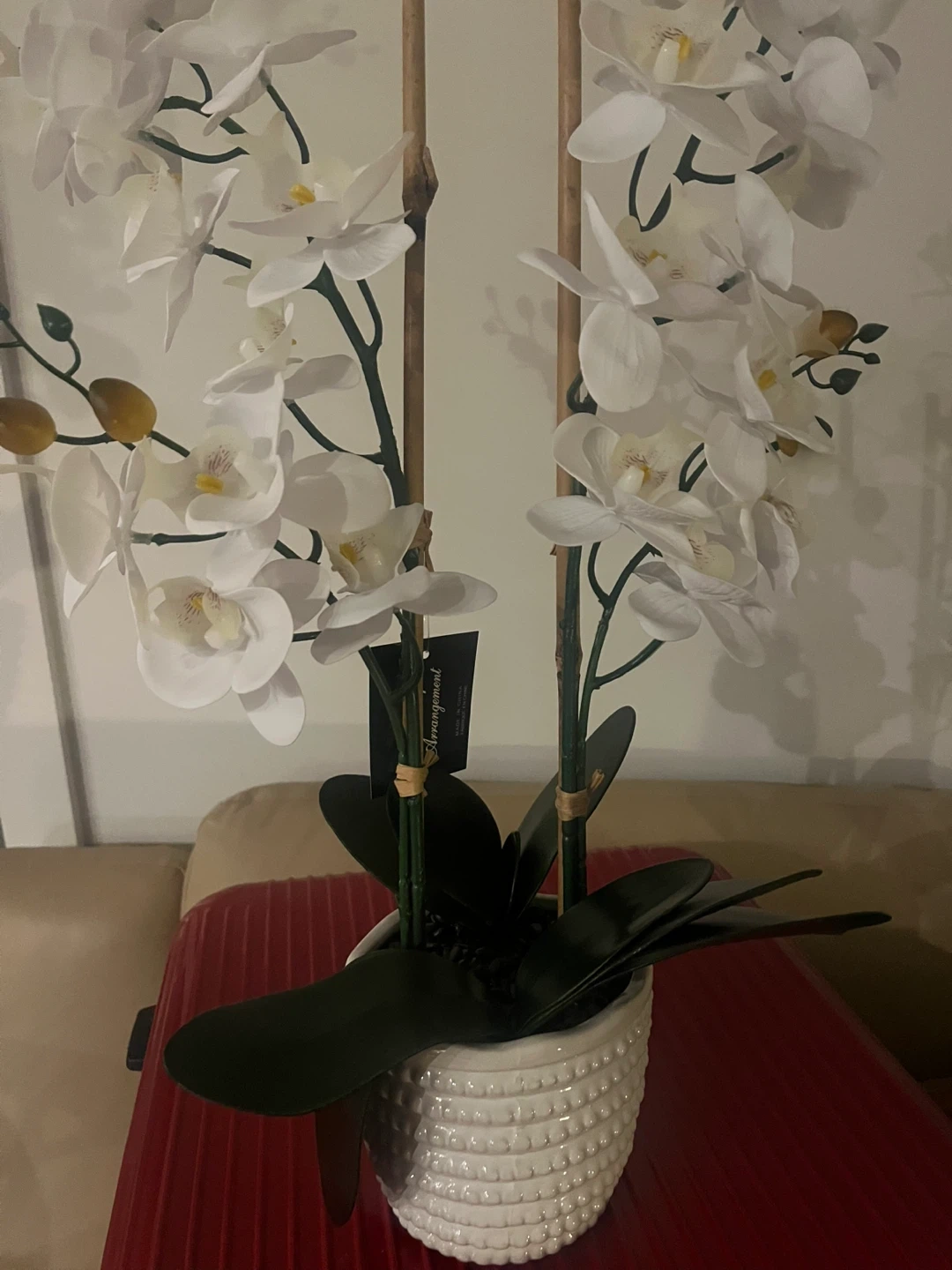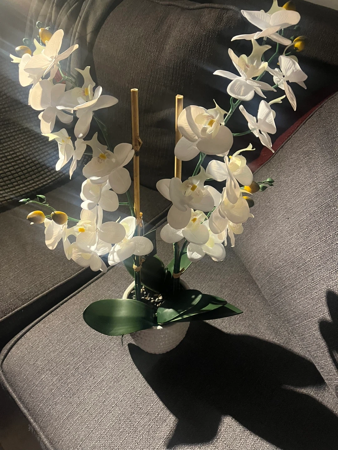 Selling a lovely Decasa artificial orchid arrangement! It features beautiful white flowers and would make a great addition to any room