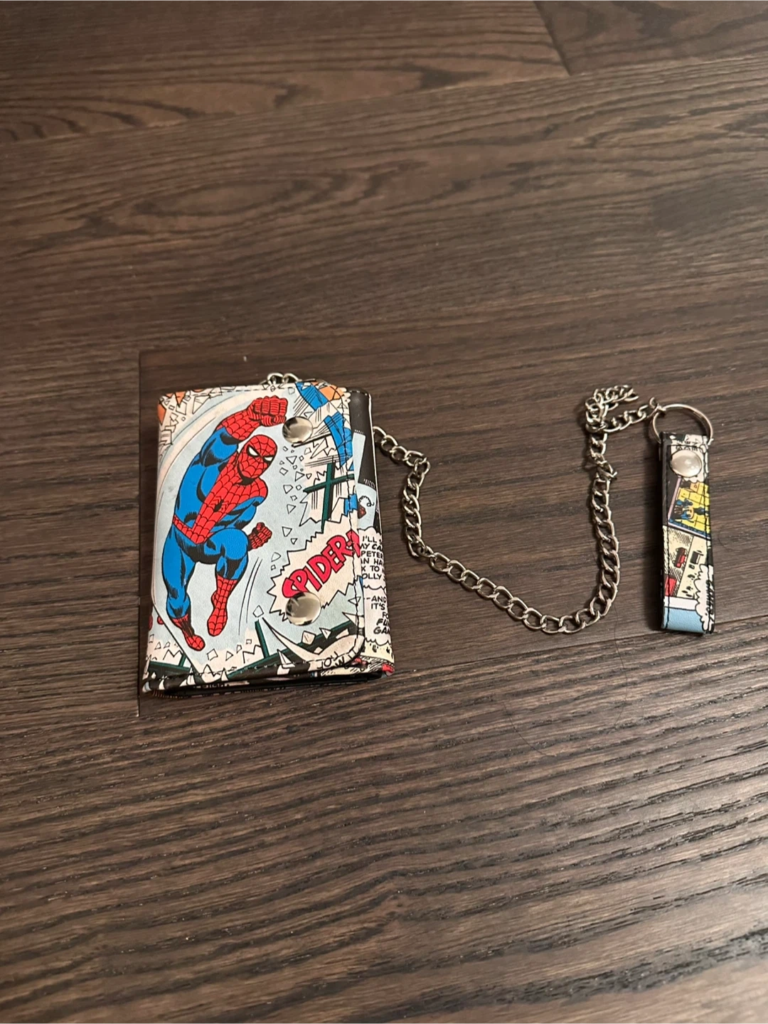 Check out this awesome Spider-Man comic print wallet! It's a tri-fold style with a chain and wrist strap. Perfect for any Marvel fan!