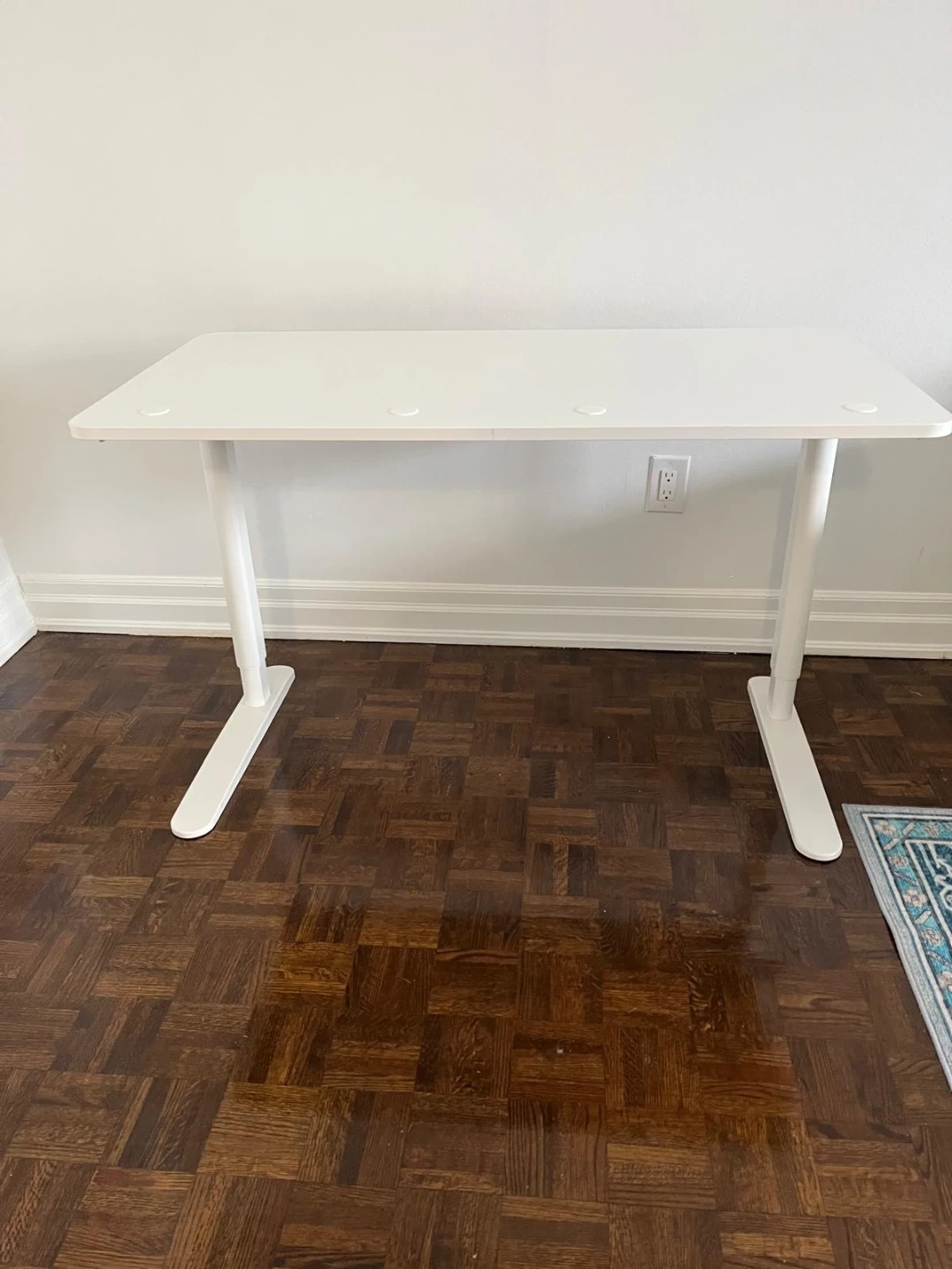 Selling a white IKEA Skarsta standing desk! It's in great condition and ready to help you work comfortably from home. The height is easily adjustable with a hand crank, so you can switch between sitting and standing throughout the day. Perfect for a home office or study space. 4 months old.