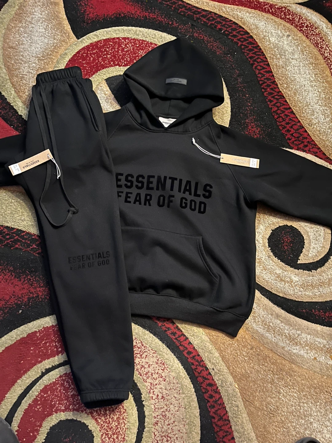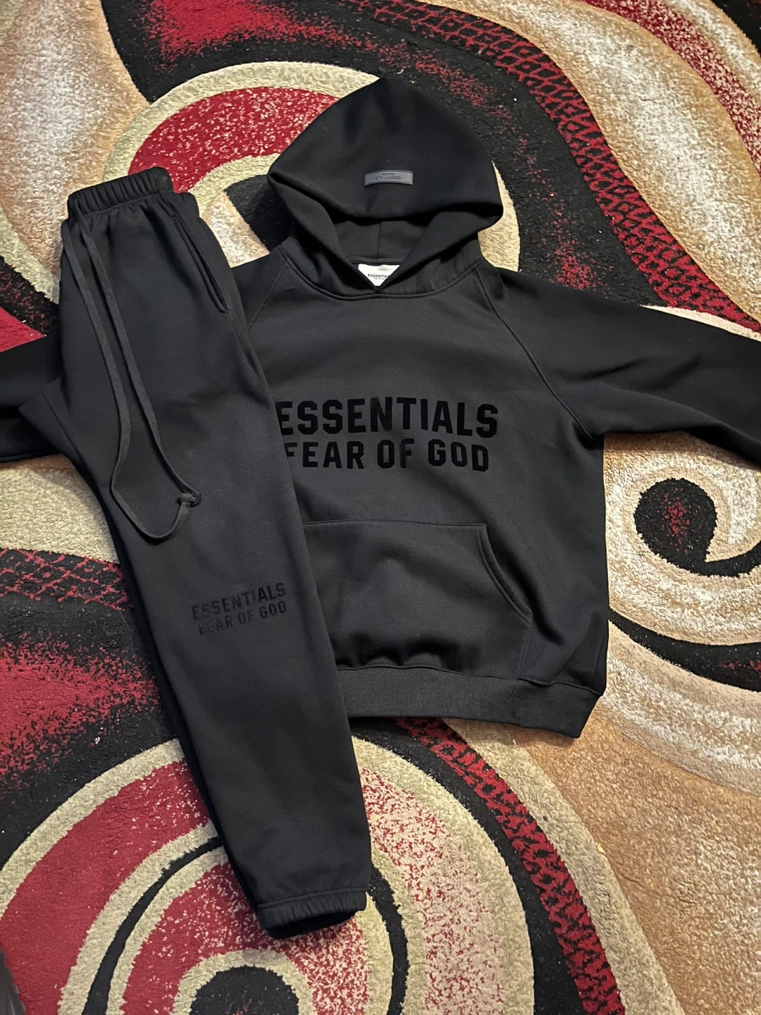 Selling a matching black hoodie and sweatpants set from Essentials Fear of God! The set features the brand's name prominently displayed on both pieces. Perfect for a comfy and stylish look!