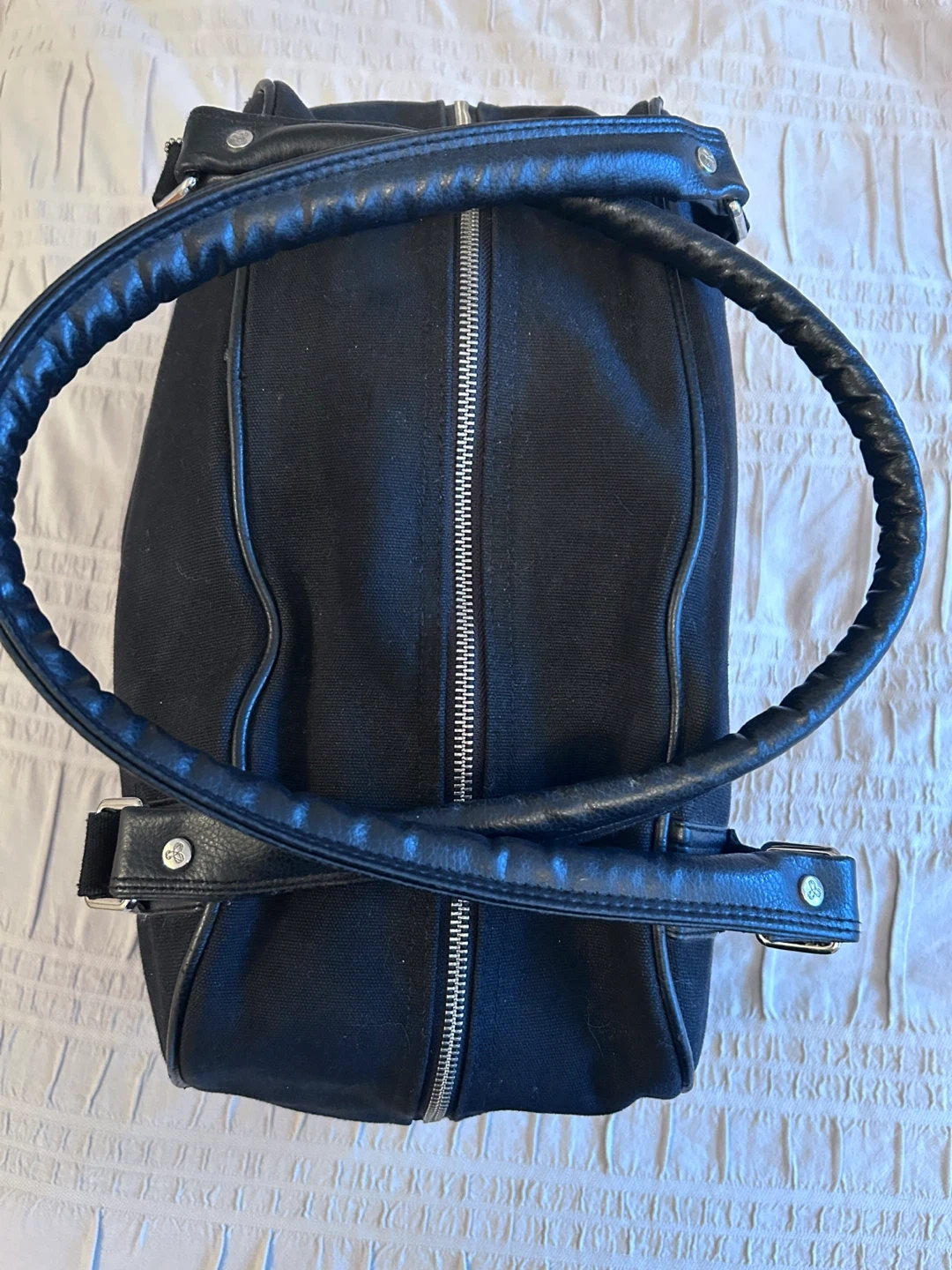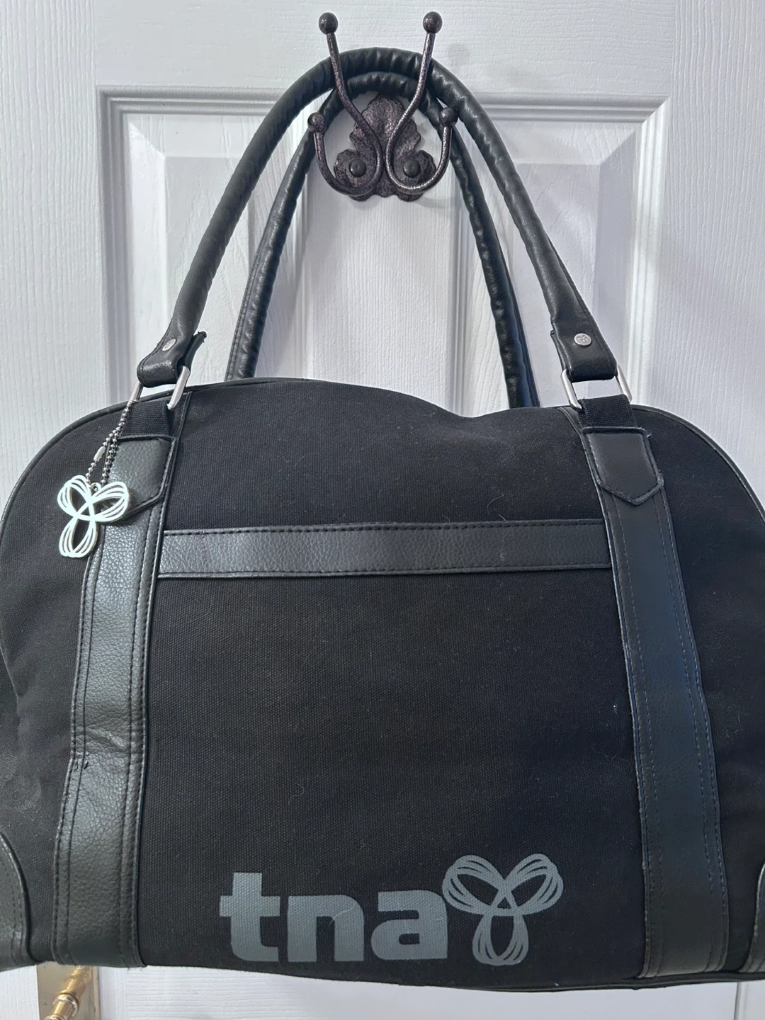 Selling a black duffle bag from TNA. It's in very good condition and perfect for the gym or a weekend getaway! It's a stylish and practical bag.