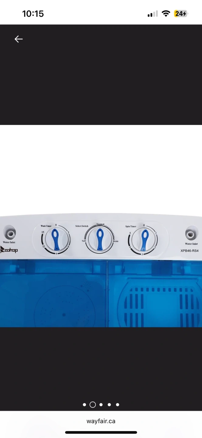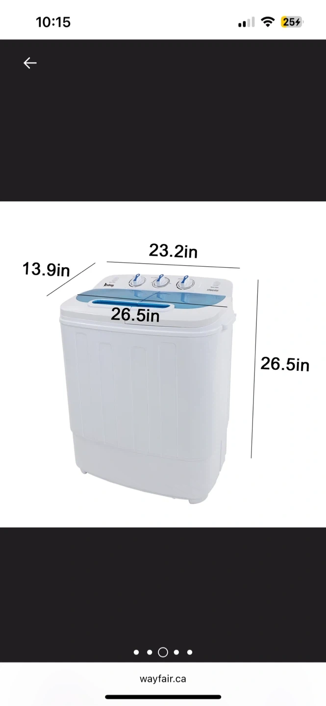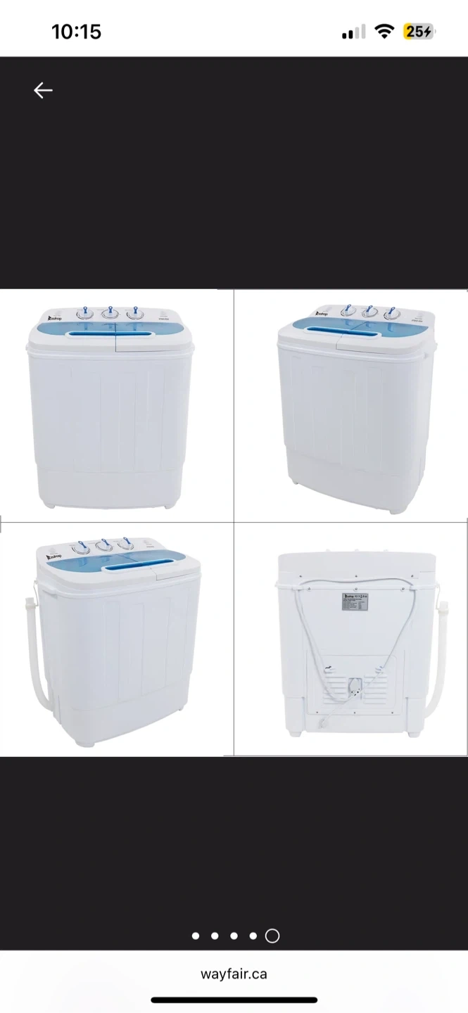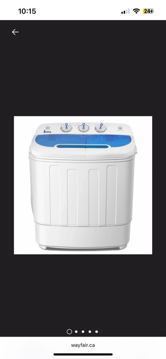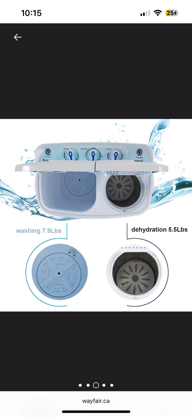 Looking to sell this portable washing machine. It features a twin tub design with separate compartments for washing (7.9 lbs) and dehydration (5.5 lbs).