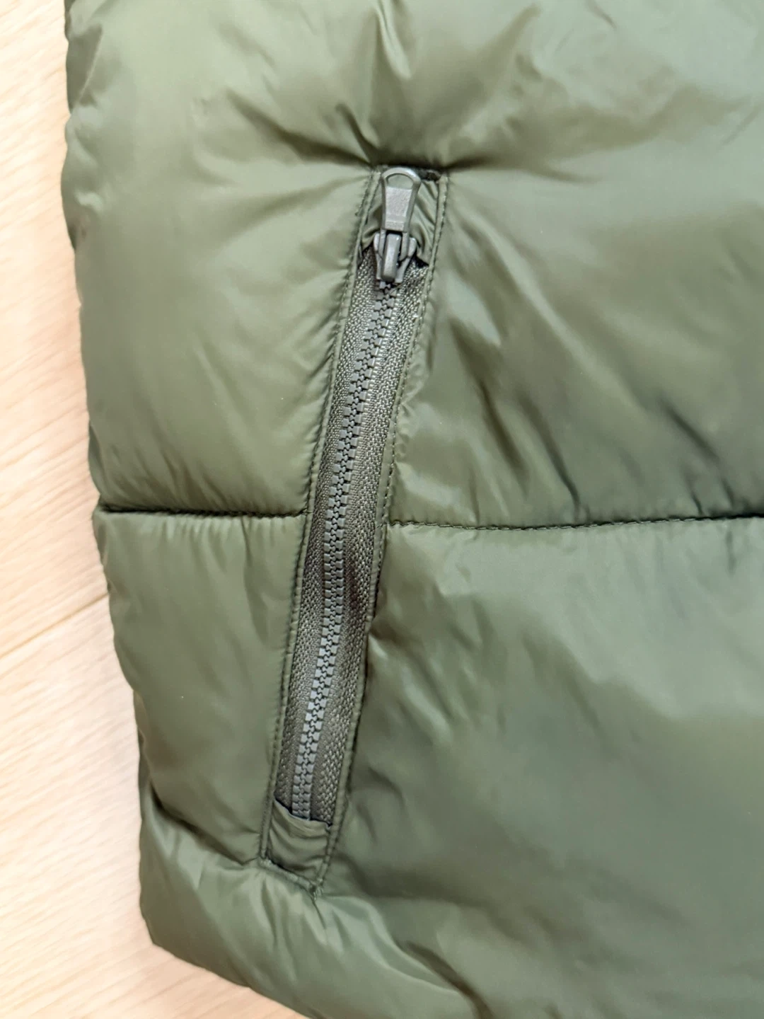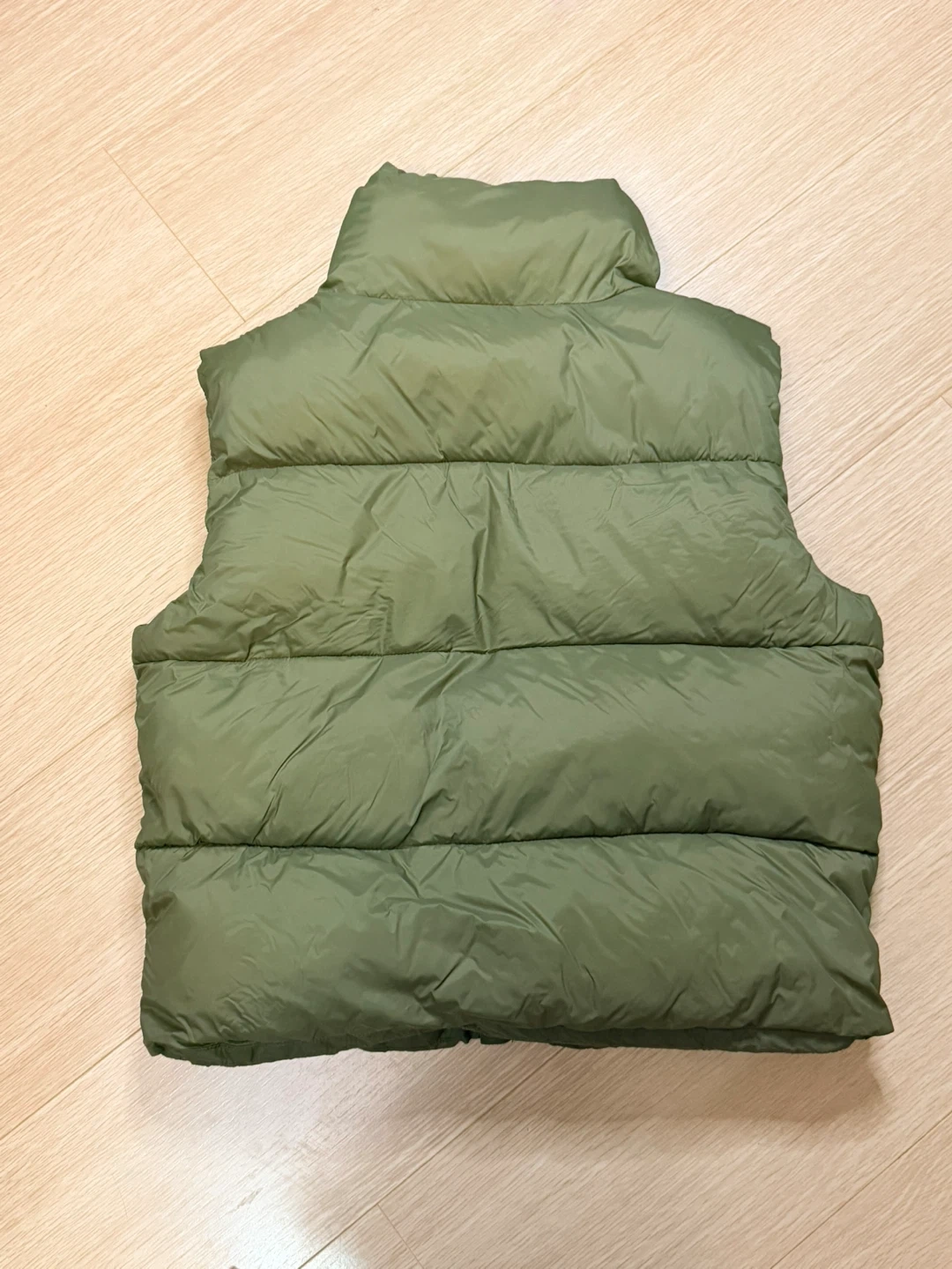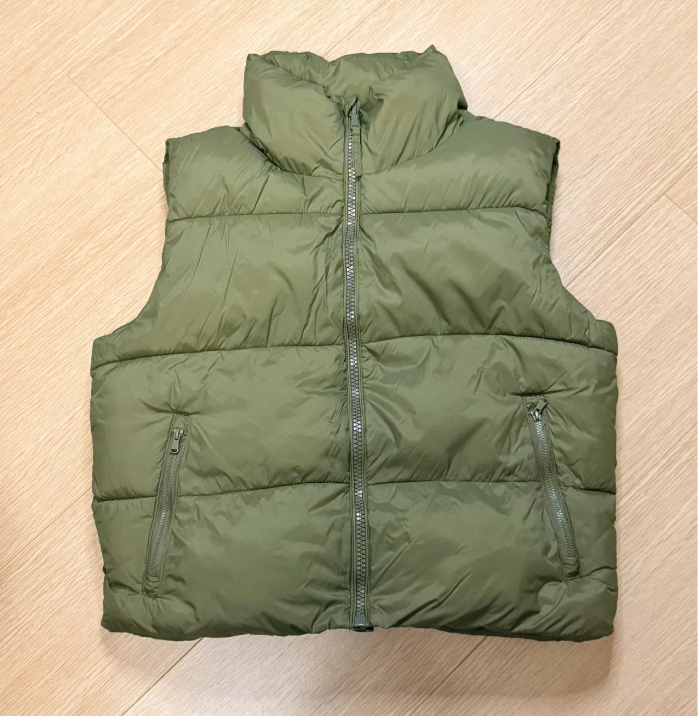 Here's an Old Navy puffer vest in a size medium! It's a nice olive green colour and is water-resistant. Perfect for layering during the cooler months