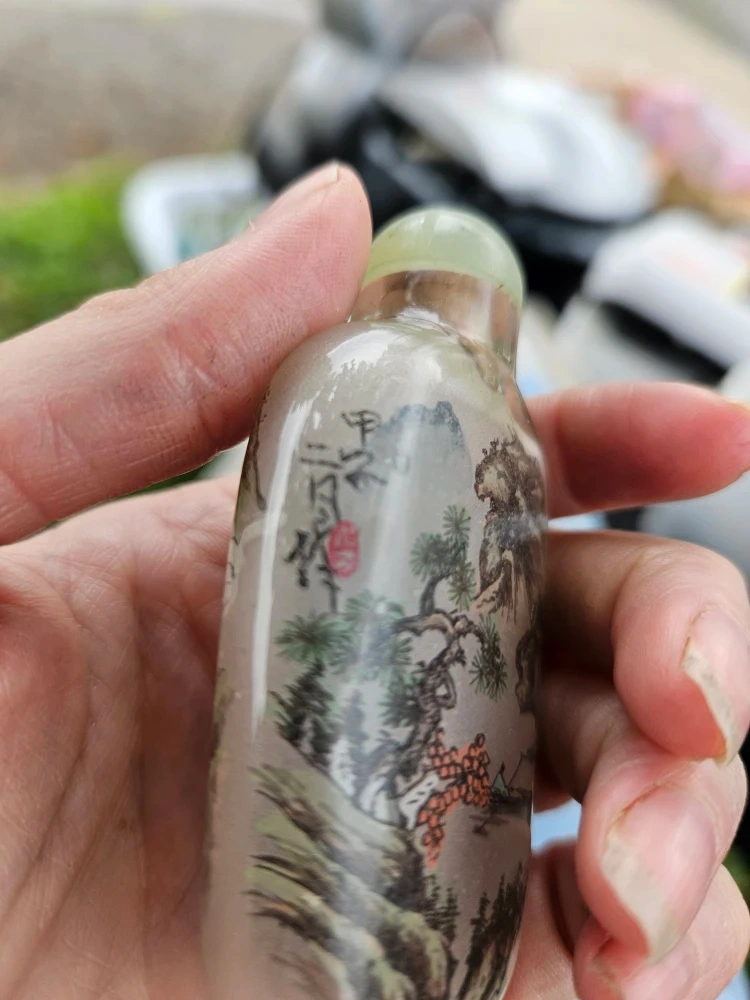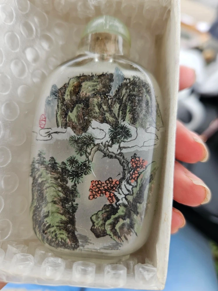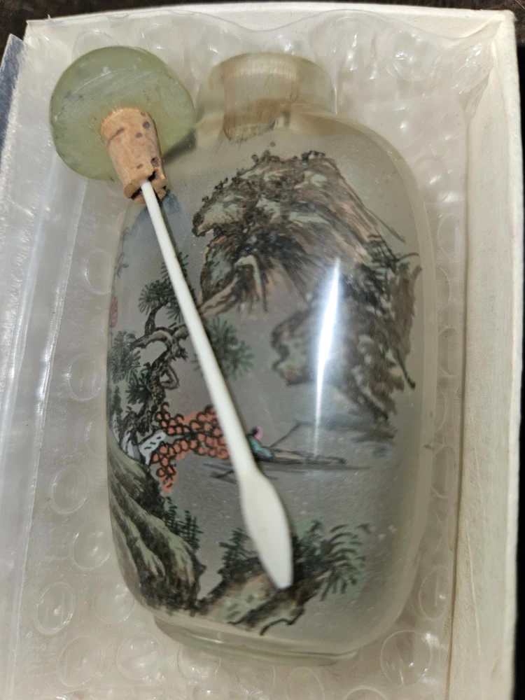 Selling a vintage Chinese Reverse painted bottle with a beautiful landscape design. It comes with a spoon and a cork. The bottle is in great condition and comes with its original box