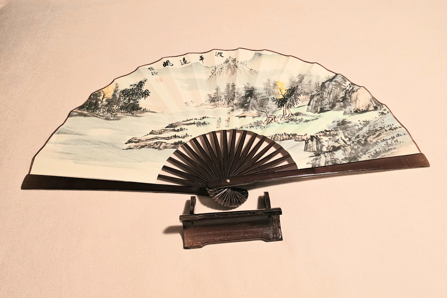 Gorgeous large 36.5" vintage Chinese hand painted fan. The fan features a beautiful delicate landscape painting with calligraphy on paper over bamboo frame. It's a unique piece of art that would look great in any home displayed on a wall or on its own wooden stand. Excellent Condition $40