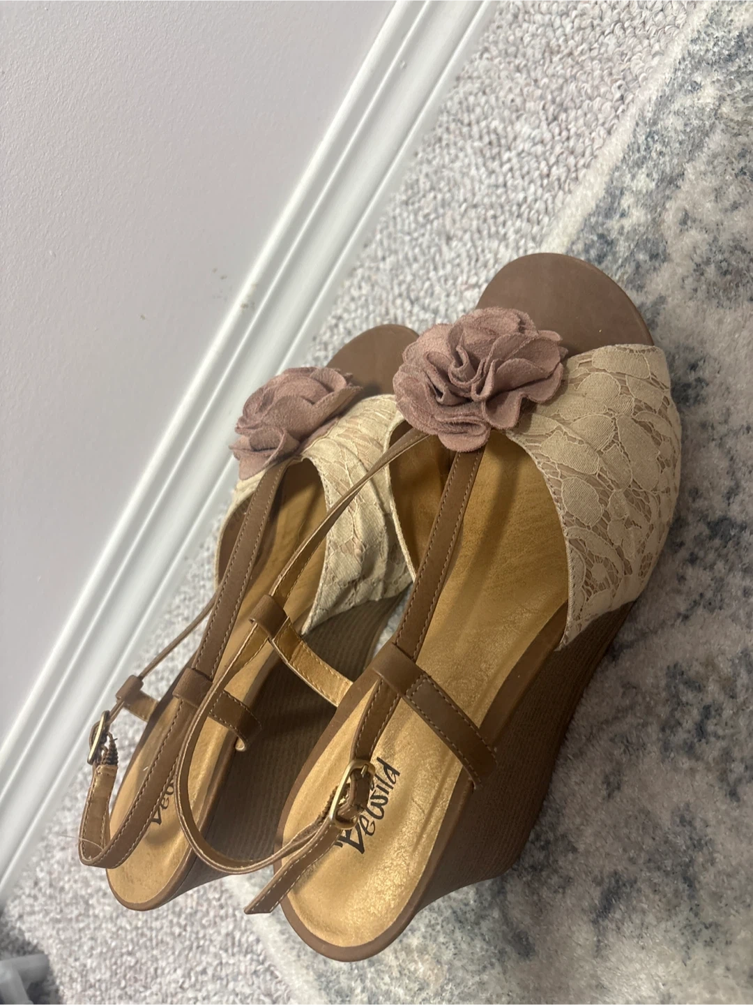 Cute pair of Be Wild wedge sandals! They feature a brown and beige colour scheme with a floral accent. Perfect for adding a touch of elegance to your summer outfits pick up cash only