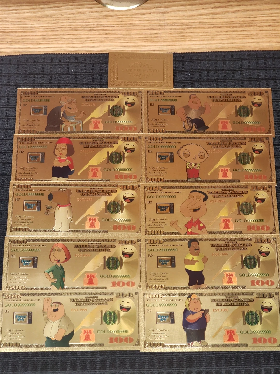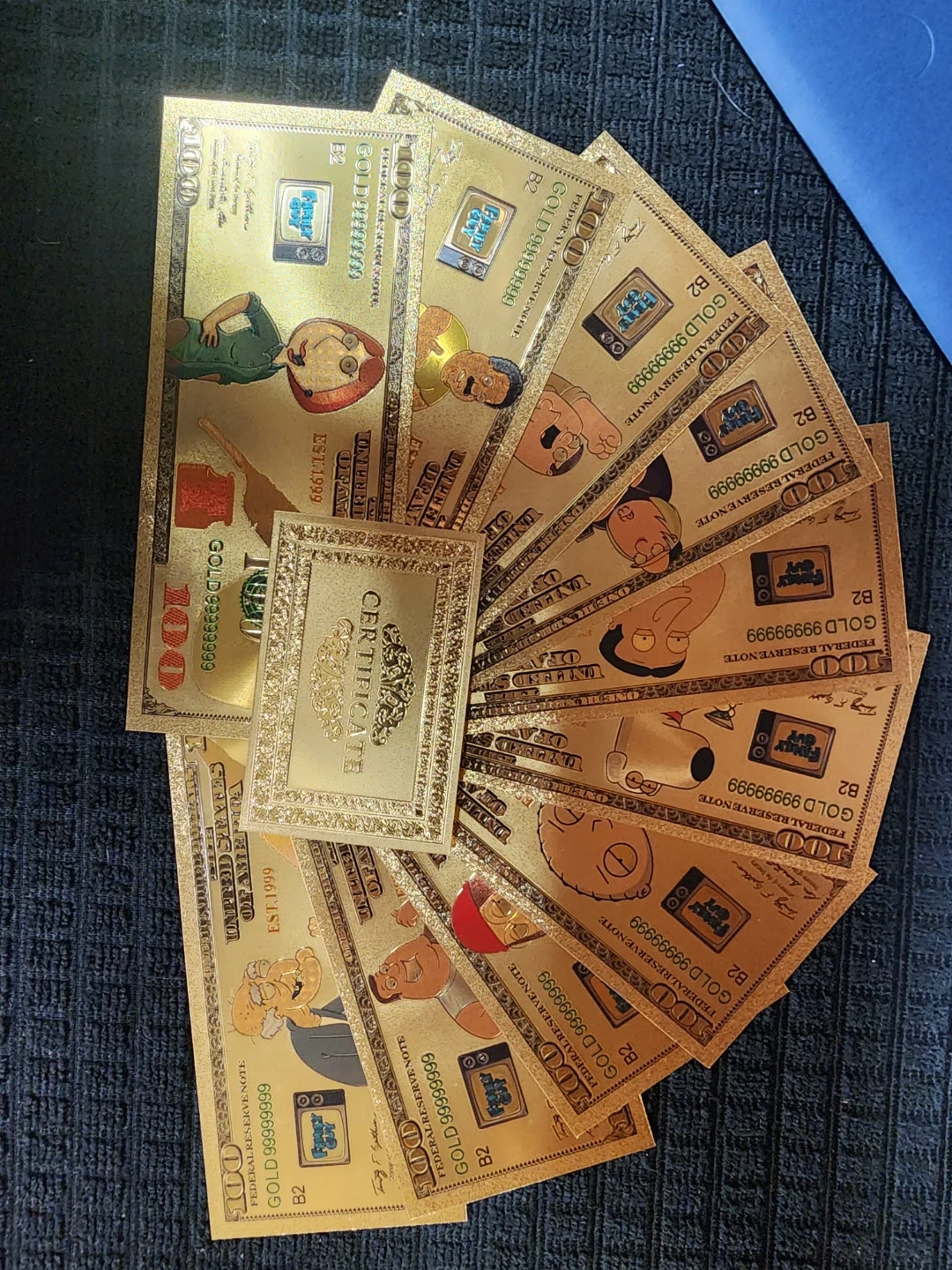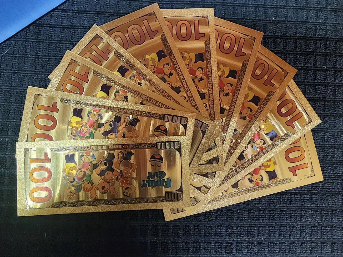 Buy & SellFamily Guy Gold Plated $100 BillsFamily Guy Gold Plated $100 Bills$60Selling a set of Family Guy gold plated $100 bills! Each bill features a different character from the show. A certificate is also included!WHERE TO MEETCheck LocationView MapSELLERverifiedTjMaillardville1256 reviews1 chats·0 favorites·59 viewsSEND CHAT TO SELLERHi Tj! I’m interested in your listing.Hi Tj! I’m interested in your listing.Get the Karrot app to chatSign In to chat