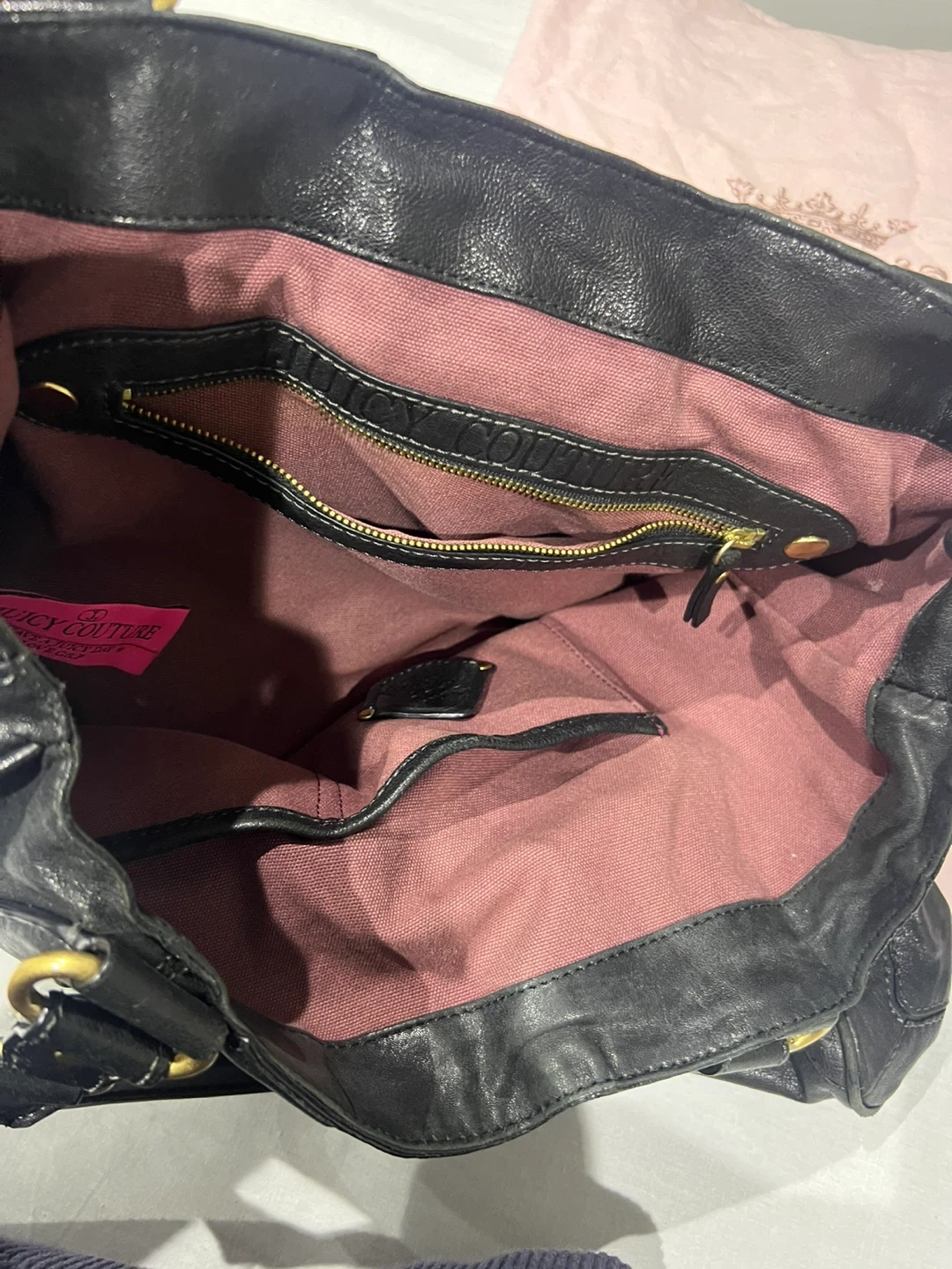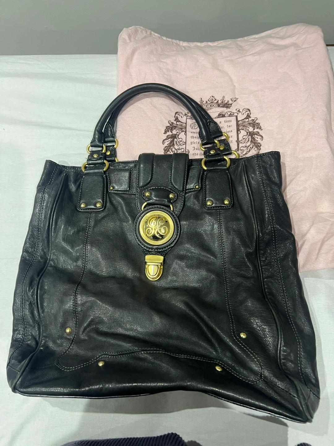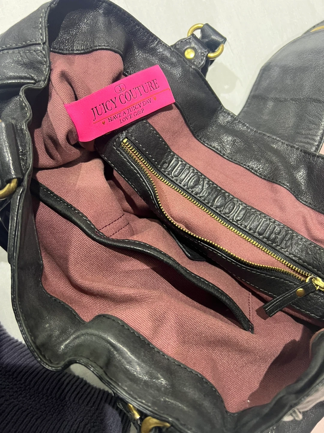 Check out this stylish Juicy Couture black leather tote bag! It's in good condition and ready for a new owner. Perfect for everyday use or a night out