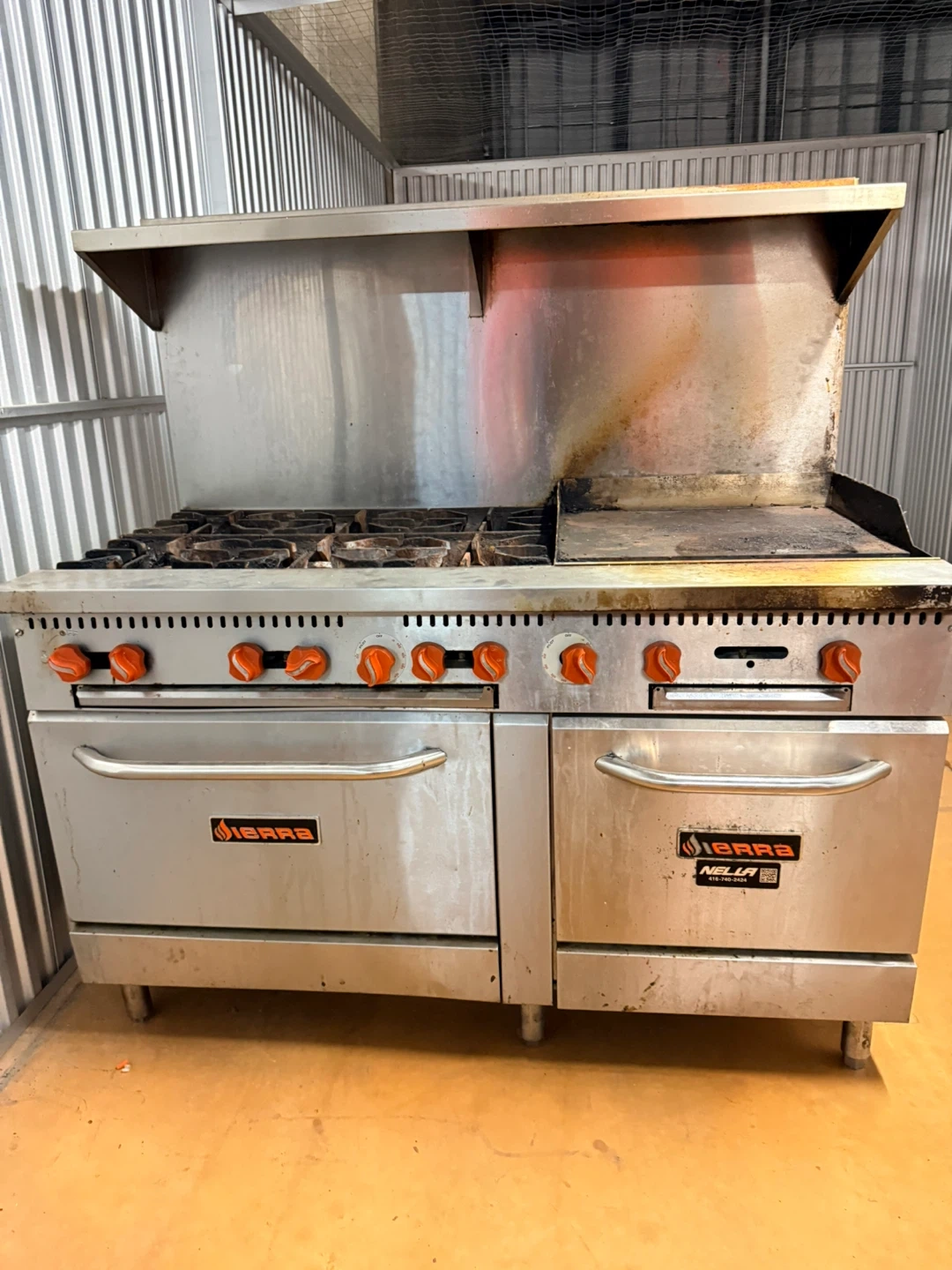 6 burner Sierra commercial range oven, perfect for a restaurant or catering business. It has some signs of use, but is in good working condition. Ready to go!